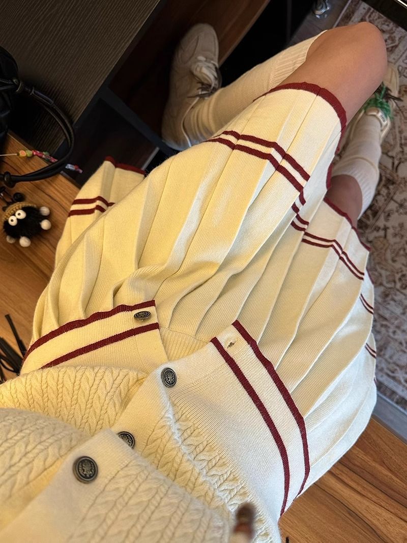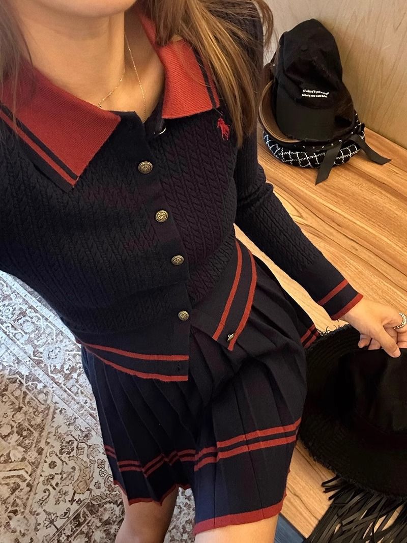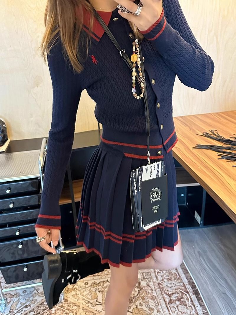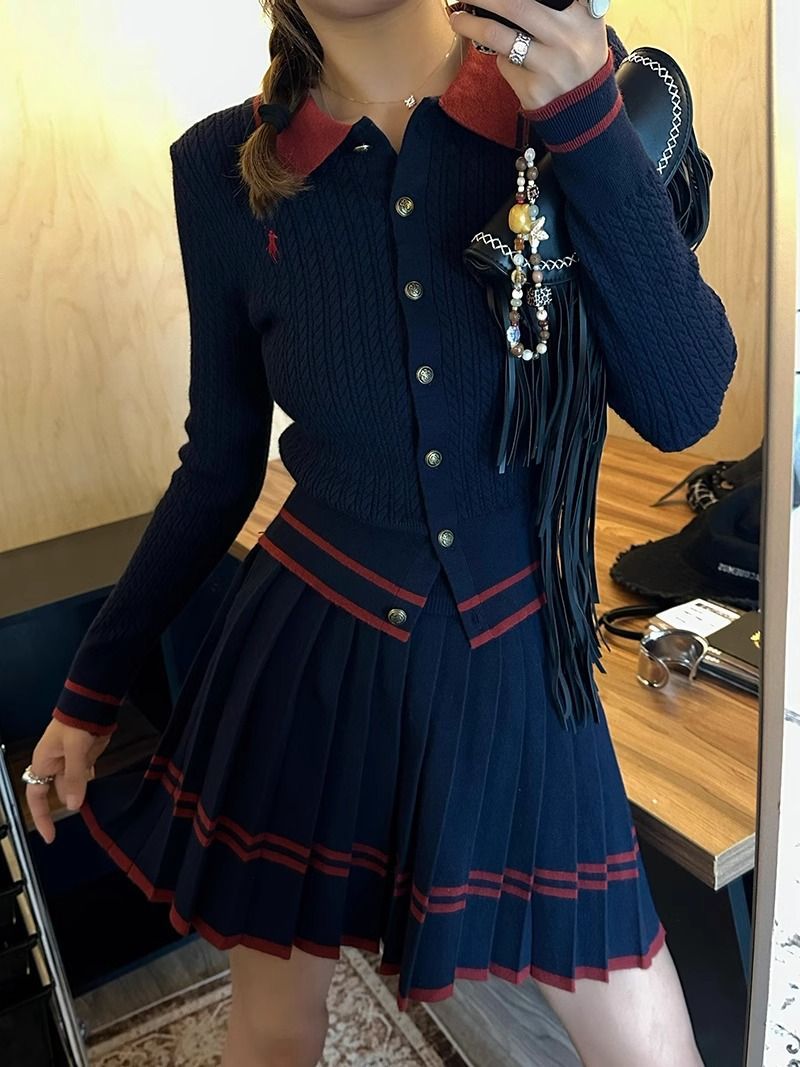 치마 투피스 세트 여성 2025 봄 옷깃 카디건 탑 주름 치마 순수한 욕망 아카데미 스타일 니트웨어