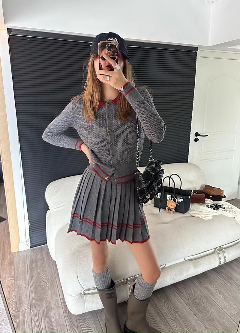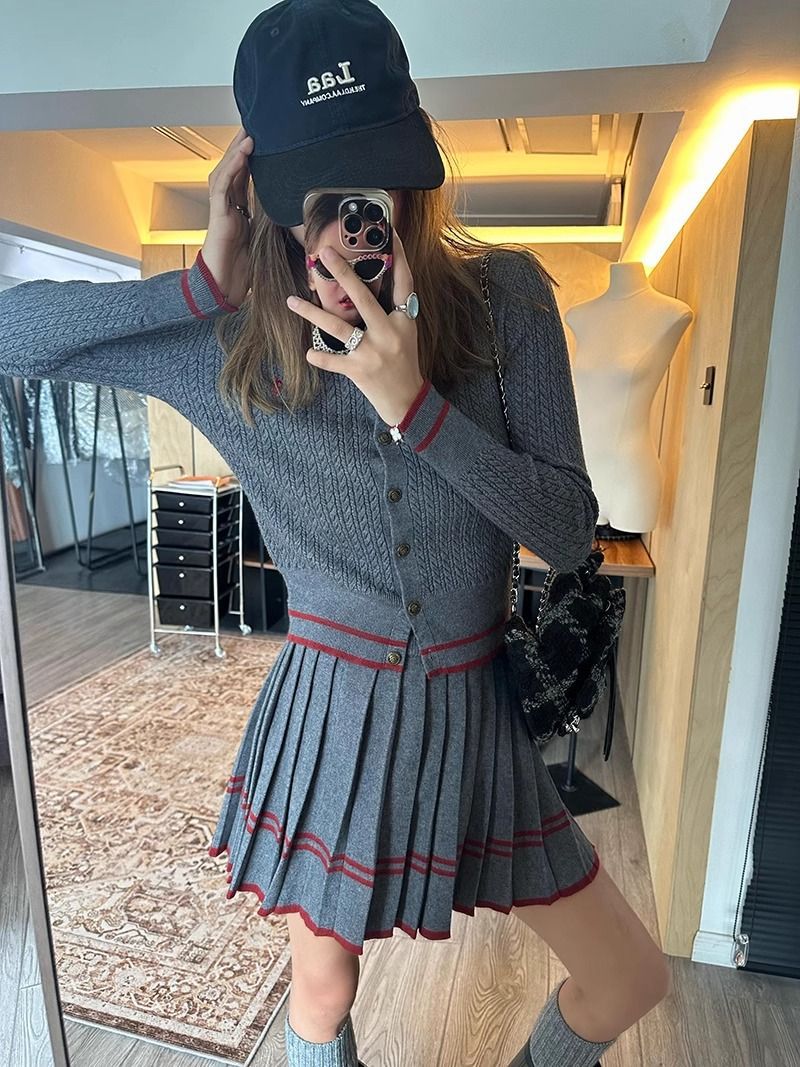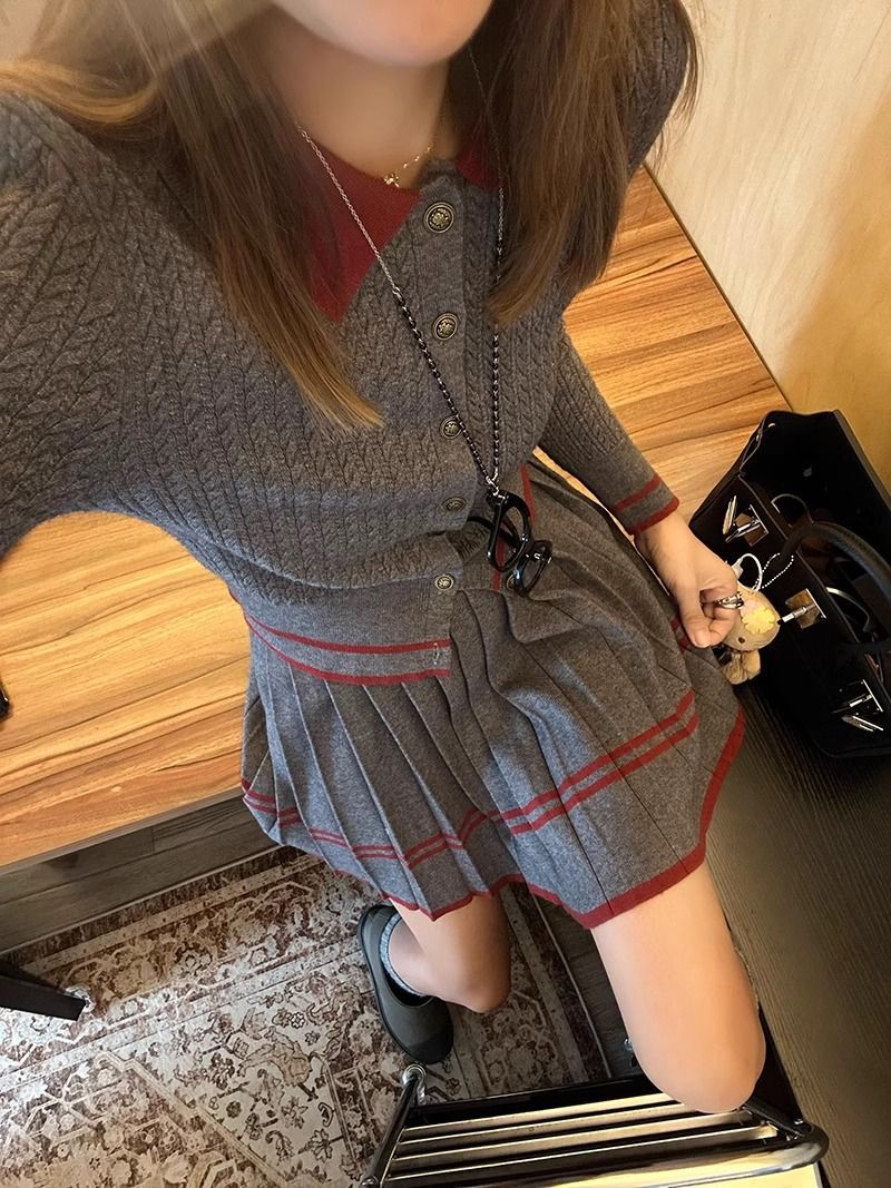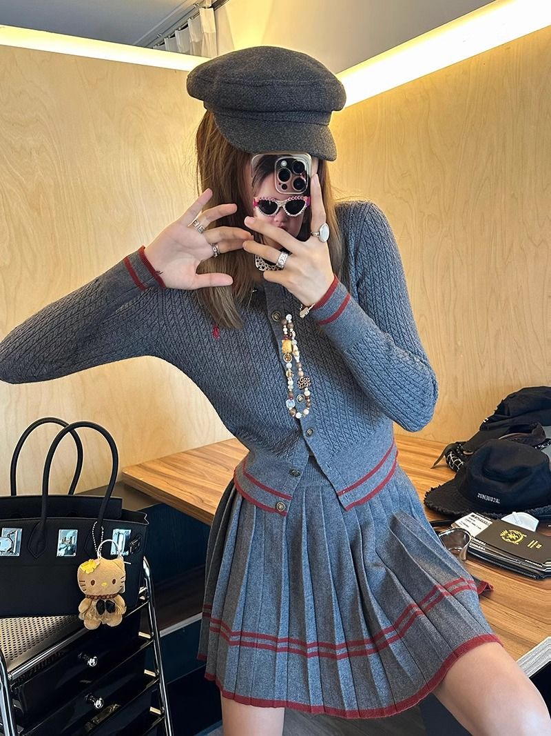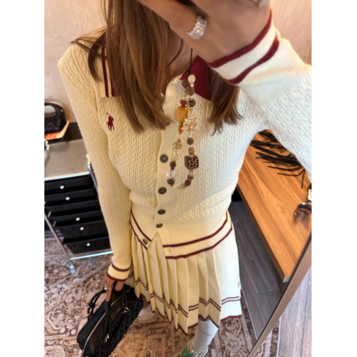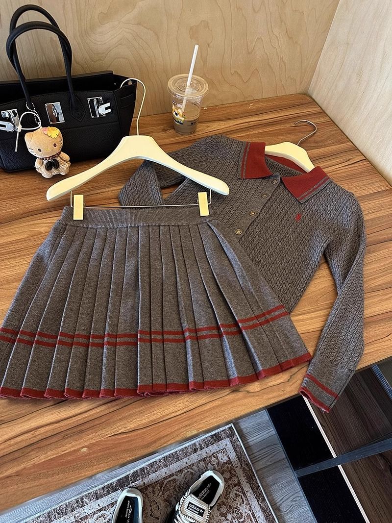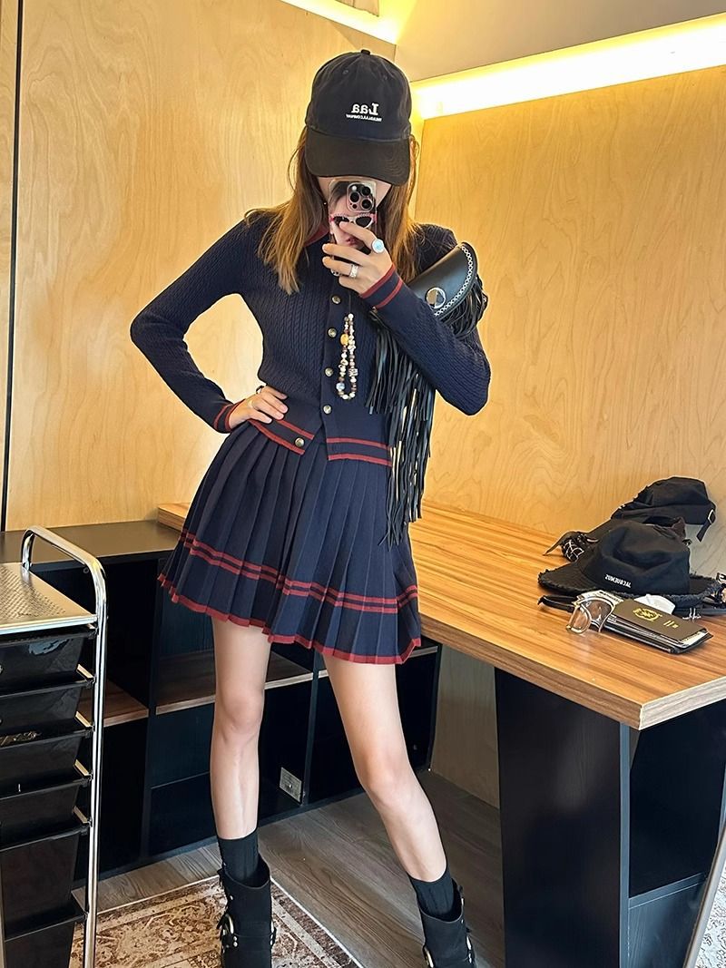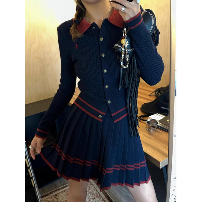 치마 투피스 세트 여성 2025 봄 옷깃 카디건 탑 주름 치마 순수한 욕망 아카데미 스타일 니트웨어스토어 가기