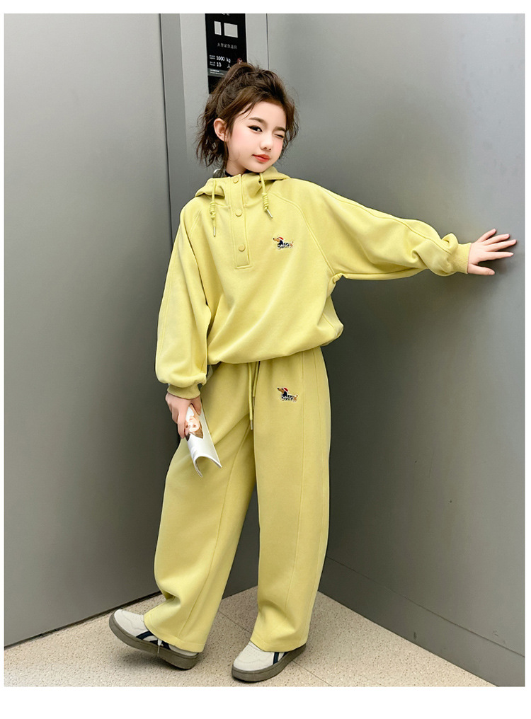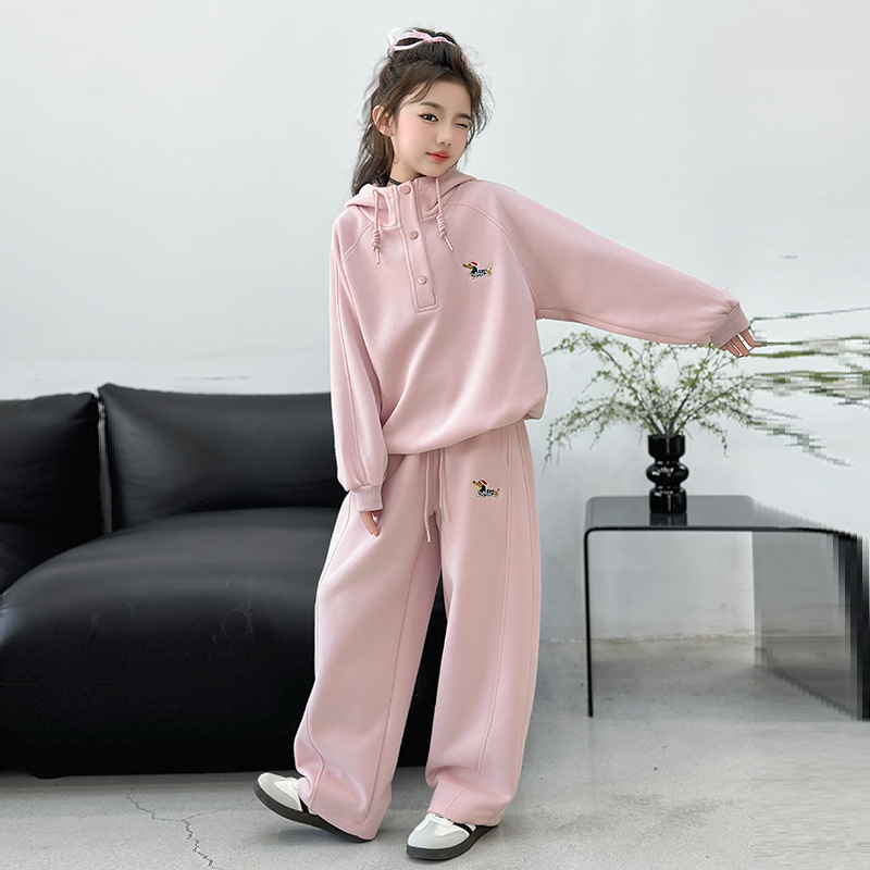 소녀의 봄 가을 세트 2025 새로운 한국 중학생 후드 스웨터 캐주얼 스포츠 와이드 다리 바지 투피스 세트