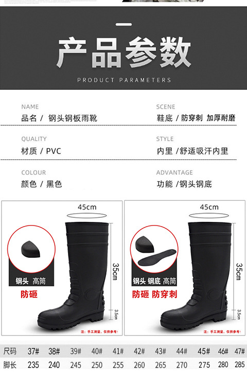 尺码偏大,建议选平时穿的小一码。脚肥脚宽选大一码。春秋款单鞋,不含棉。PVC加厚工矿靴。