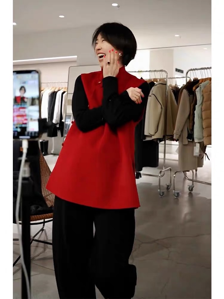 2025 신제품 이른 봄 오프닝 레드 울 양면 모직 조끼 여성을위한 새로운 중국 스타일 디자인 레드 스택 조끼스토어 가기