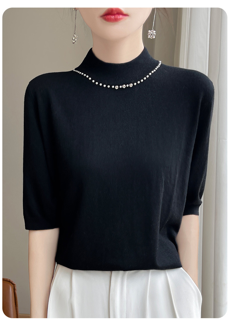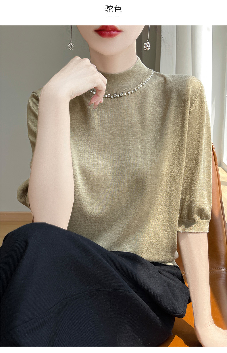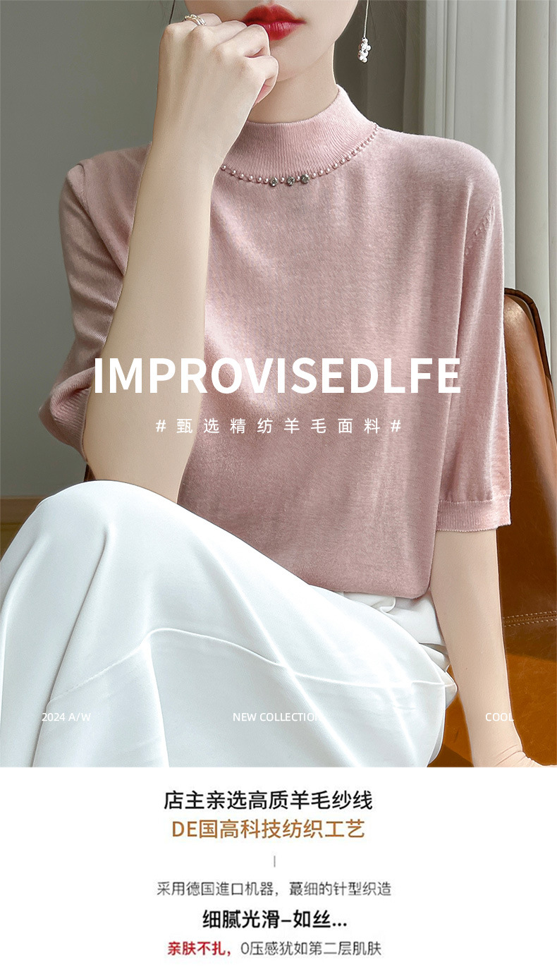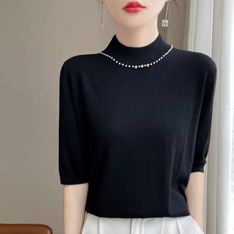 가벼운 럭셔리 니트 세미 하이 칼라 미드 슬리브 바닥 셔츠 여성의 봄과 가을 새로운 외국 스타일의 이너 하프 슬리브 탑 니트 도매스토어 가기