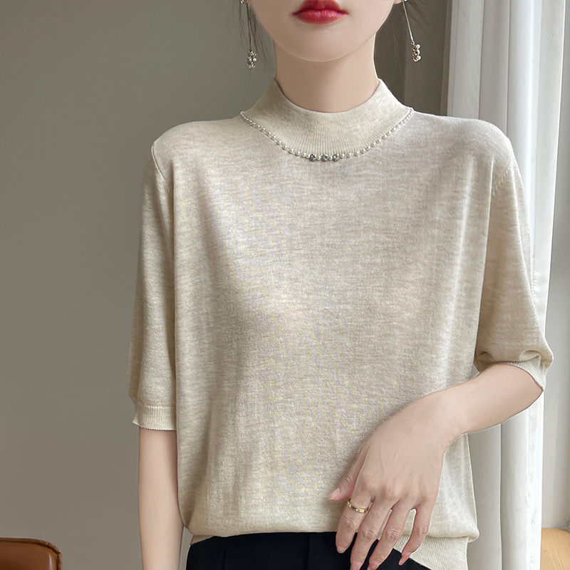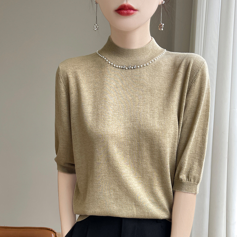 가벼운 럭셔리 니트 세미 하이 칼라 미드 슬리브 바닥 셔츠 여성의 봄과 가을 새로운 외국 스타일의 이너 하프 슬리브 탑 니트 도매