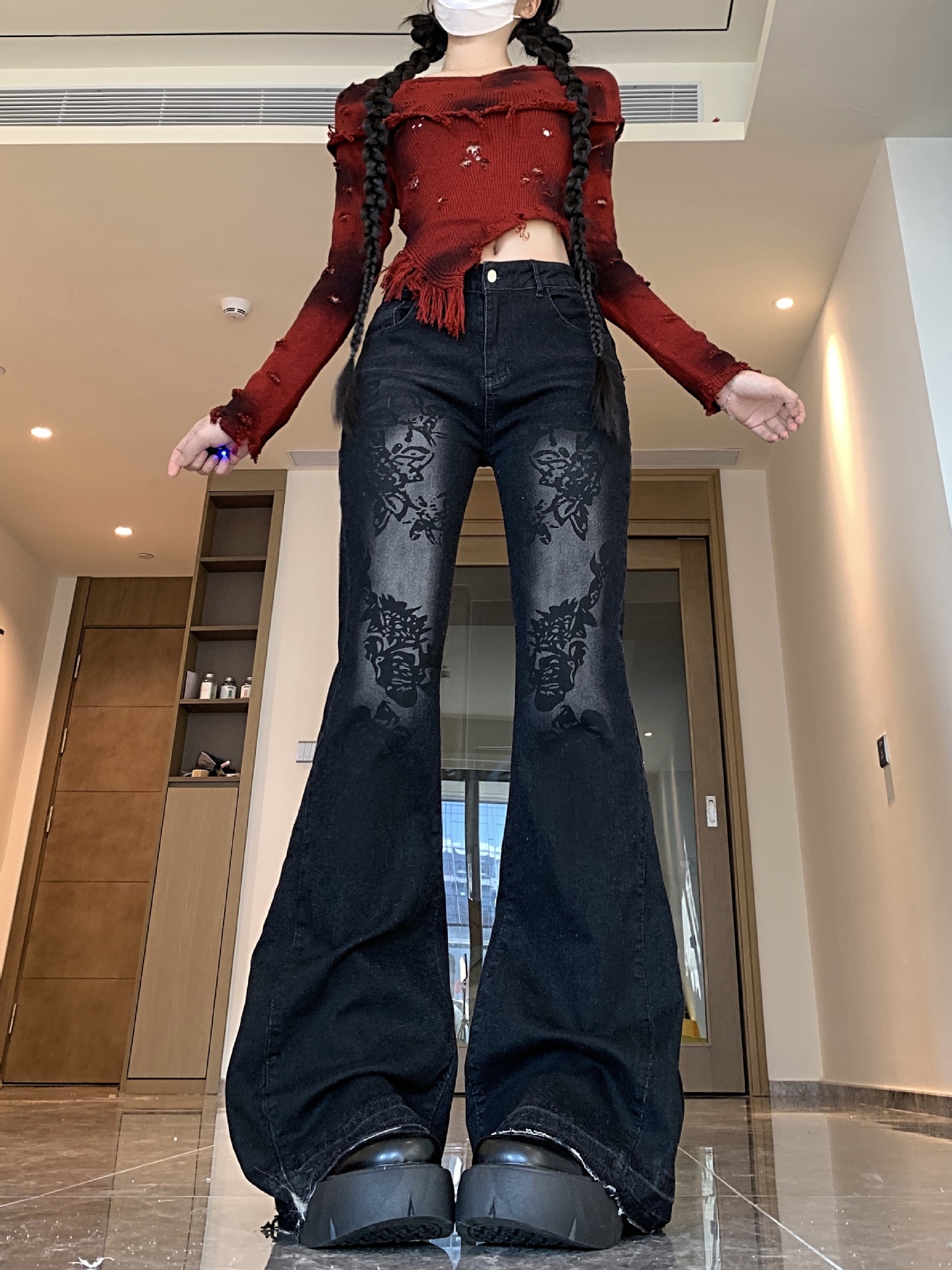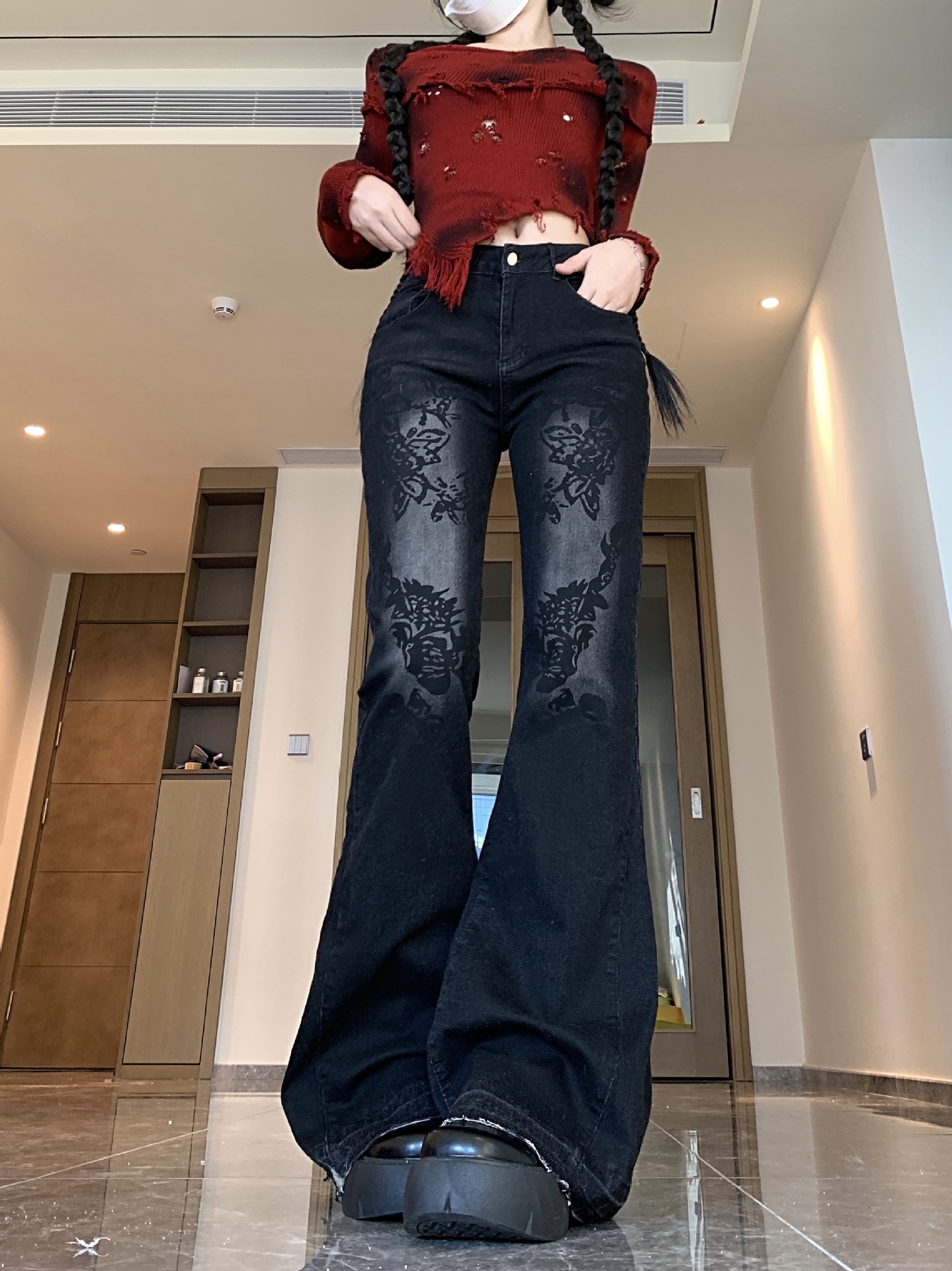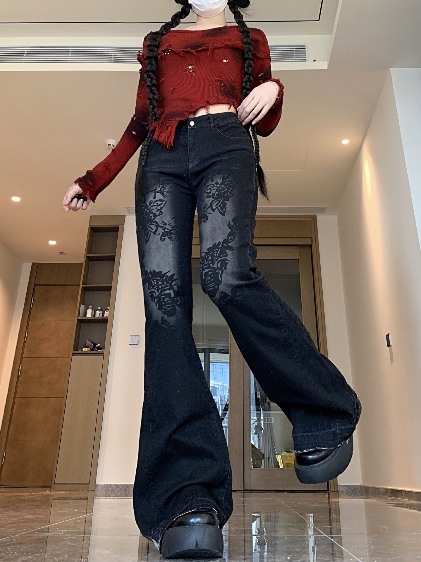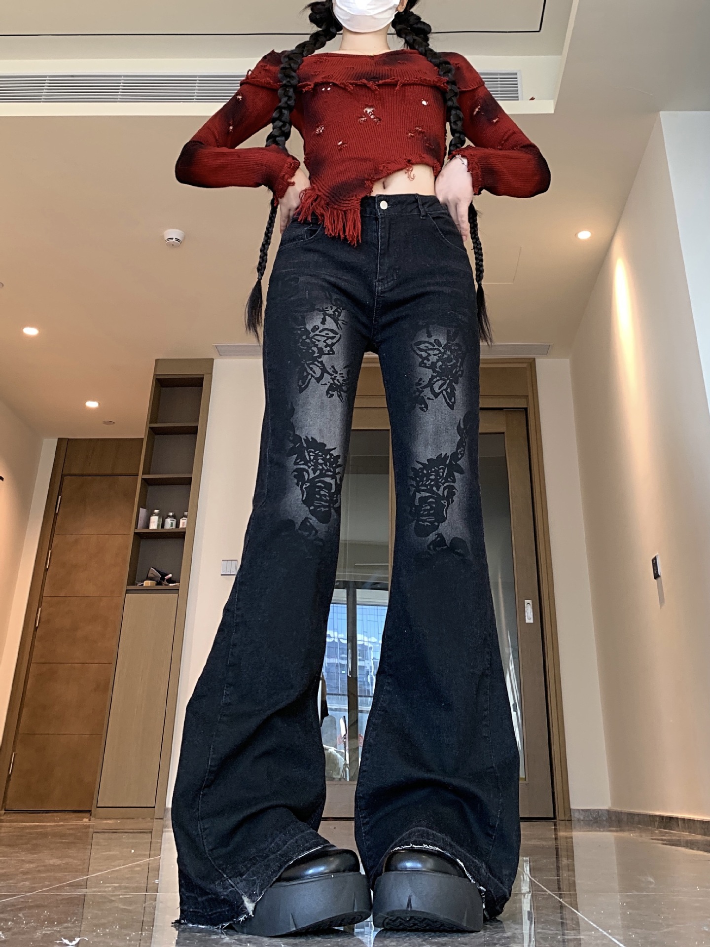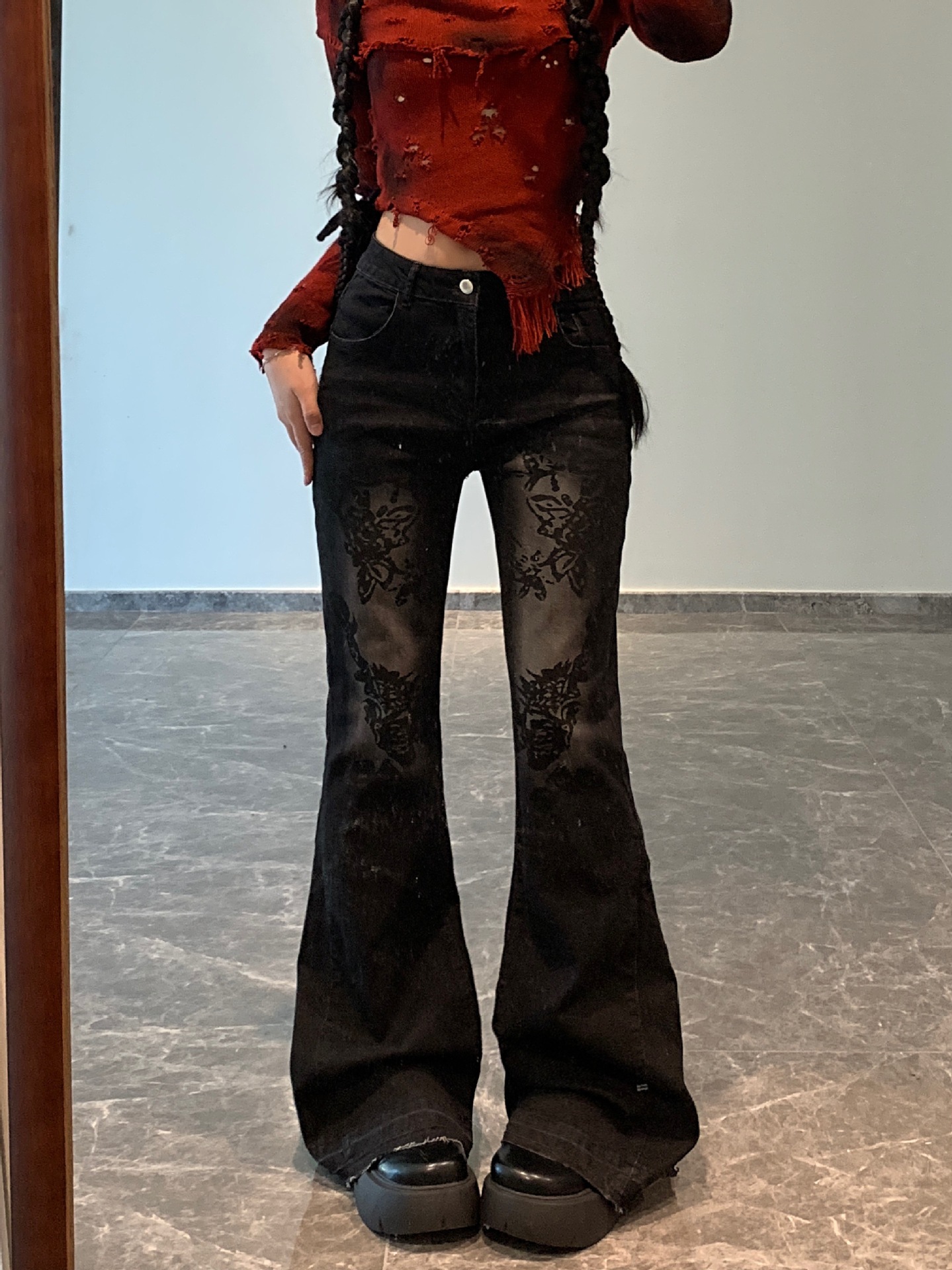2025 이른 봄 새로운 디자인 센스 유럽과 미국의 식물 인쇄 워시 낮은 허리 슬리밍 트렌디 플라 드 청바지스토어 가기