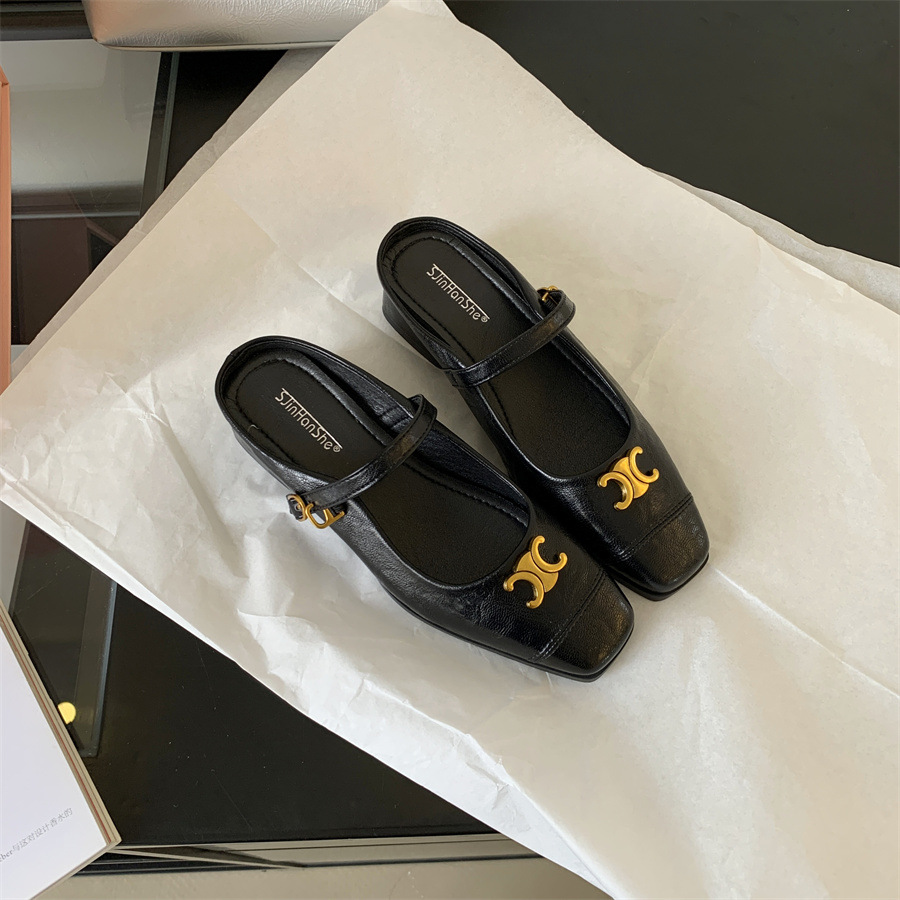 빈티지 메리 제인 신발 얕은 여성 신발 반 슬리퍼 2025 봄과 여름 새로운 금속 버클 두꺼운 힐 샌들스토어 가기