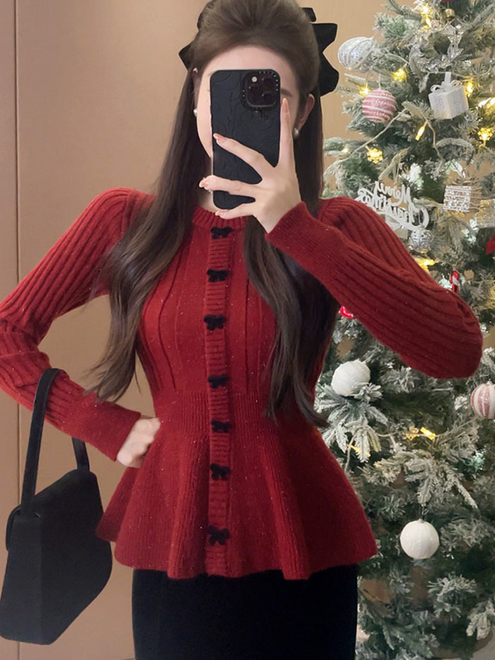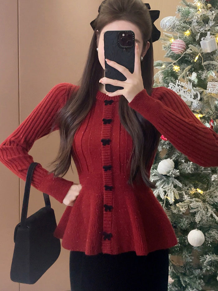 긴팔 풀오버 스웨터 가을과 겨울 새로운 허리 슬리밍 내베이스 셔츠 빨간 활 작은 향기로운 스타일 스웨터