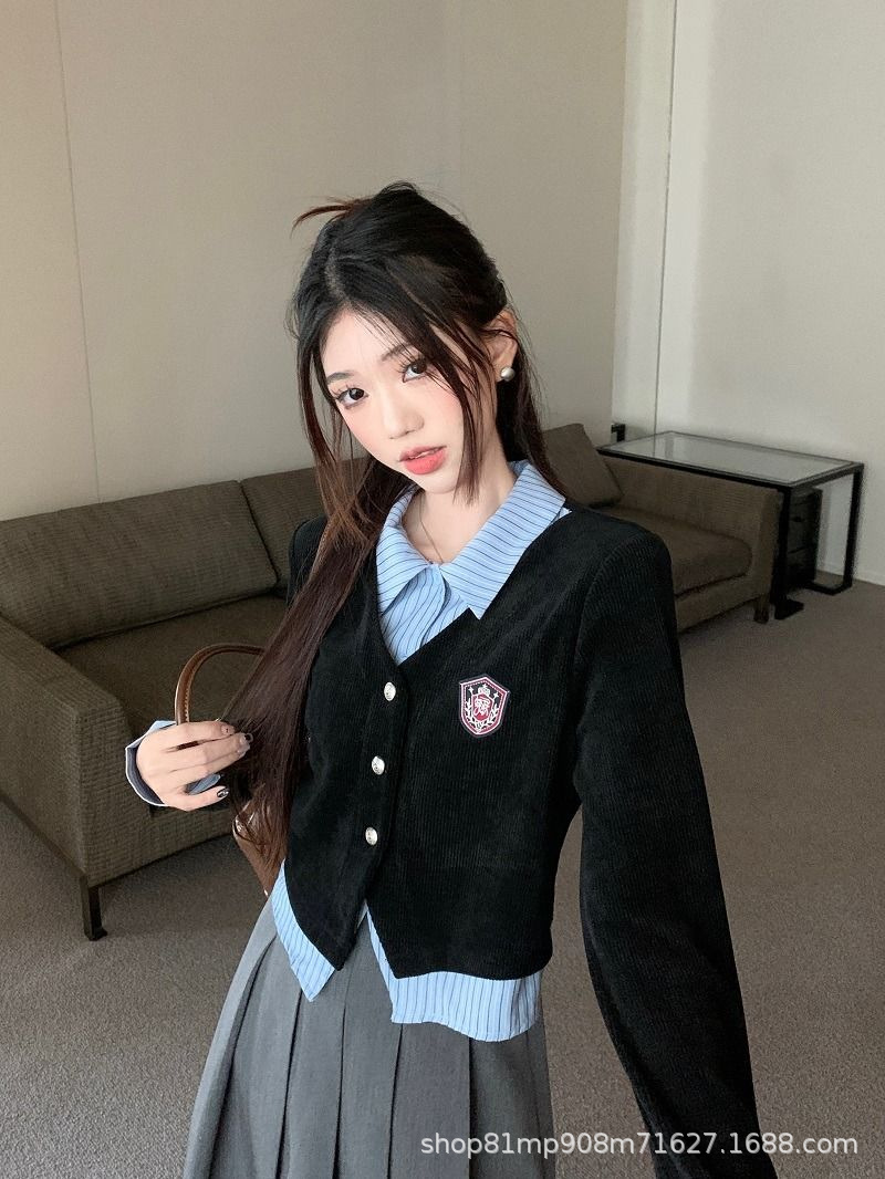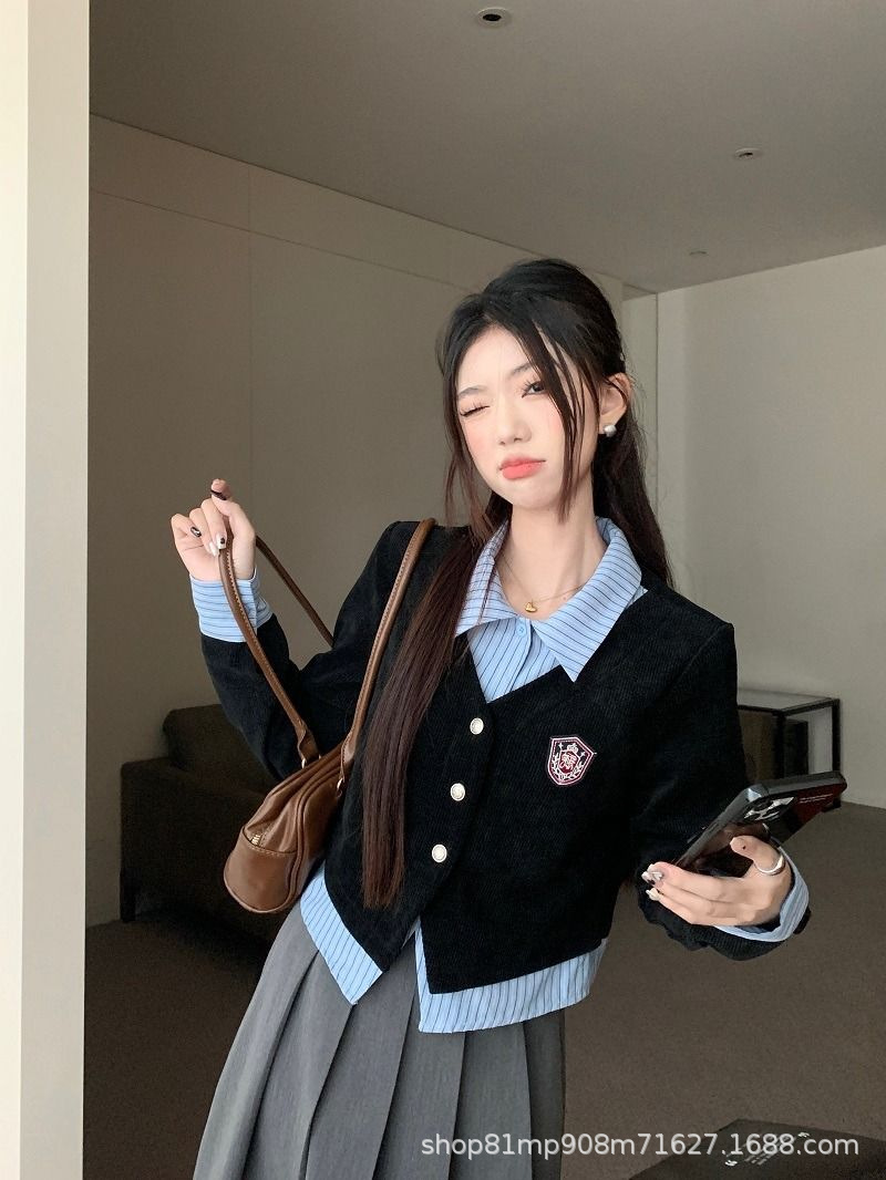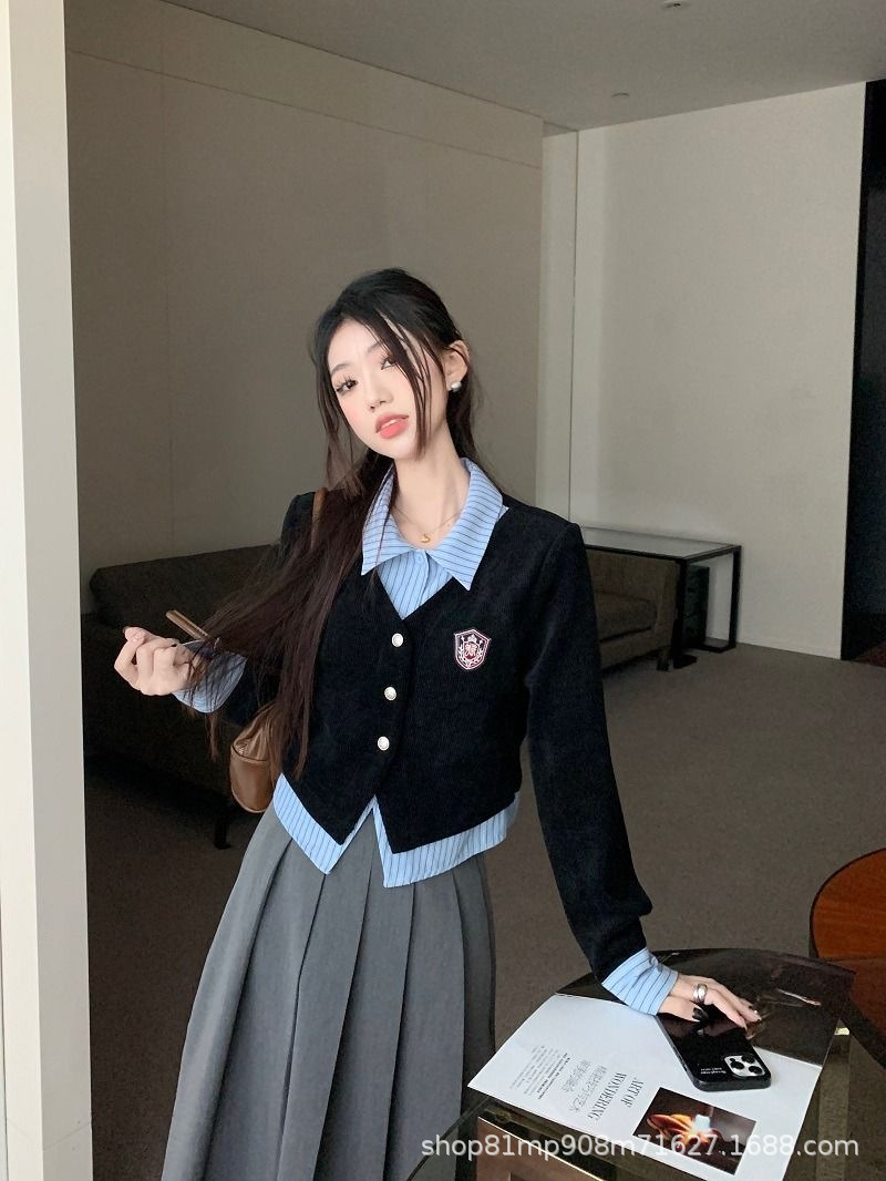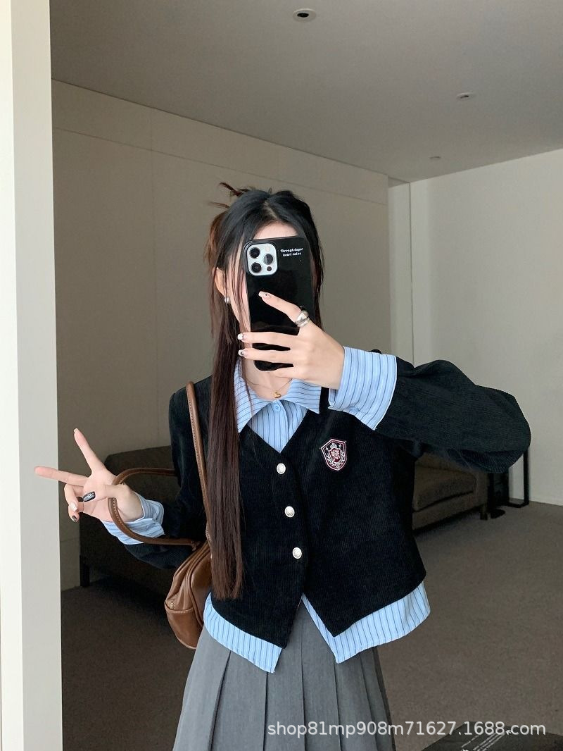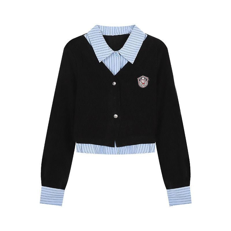대학생 스타일 셔츠 여성용 투피스 POLO 칼라 긴팔 셔츠 가을 레이어드 디자인 셔츠 자켓
