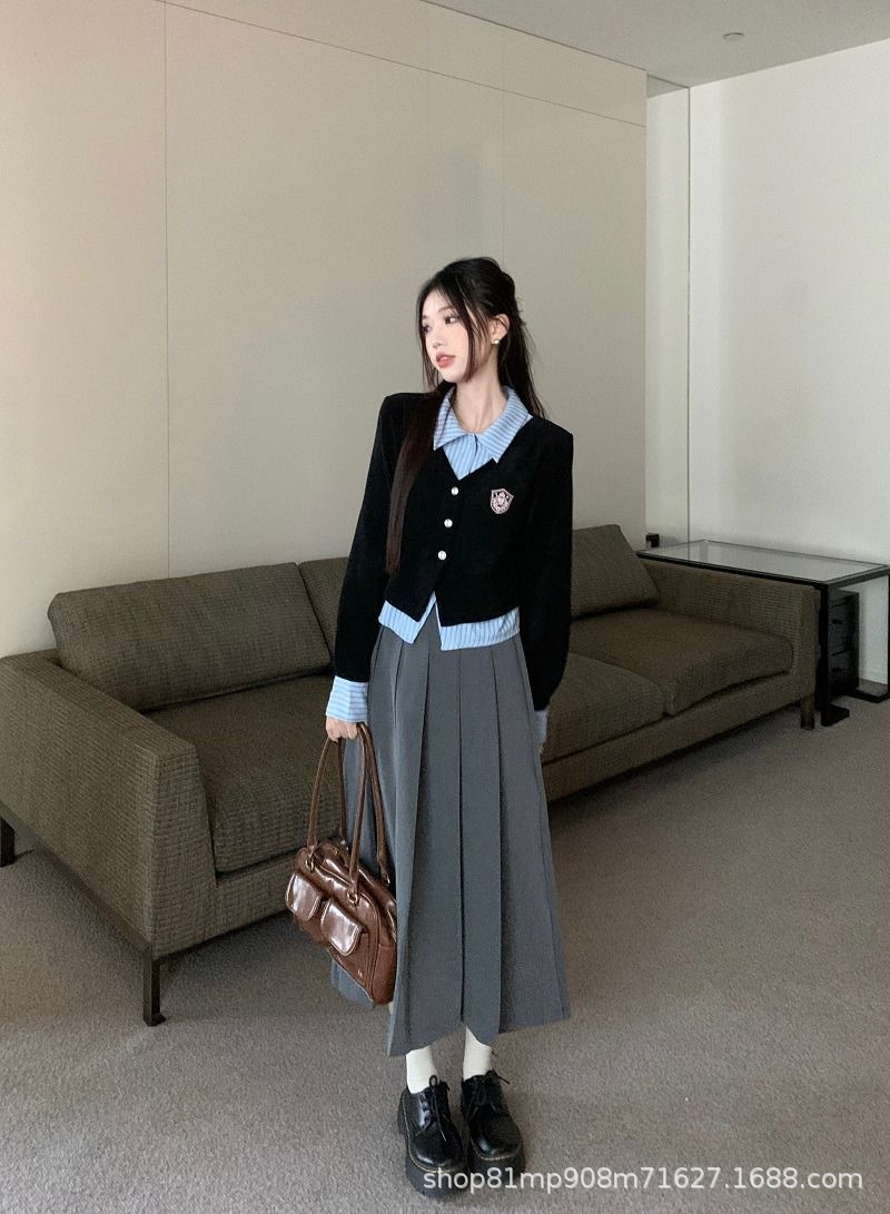 대학생 스타일 셔츠 여성용 투피스 POLO 칼라 긴팔 셔츠 가을 레이어드 디자인 셔츠 자켓스토어 가기