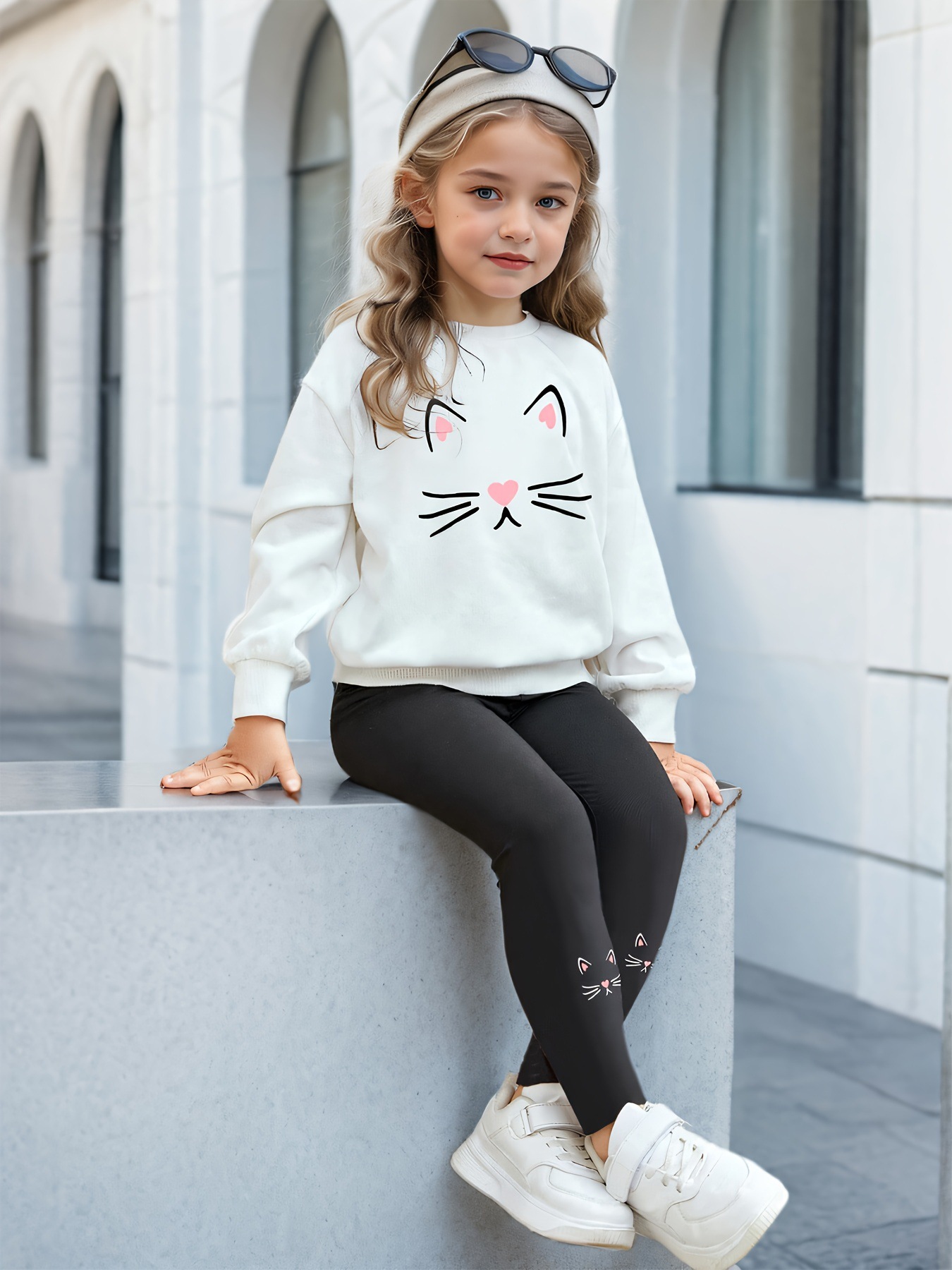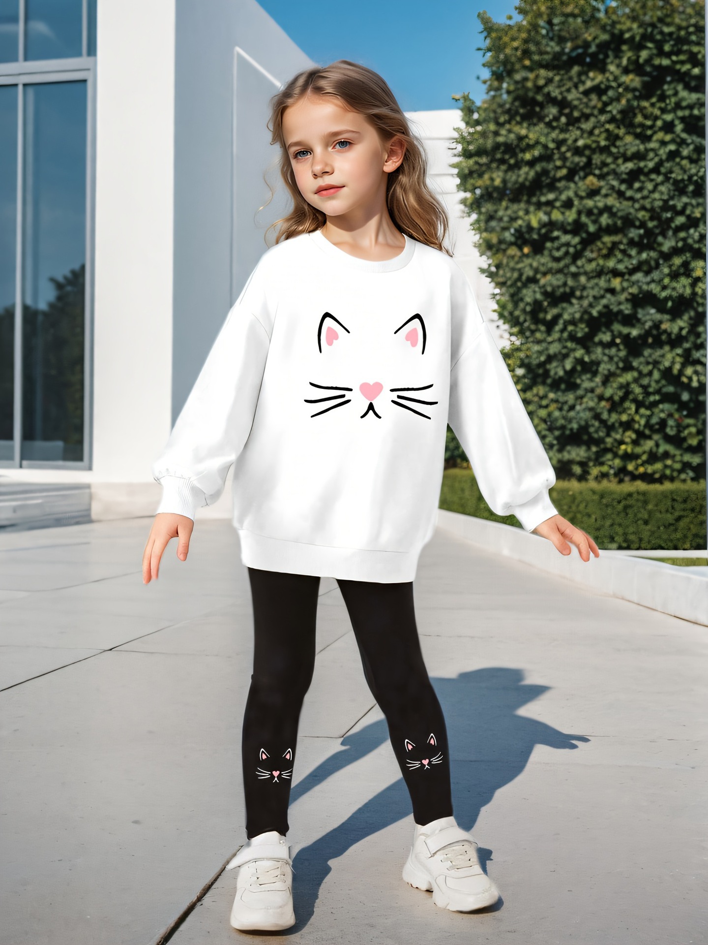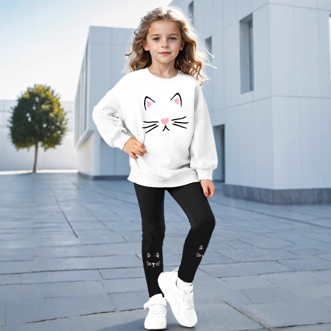 국경 간 대외 무역 INS 소녀 2 피스 스웨트 셔츠 및 고양이 얼굴 프린트 크루 넥 긴 소매 스웨트 셔츠 타이트 바지 세트스토어 가기