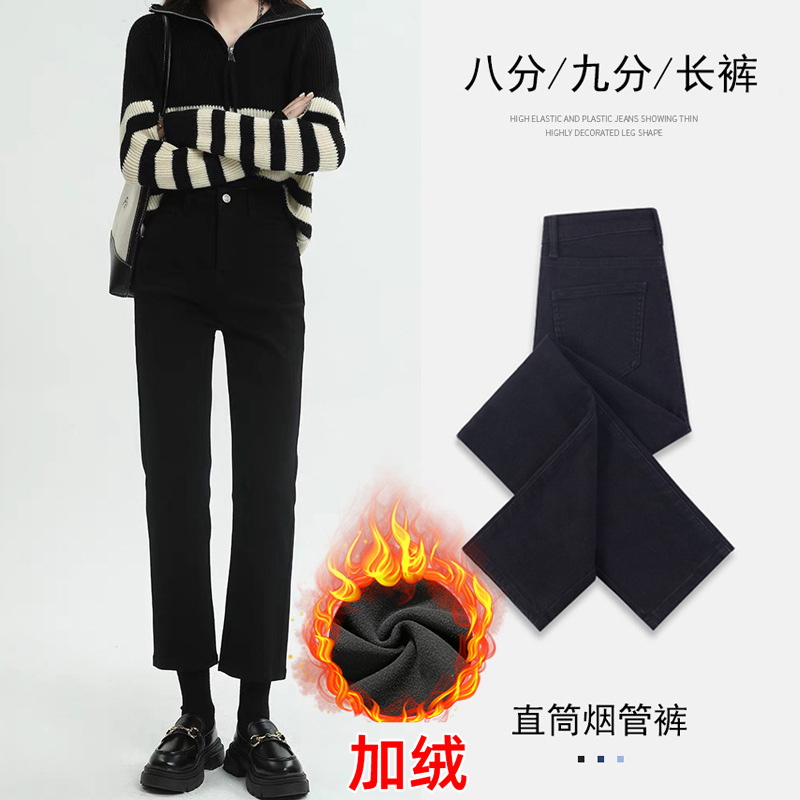 검은 연기 튜브 스트레이트 청바지 여성 7 점 2024 신상 가을/겨울 기모 높은 허리 봄/가을 9 점 바지