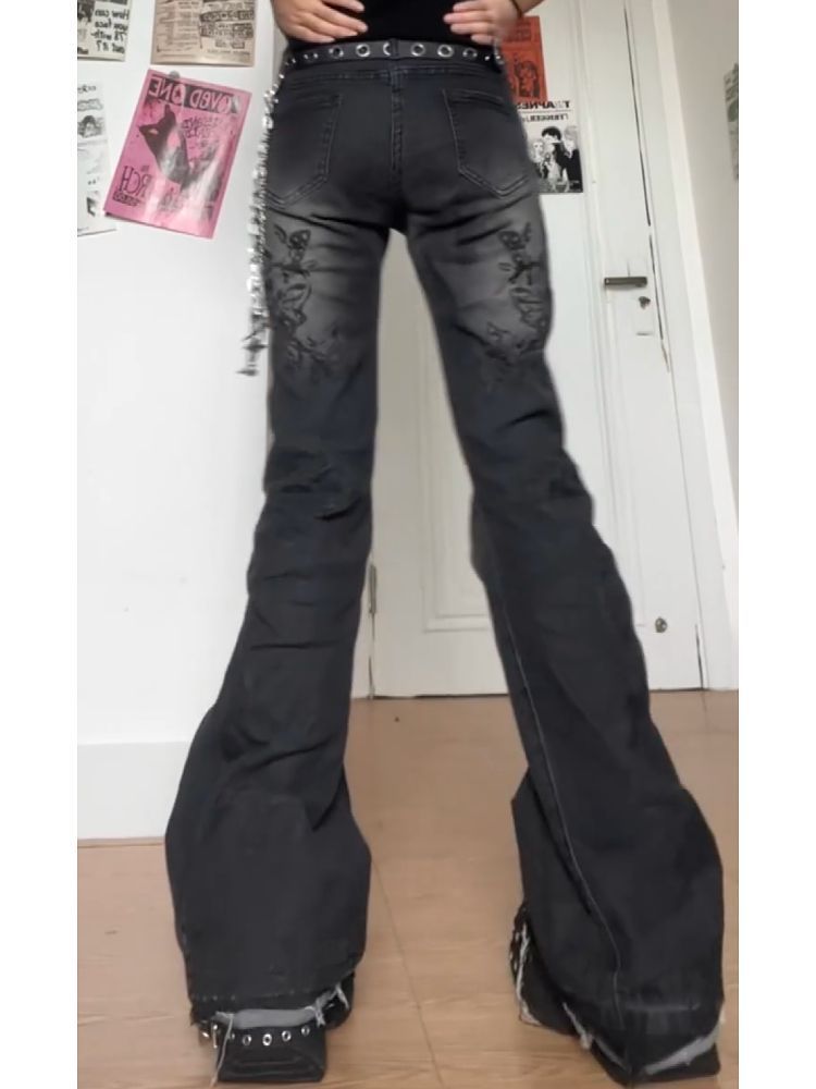 서브 컬처 빈티지 세탁 프린트 마이크로 플레어 청바지 여성 아메리칸 스타일 핫 걸 슬림 핏 슬림-밀레니엄 와이드 레그 바지스토어 가기