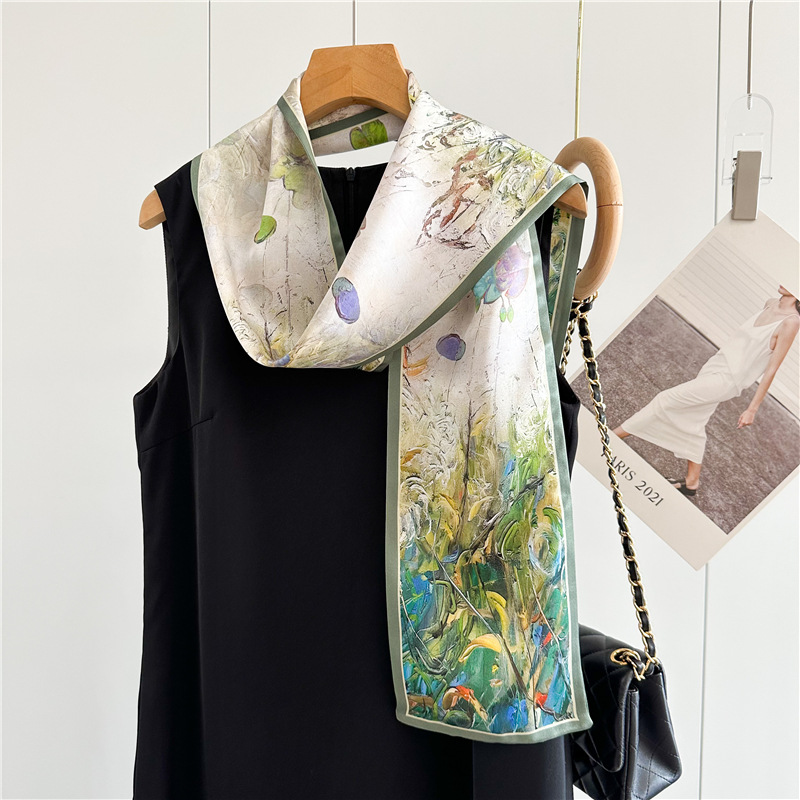신선한 녹색 연꽃 잎 실크 스카프 여성의 우아한 뽕나무 실크 스카프 얇은 좁은 긴 더블 레이어 양면 스카프 리본