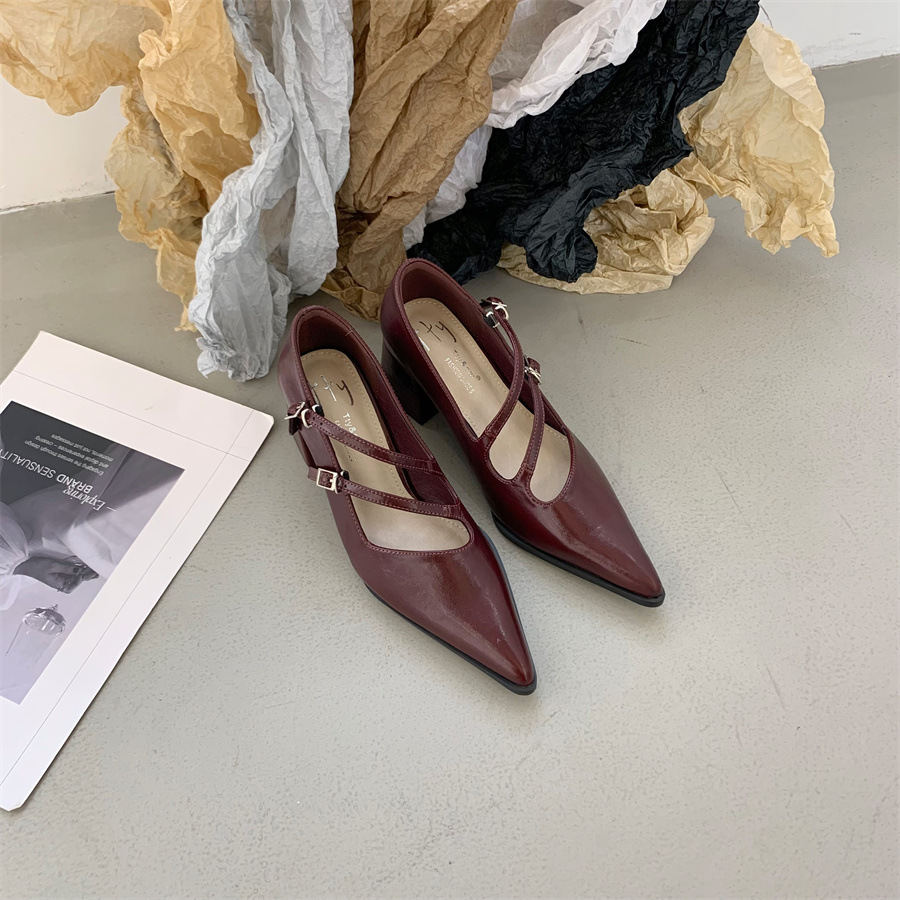 2025 한국식 봄 새 유행 올매치 한 단어 메리 제인 신발 두꺼운 뒤꿈치 뾰족한 발가락 얕은 입 여성 싱글 신발스토어 가기