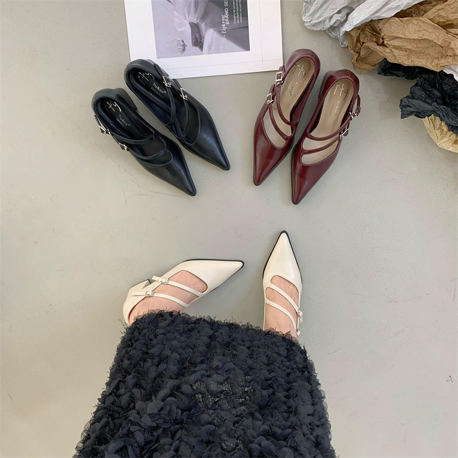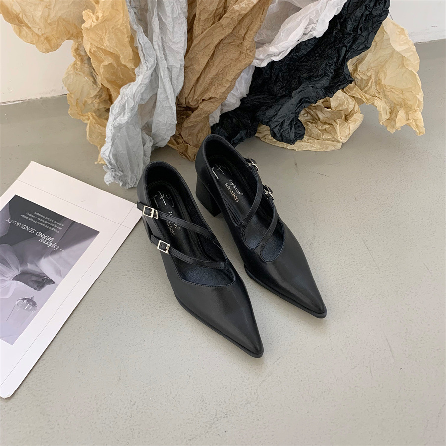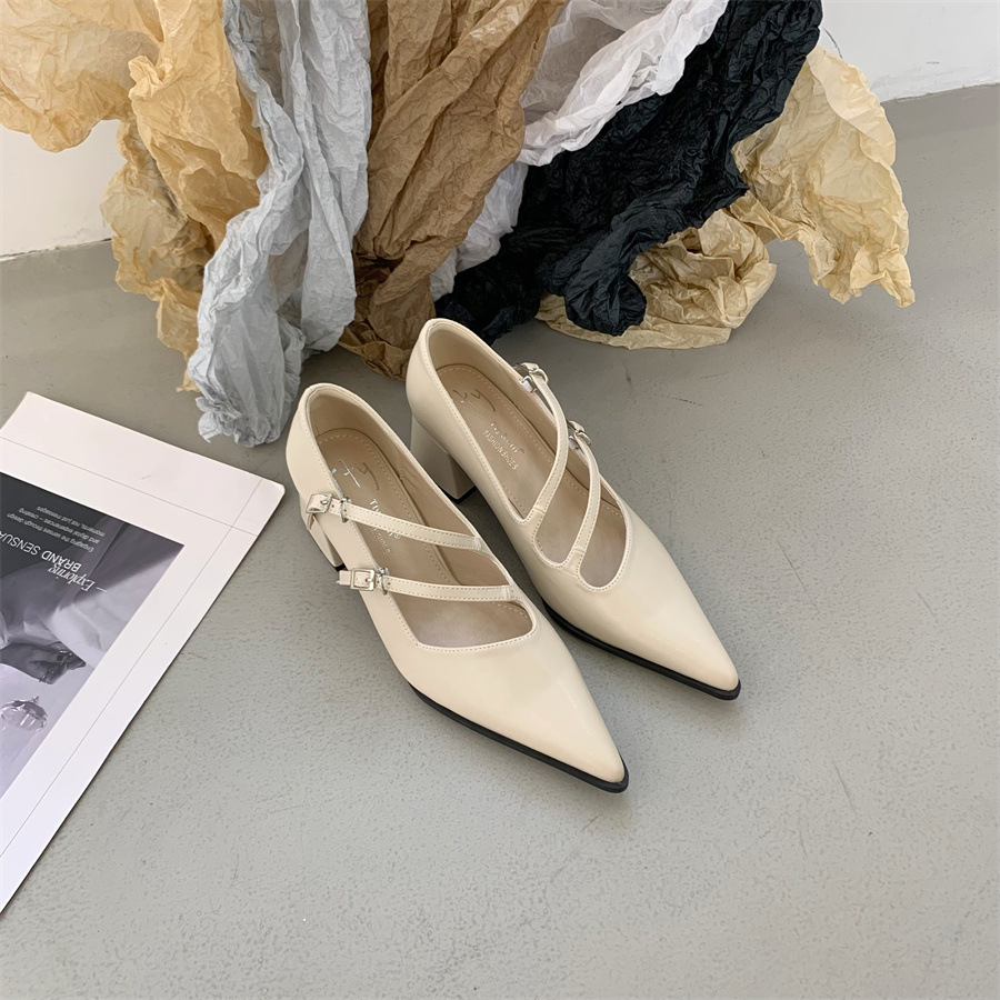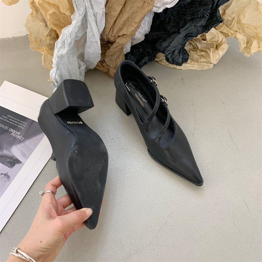 2025 한국식 봄 새 유행 올매치 한 단어 메리 제인 신발 두꺼운 뒤꿈치 뾰족한 발가락 얕은 입 여성 싱글 신발