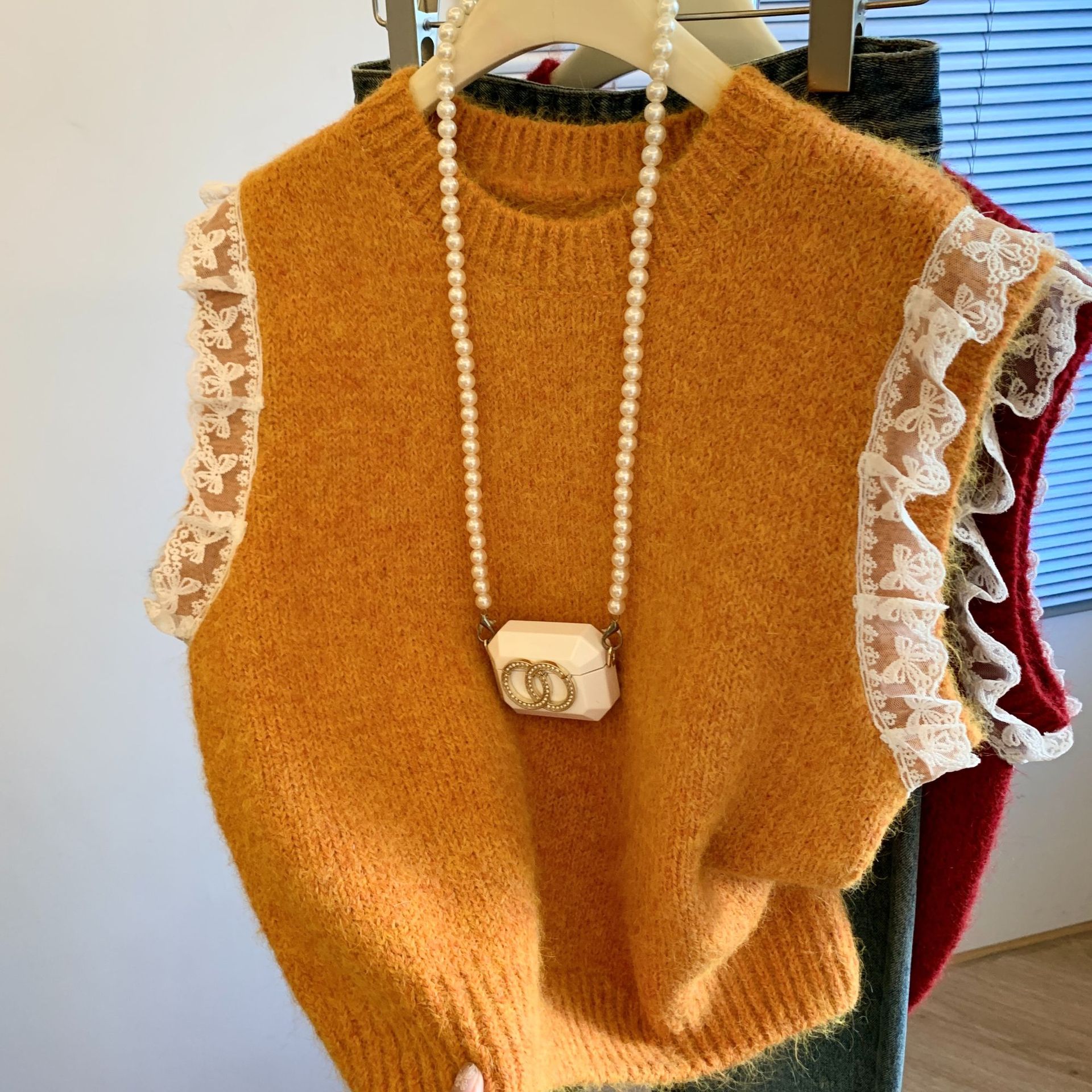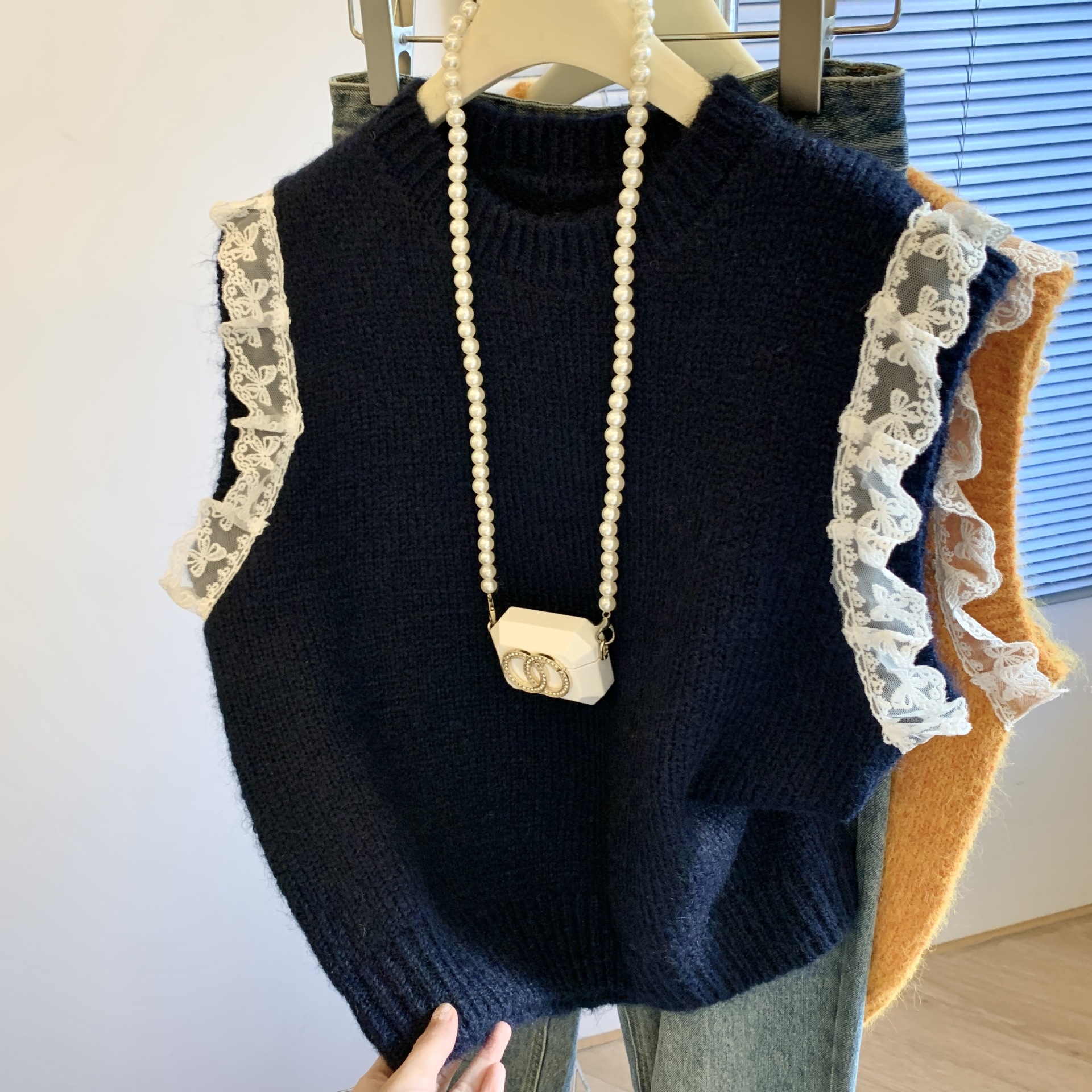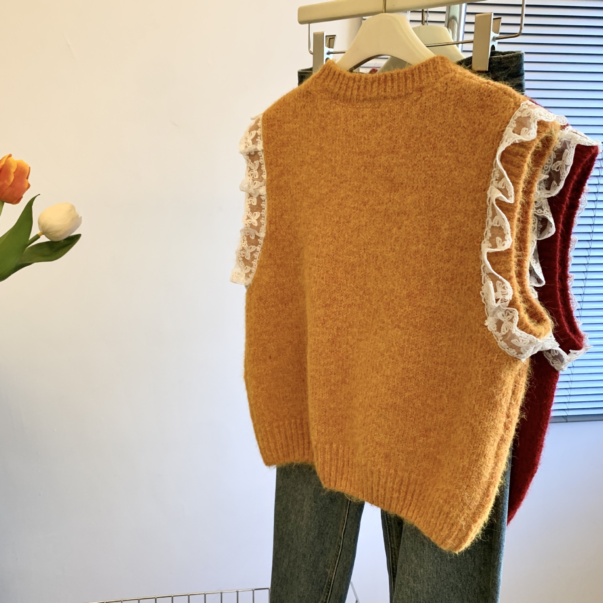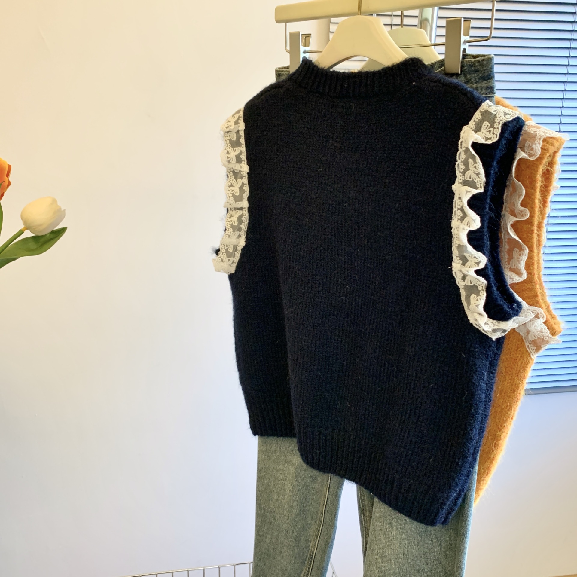 여성을위한 레트로 레이스 스플 라이스 민소매 니트 조끼 가을, 겨울 라운드 넥 느슨한 게으른 스타일 스웨터 탑