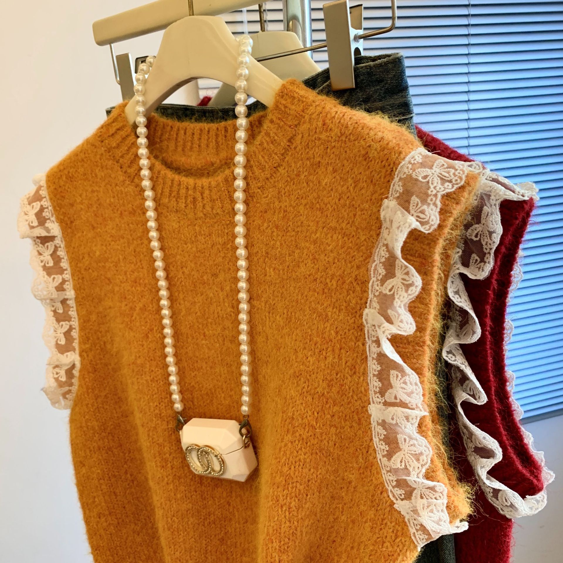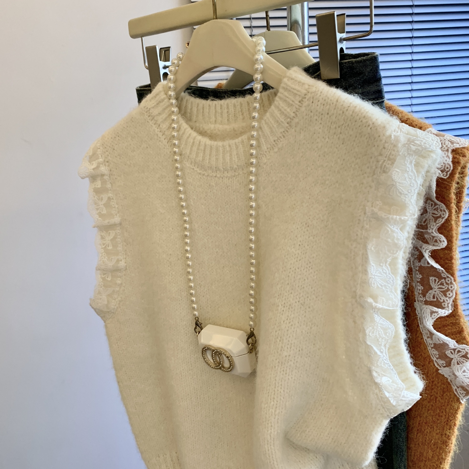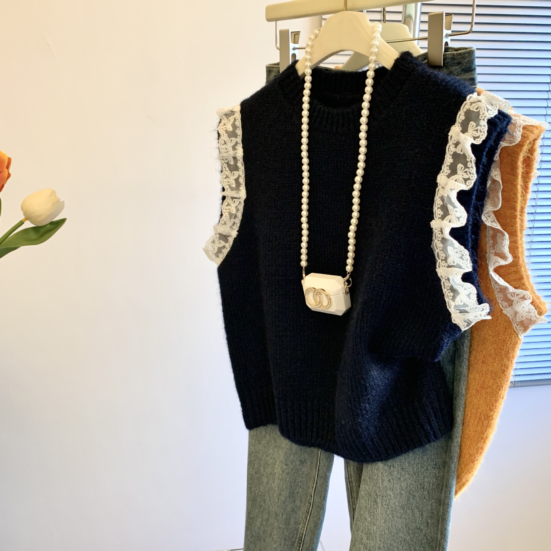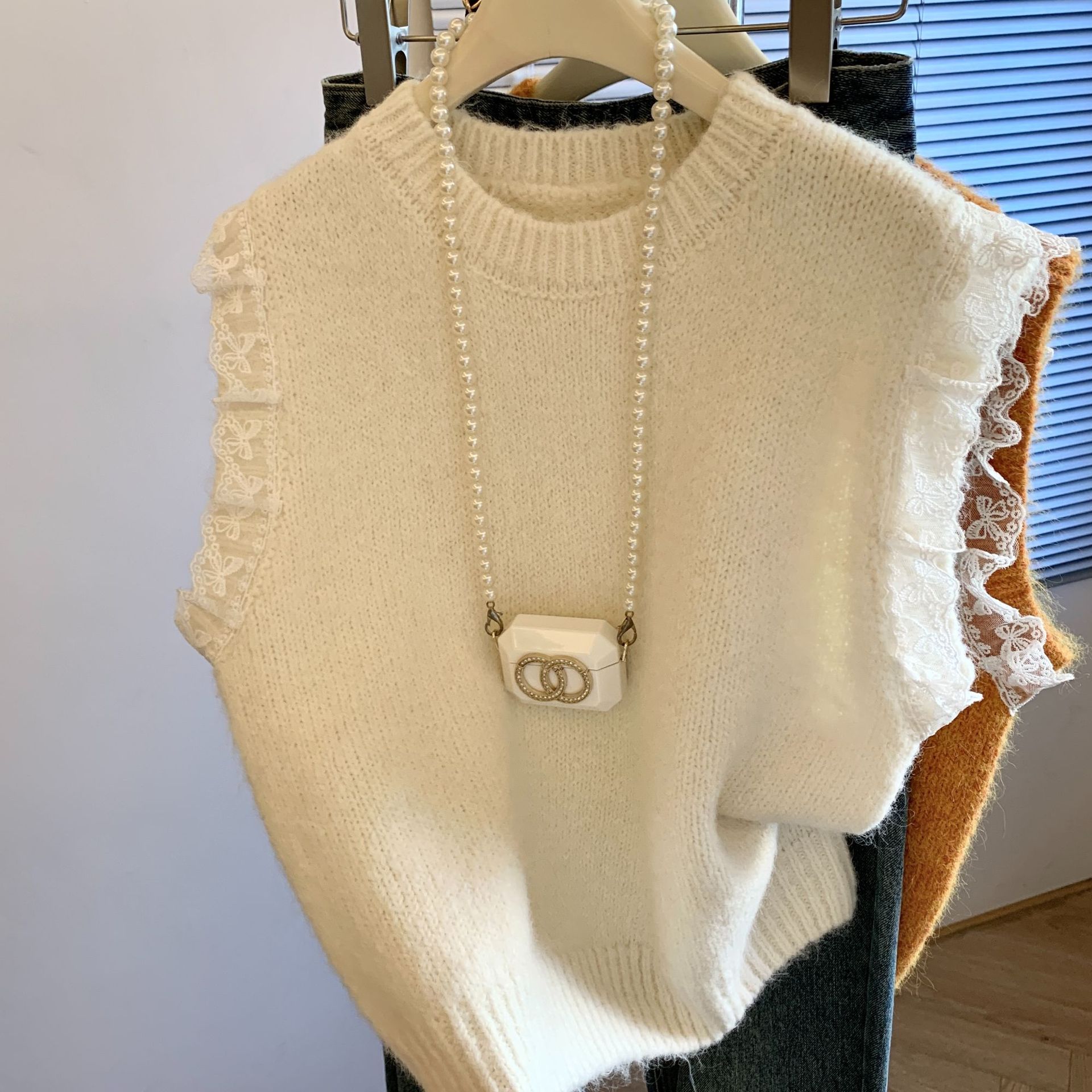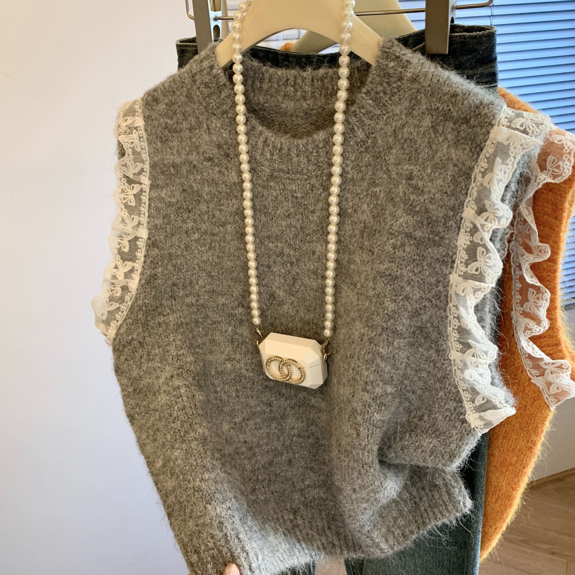여성을위한 레트로 레이스 스플 라이스 민소매 니트 조끼 가을, 겨울 라운드 넥 느슨한 게으른 스타일 스웨터 탑