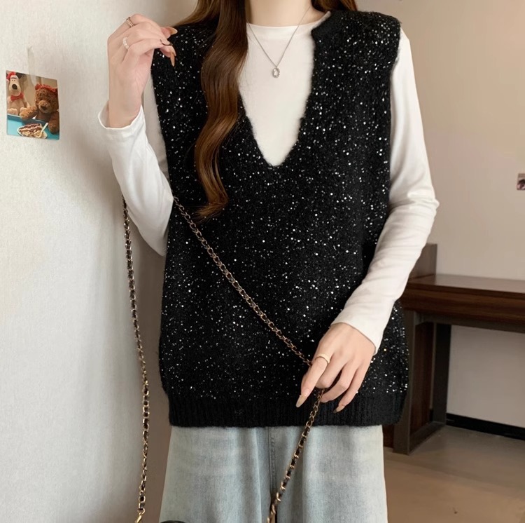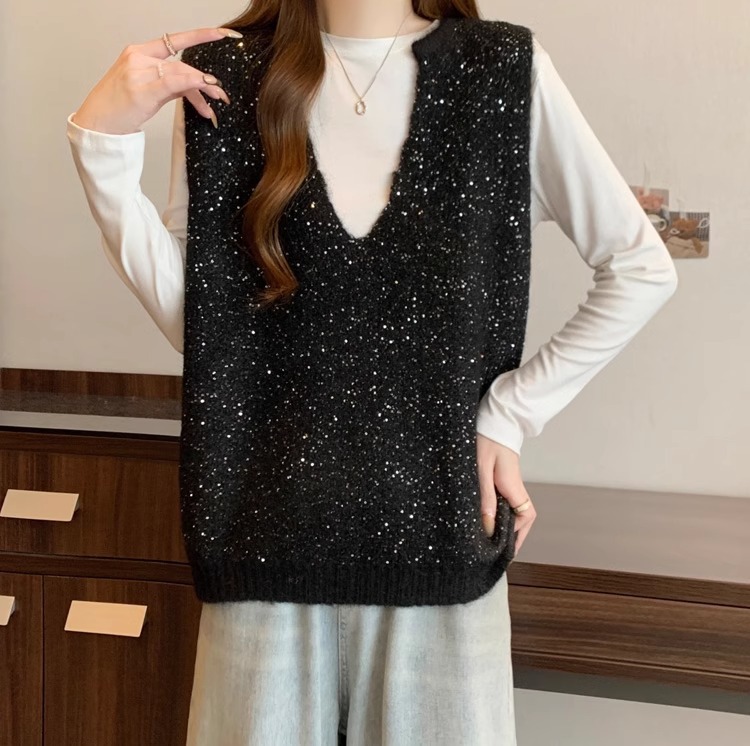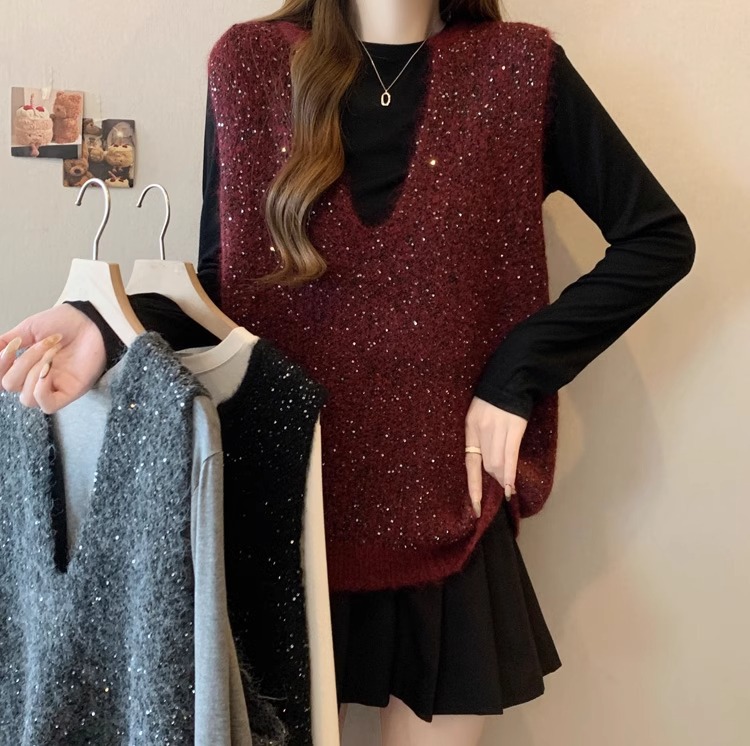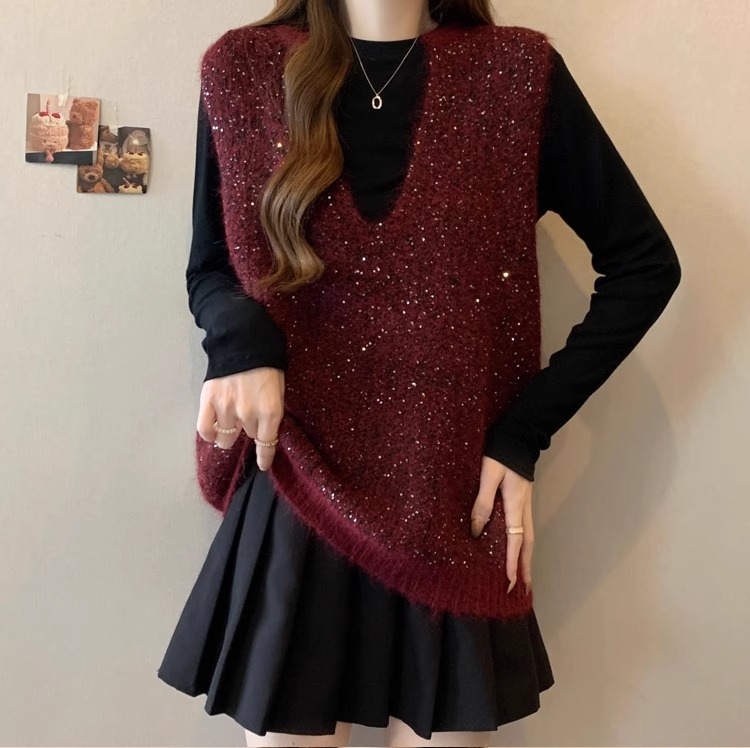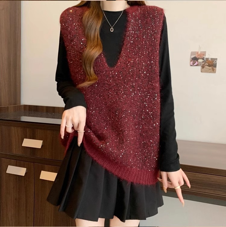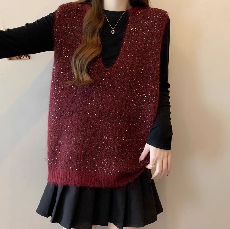 레드 V 넥 세퀸 조끼 플러스 사이즈 여성 통통녀 봄 느슨한 슬림 핏 웨이스트 코트 조끼 탑스토어 가기