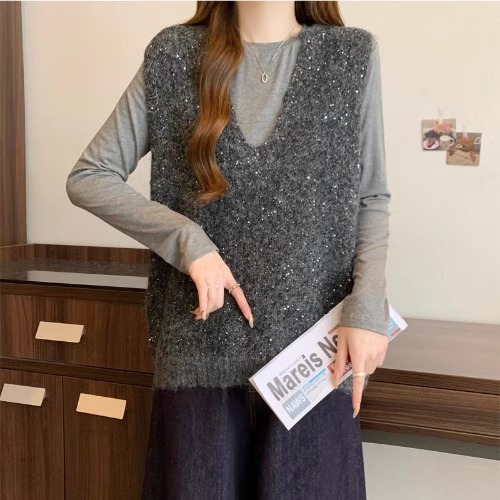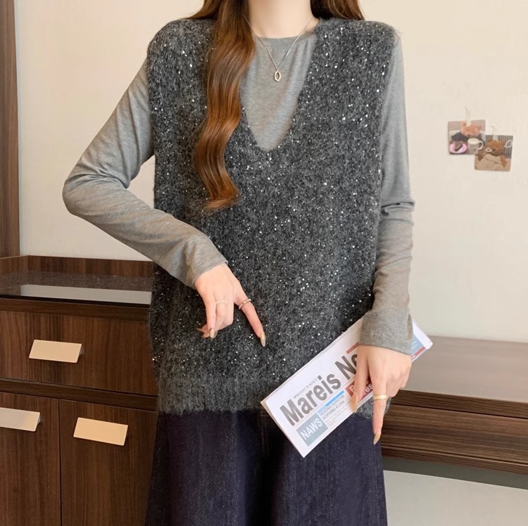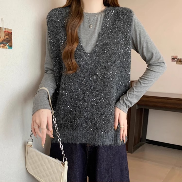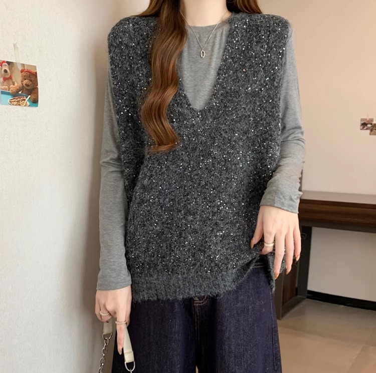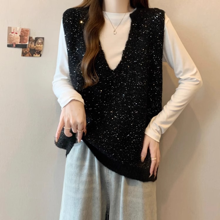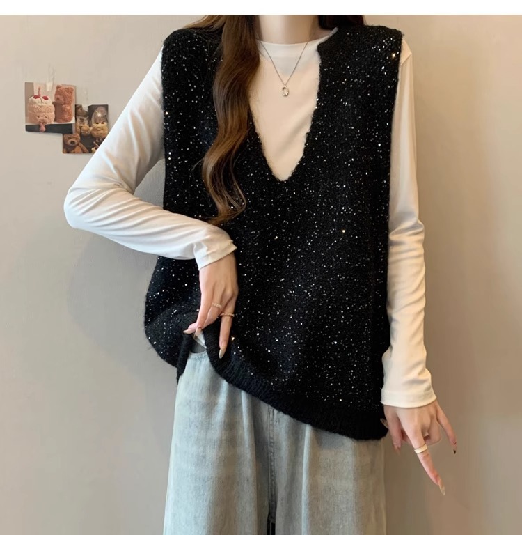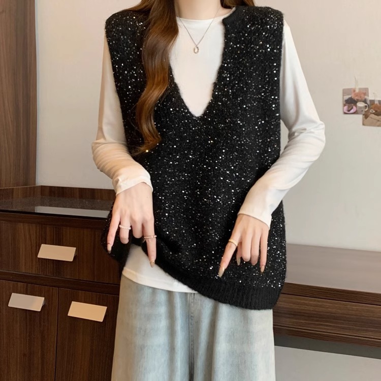 레드 V 넥 세퀸 조끼 플러스 사이즈 여성 통통녀 봄 느슨한 슬림 핏 웨이스트 코트 조끼 탑스토어 가기