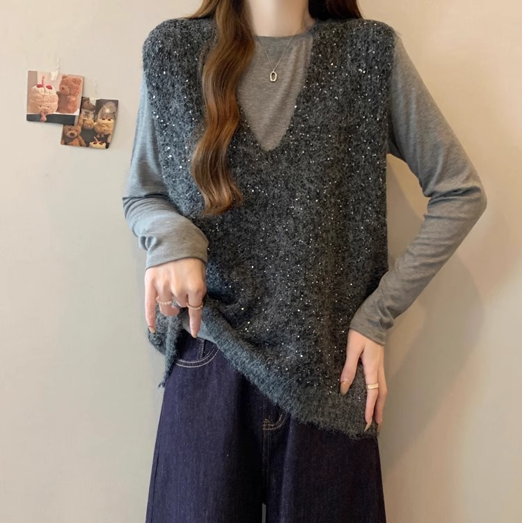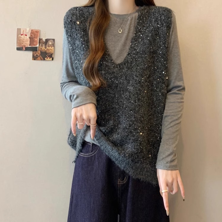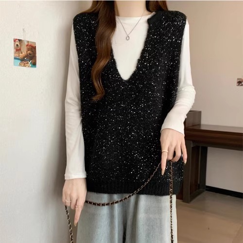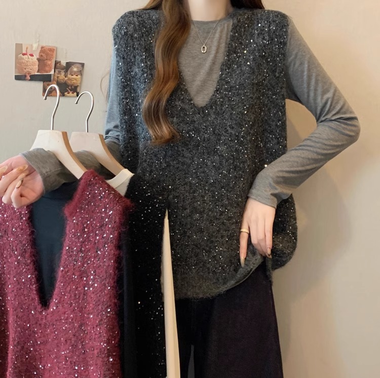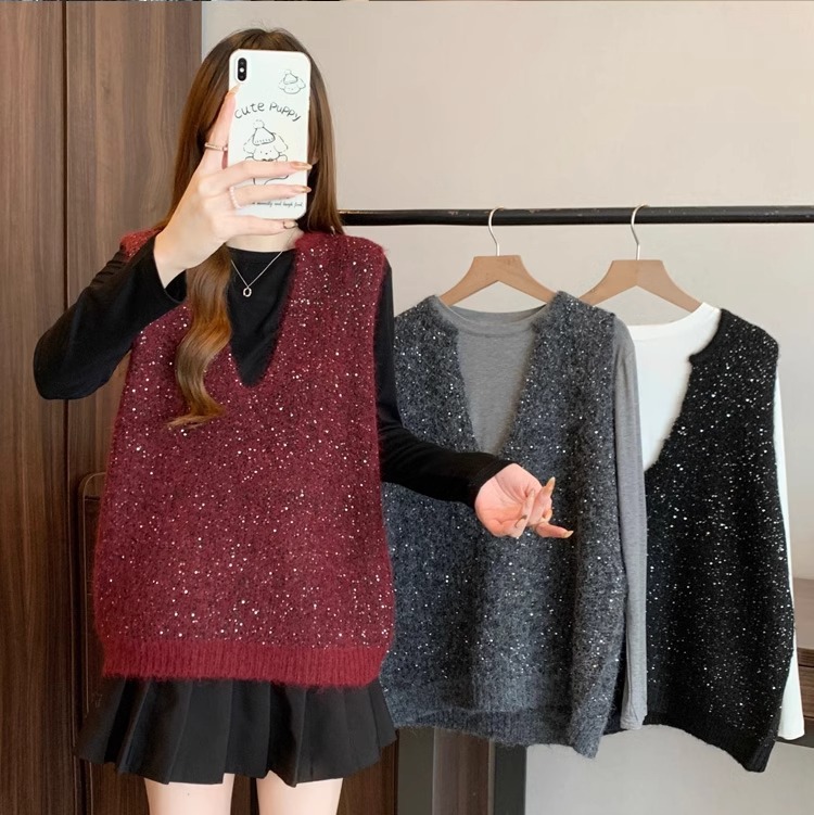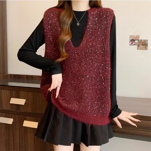 레드 V 넥 세퀸 조끼 플러스 사이즈 여성 통통녀 봄 느슨한 슬림 핏 웨이스트 코트 조끼 탑