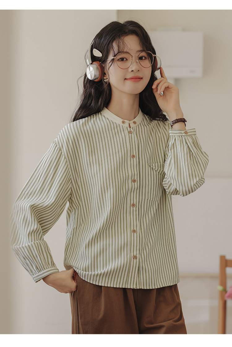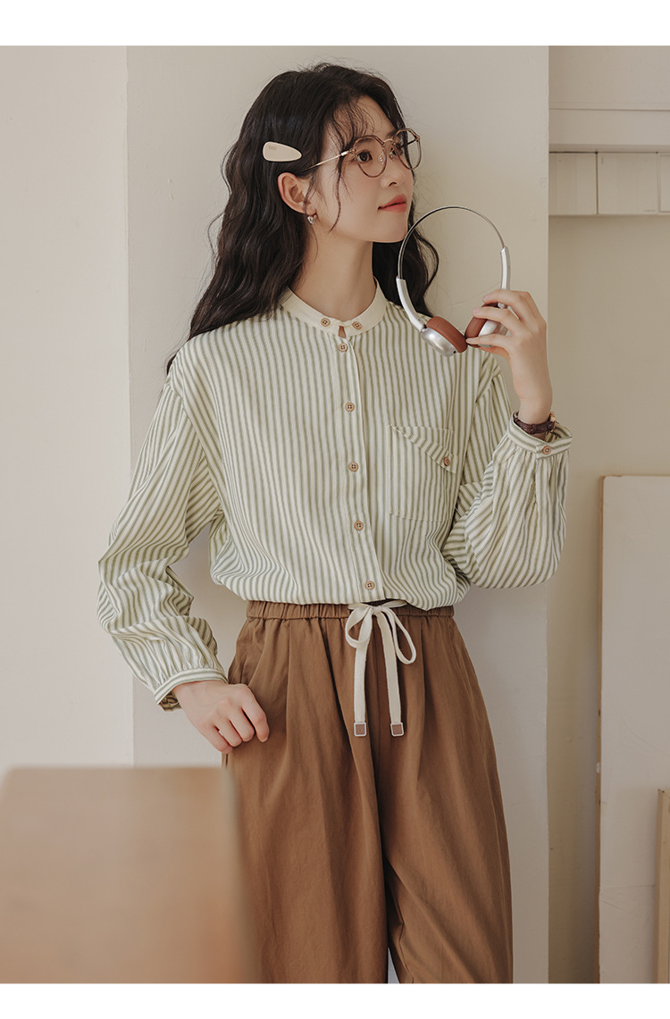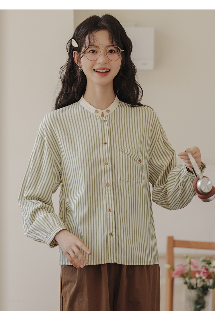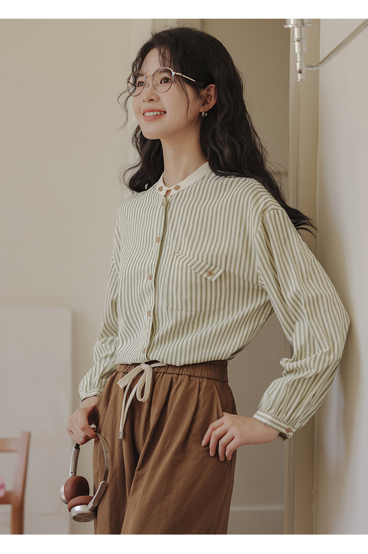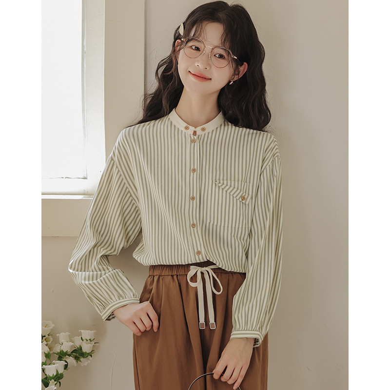 2025 년 봄 새로운 일본 스타일 간단한 버튼 디자인 크루 넥 스트라이프 컬러 매칭 루즈 스택 긴 소매 셔츠스토어 가기