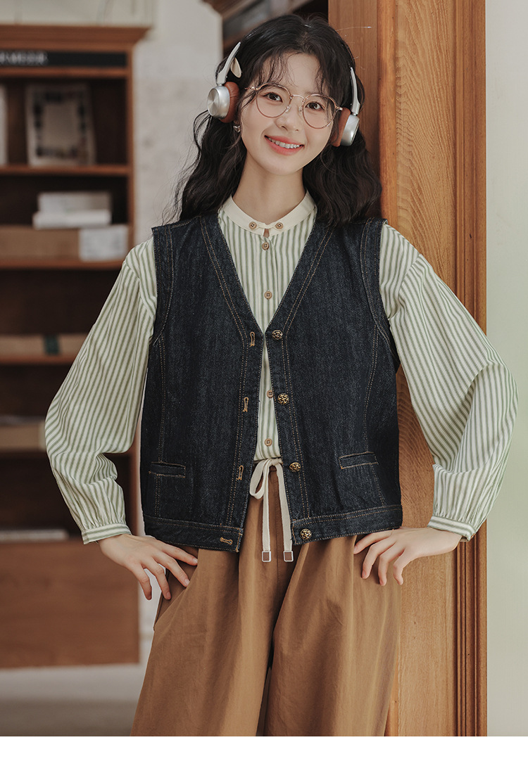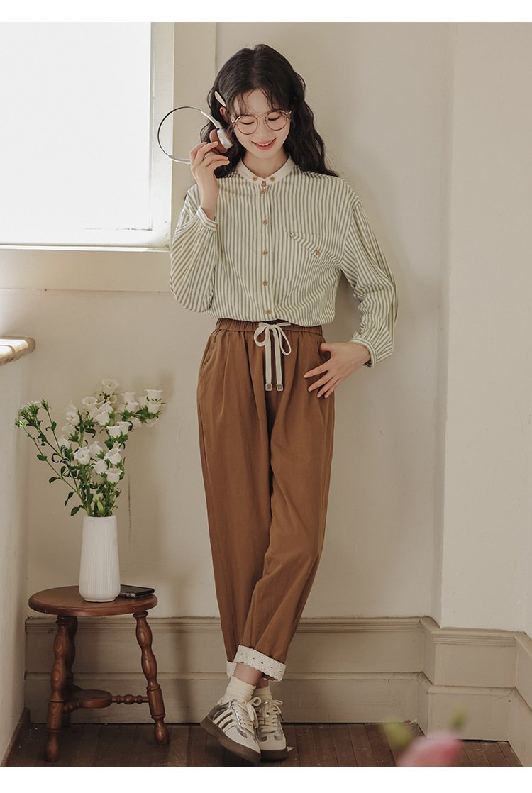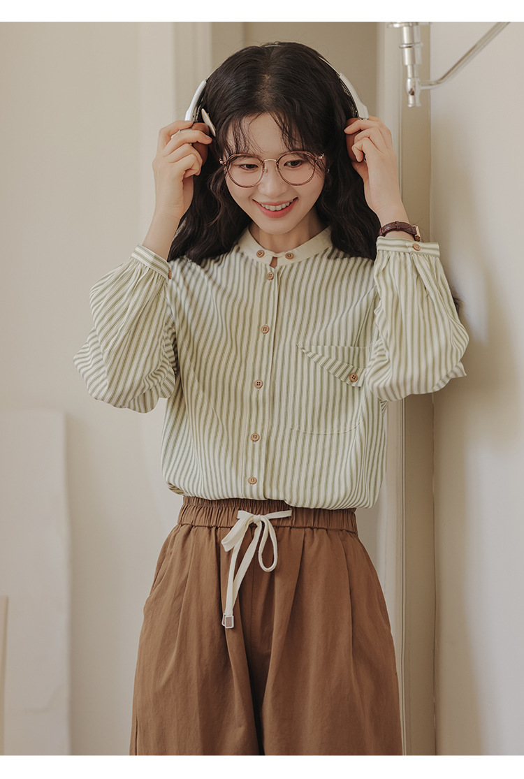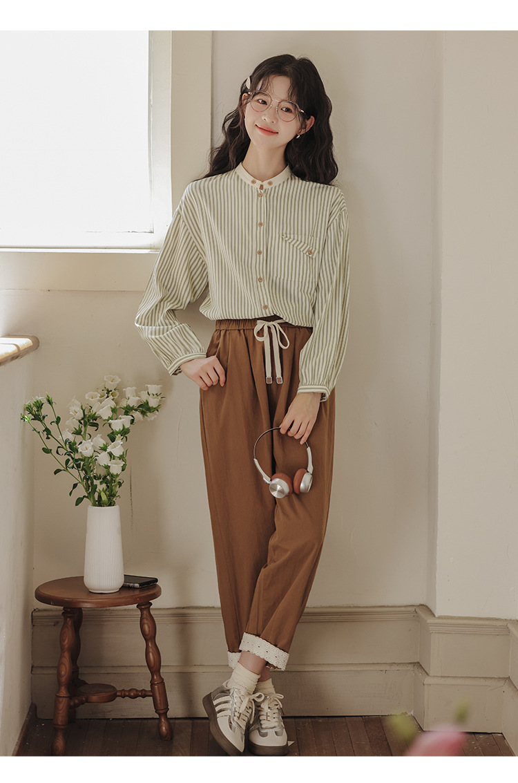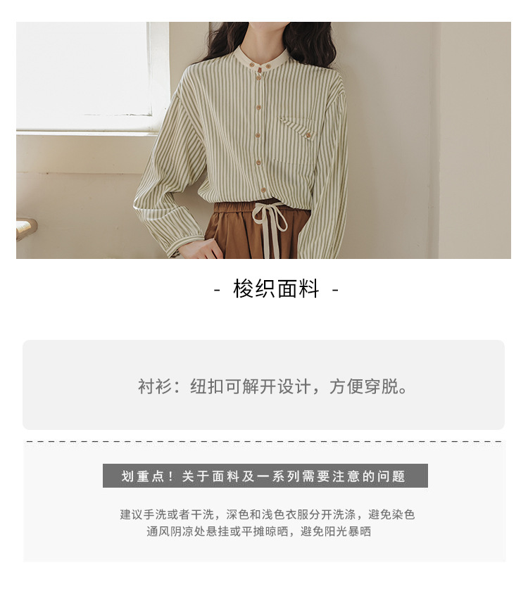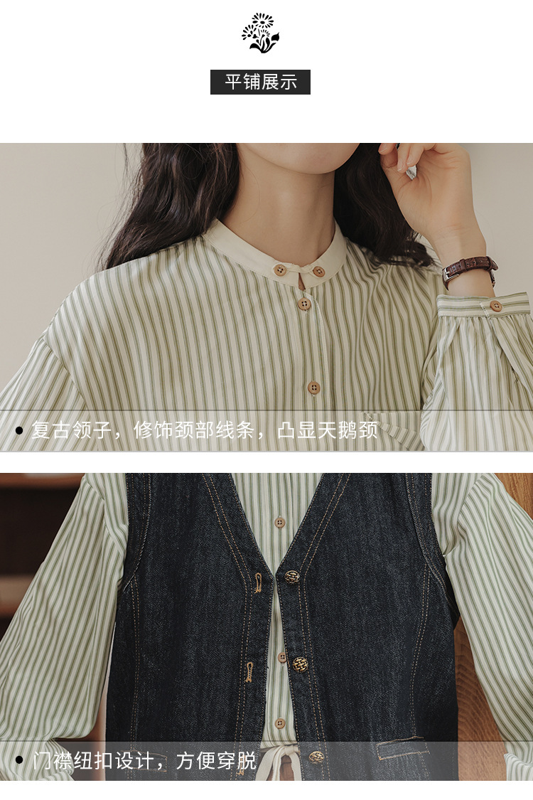 2025 년 봄 새로운 일본 스타일 간단한 버튼 디자인 크루 넥 스트라이프 컬러 매칭 루즈 스택 긴 소매 셔츠스토어 가기