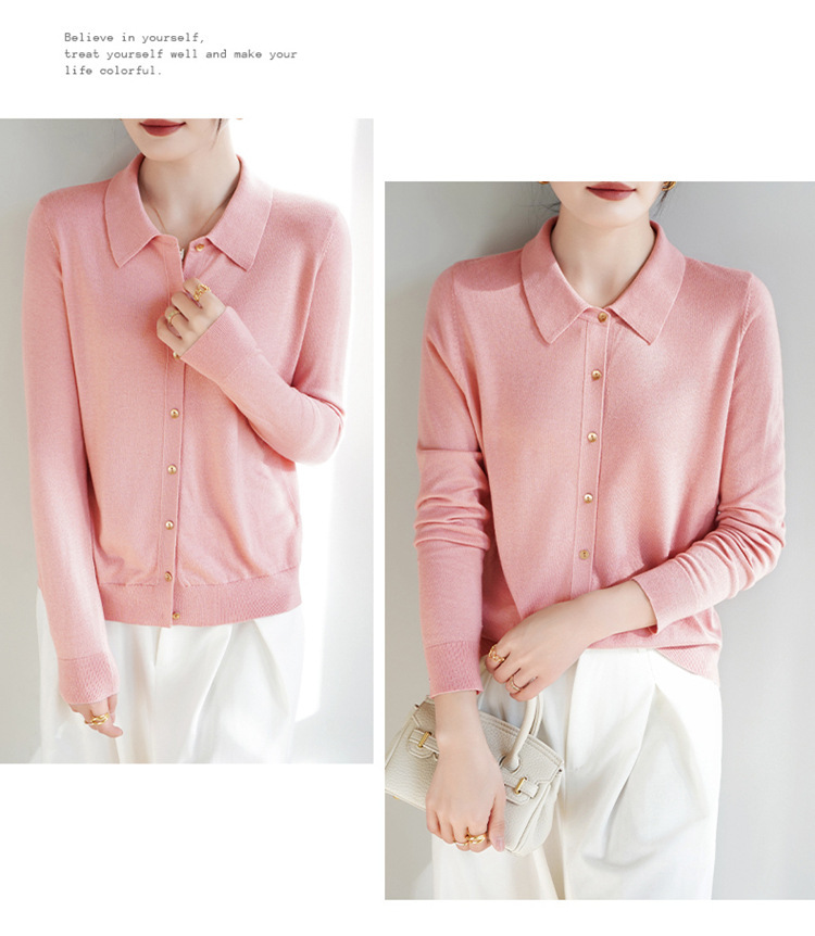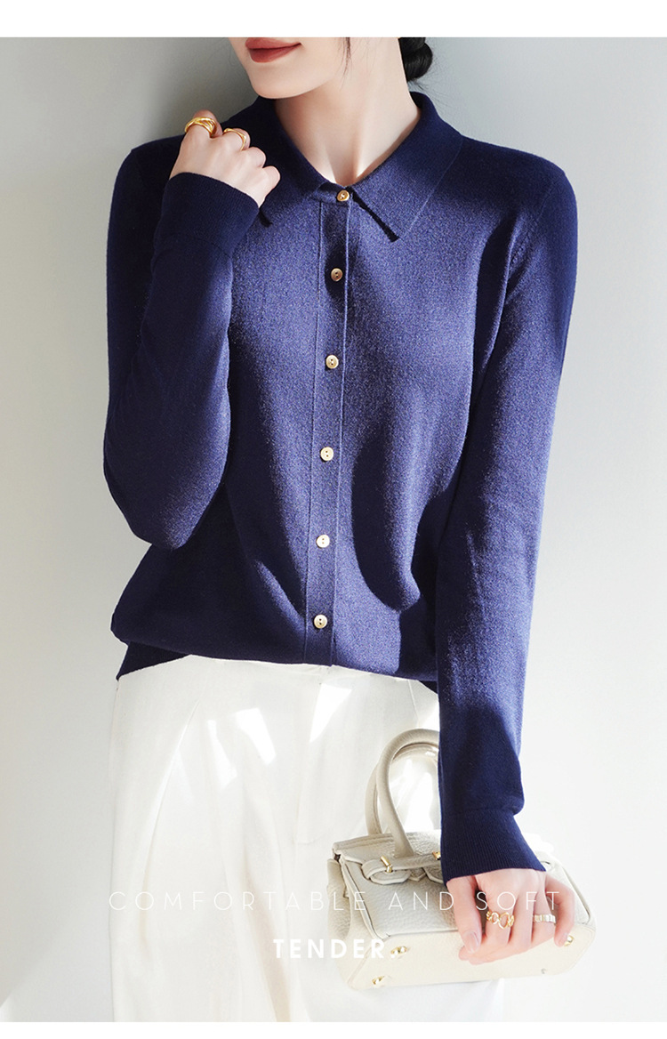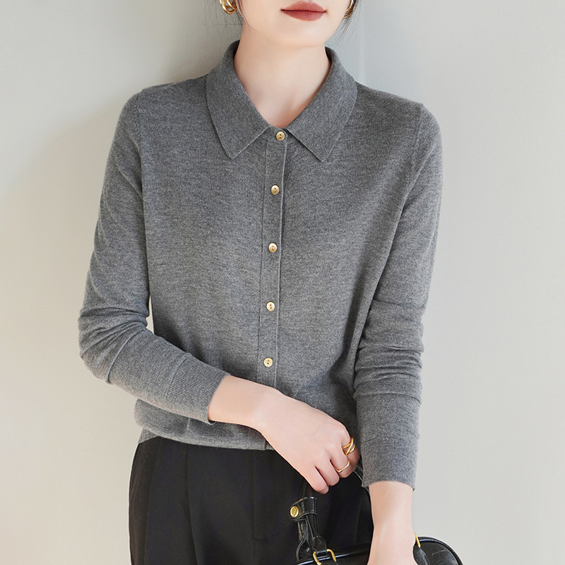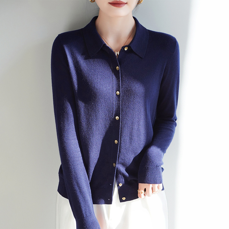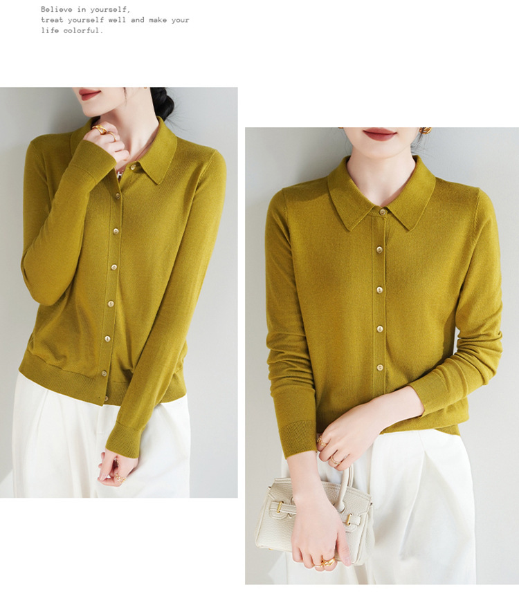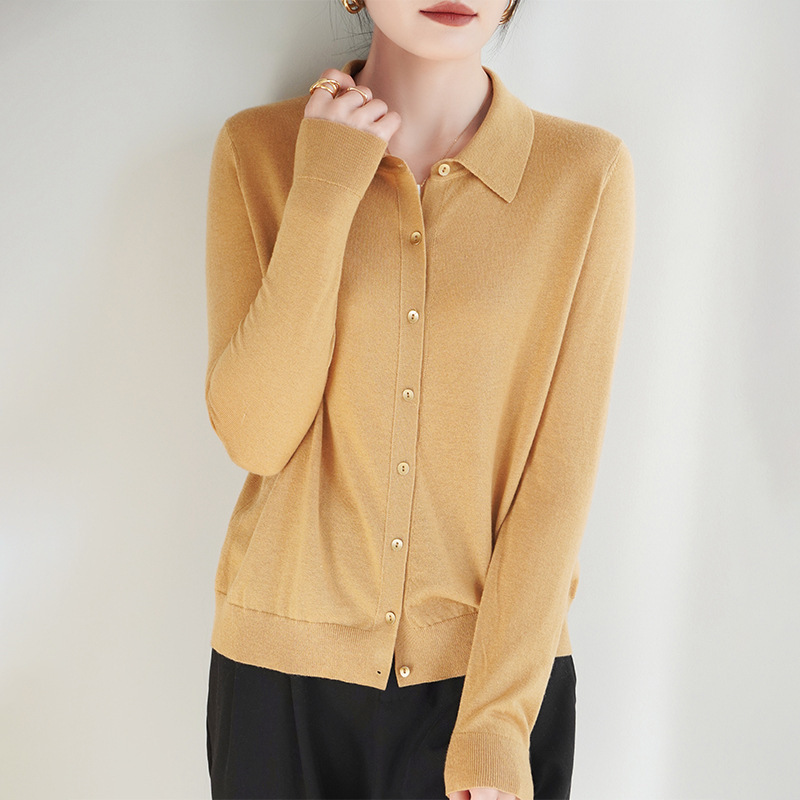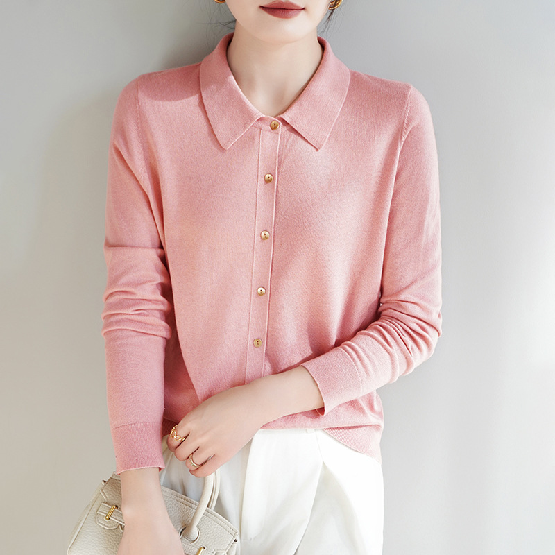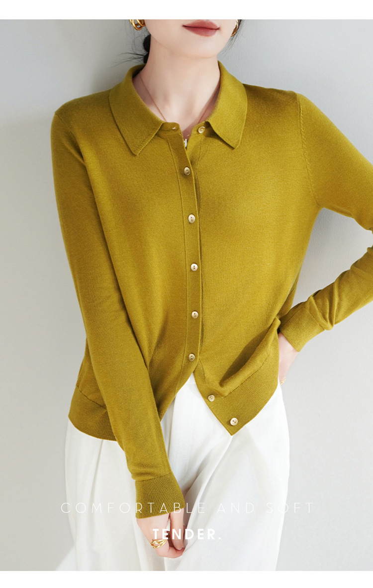 여자 카디건 봄 새로운 실크 캐시미어 폴로 칼라 솔리드 컬러 외부 긴 소매 슬림 룩 올매치 니트 셔츠