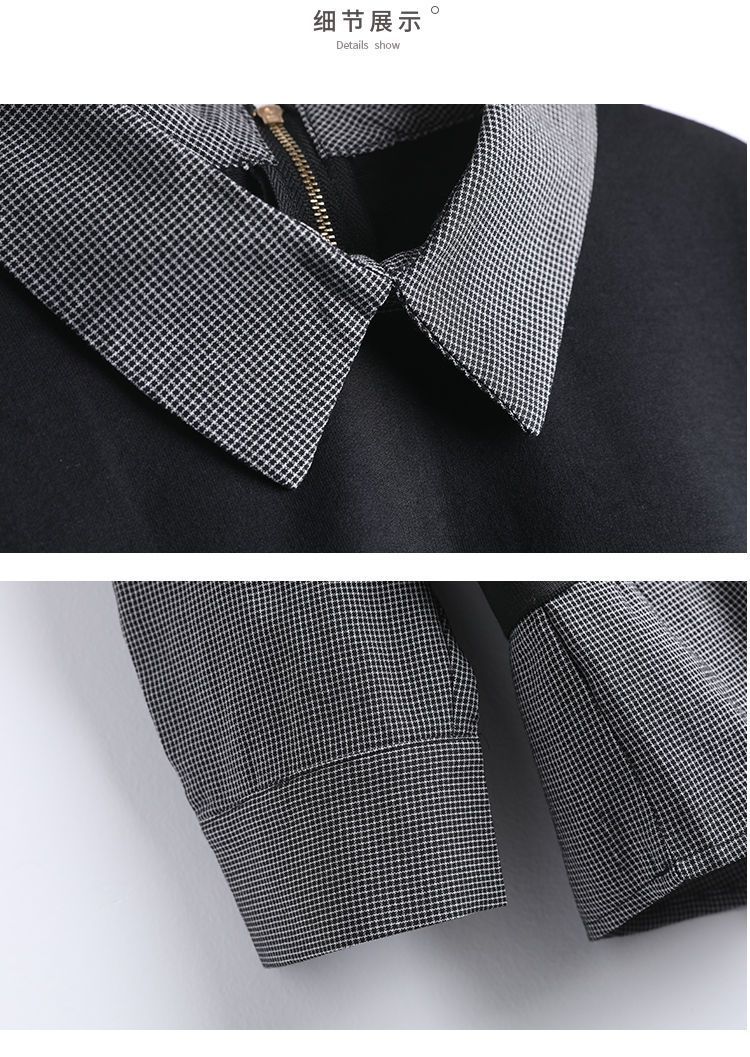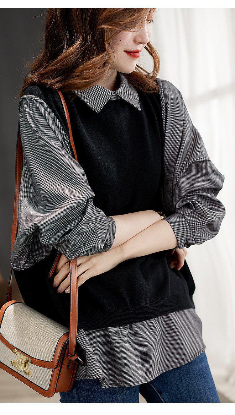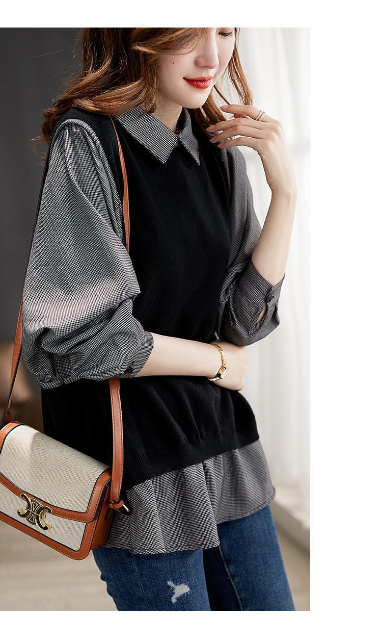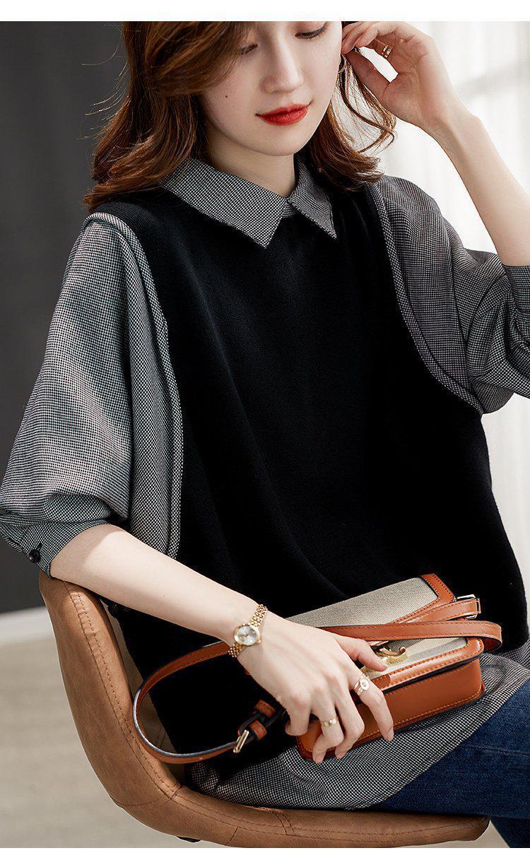 유럽 역 2024 봄과 가을 새로운 가짜 투피스 느슨한 슬리밍 인형 칼라 격자 무늬 스티칭 스웨트 셔츠 탑 여성스토어 가기