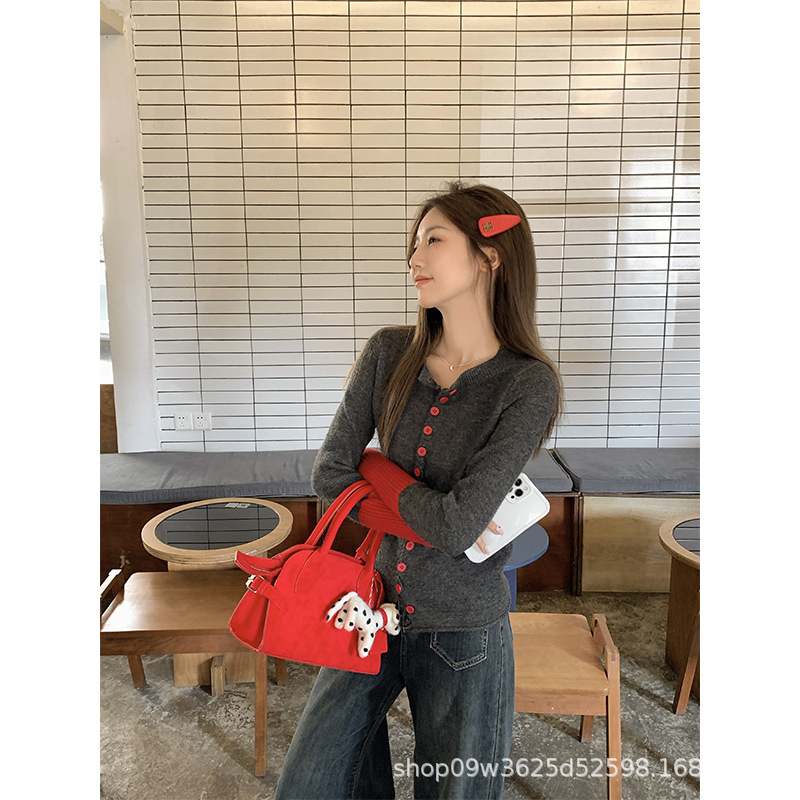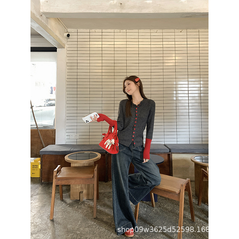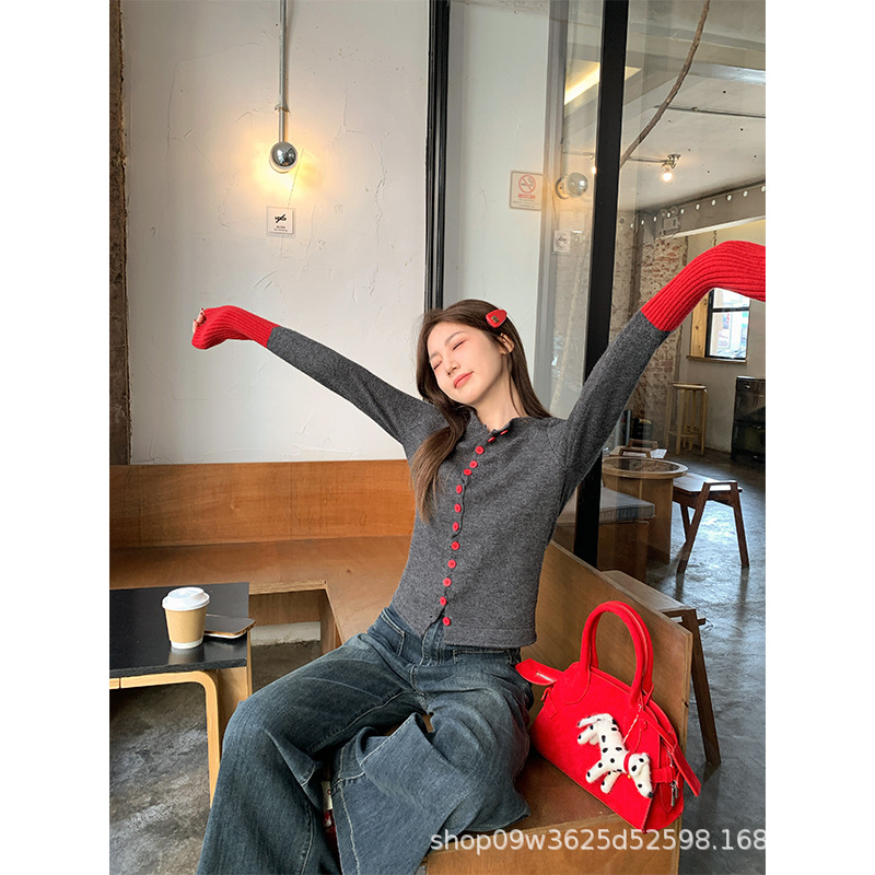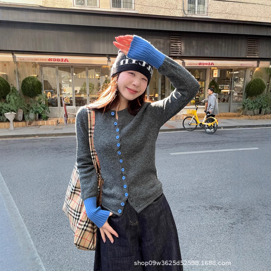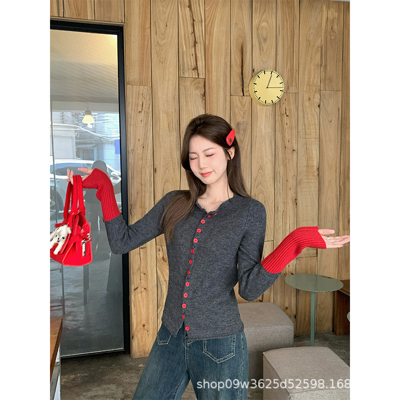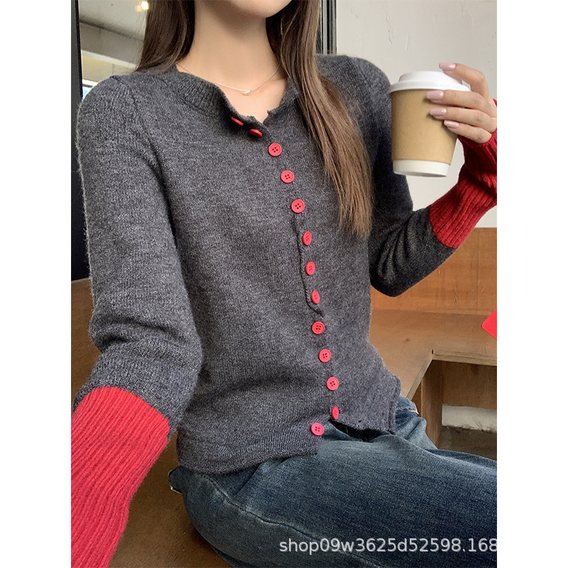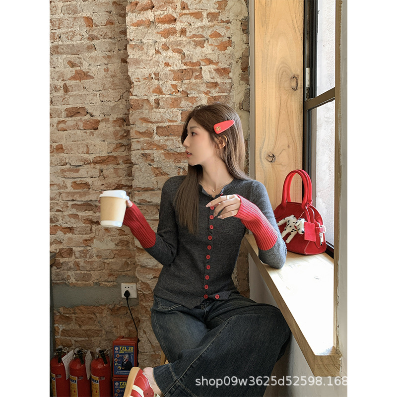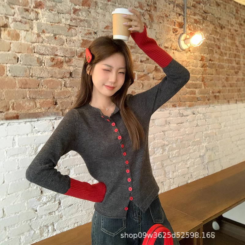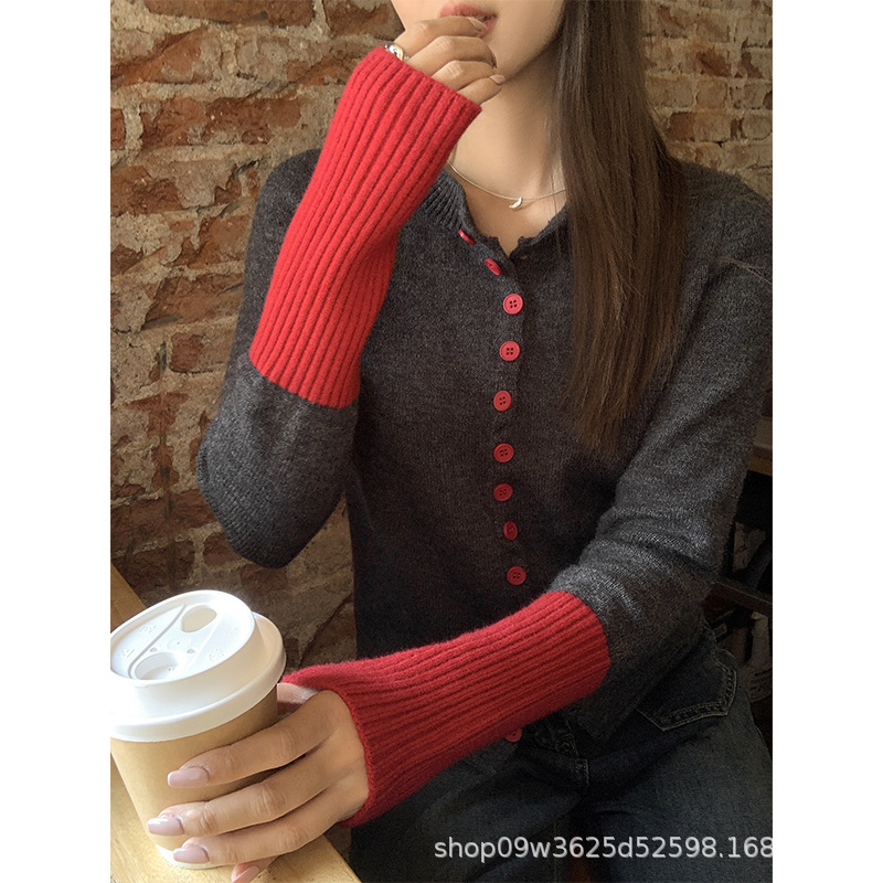 세련된 대비 색상 디자인 센스 니트 카디건 재킷 여성 가을 및 겨울 새로운 달콤한 슬림 핏 슬리밍 긴팔 니치 탑스토어 가기