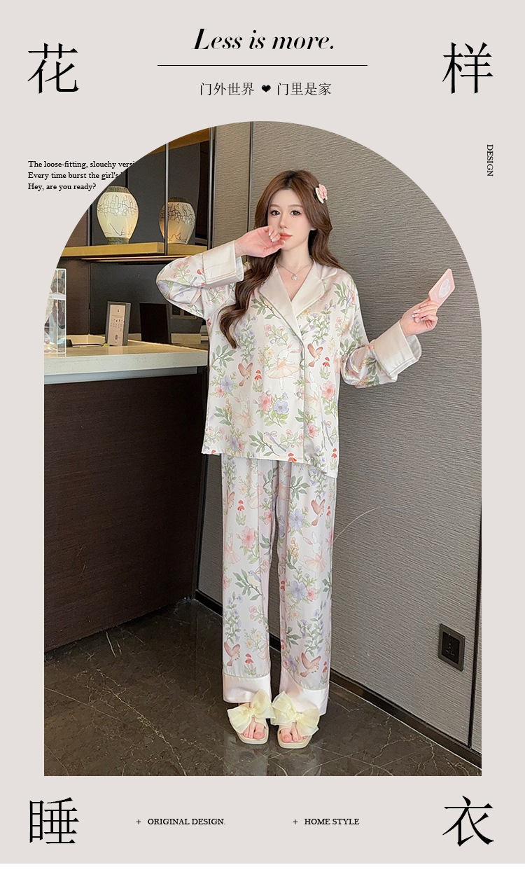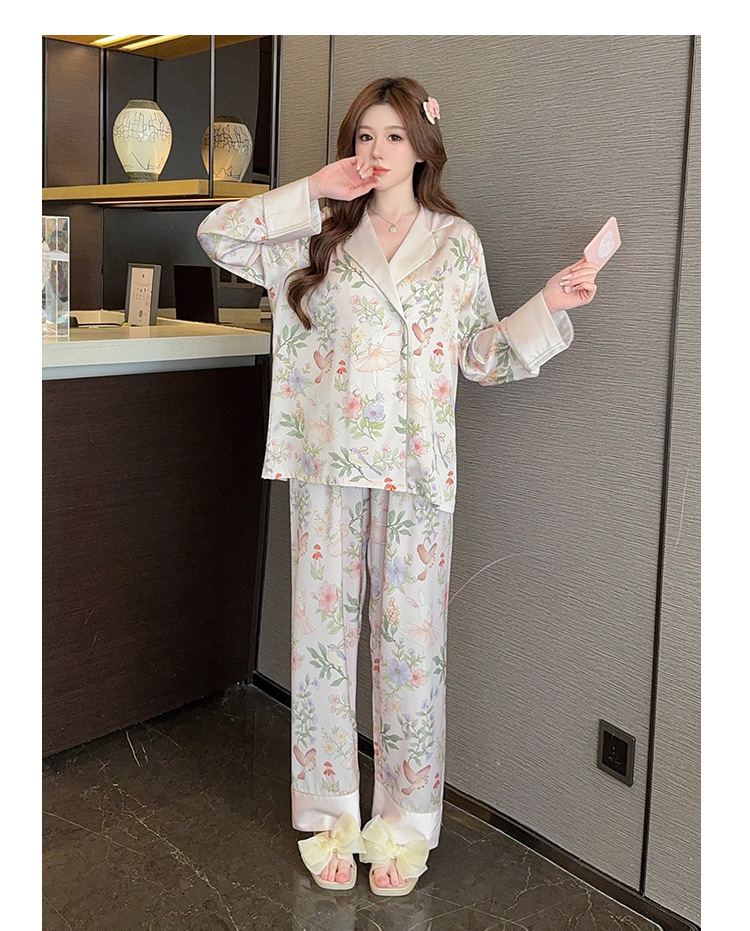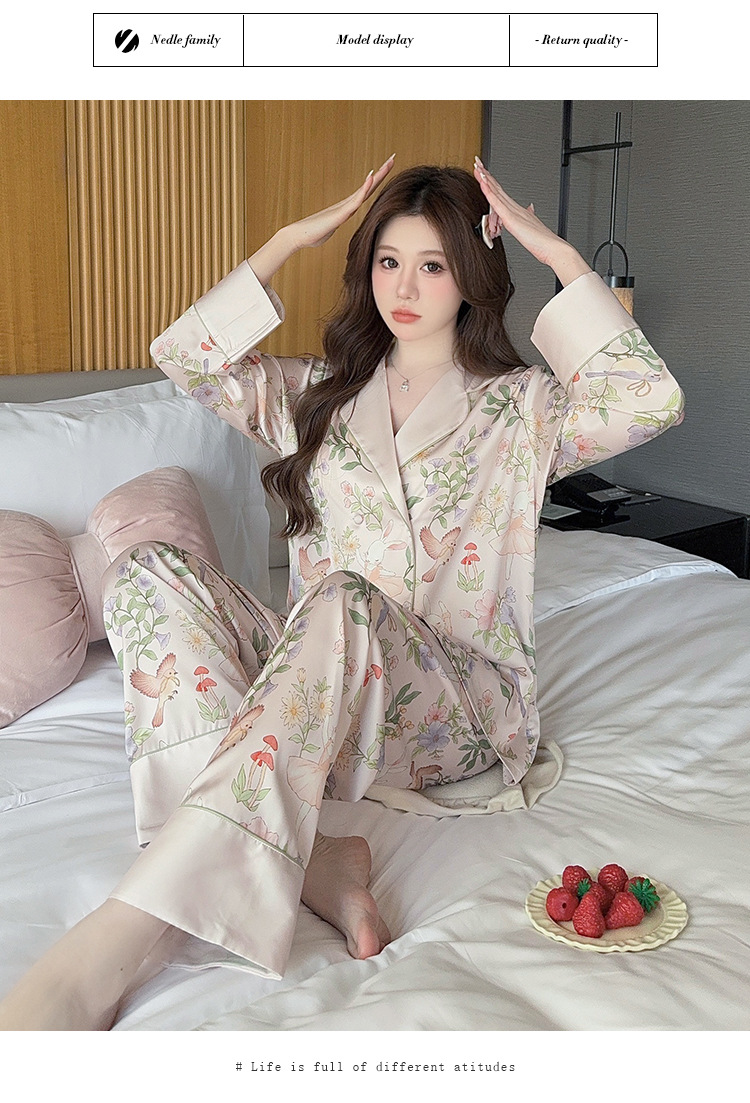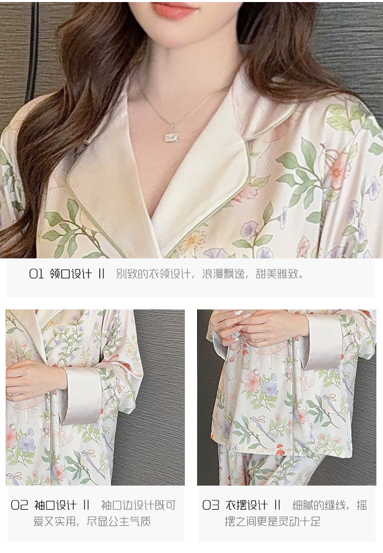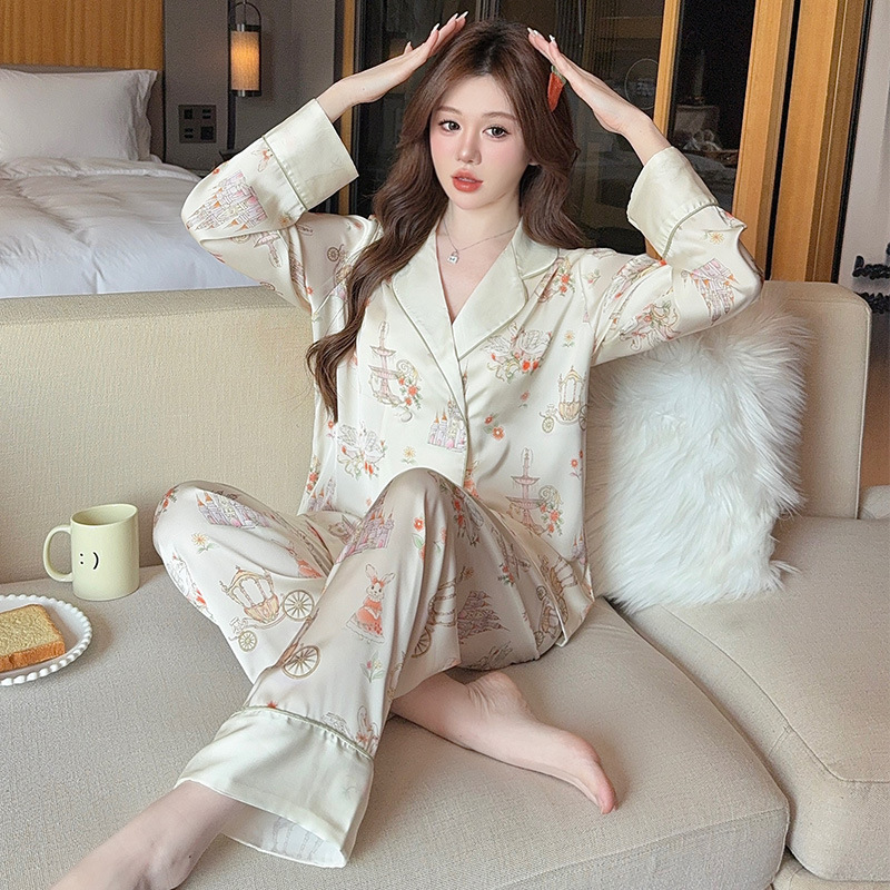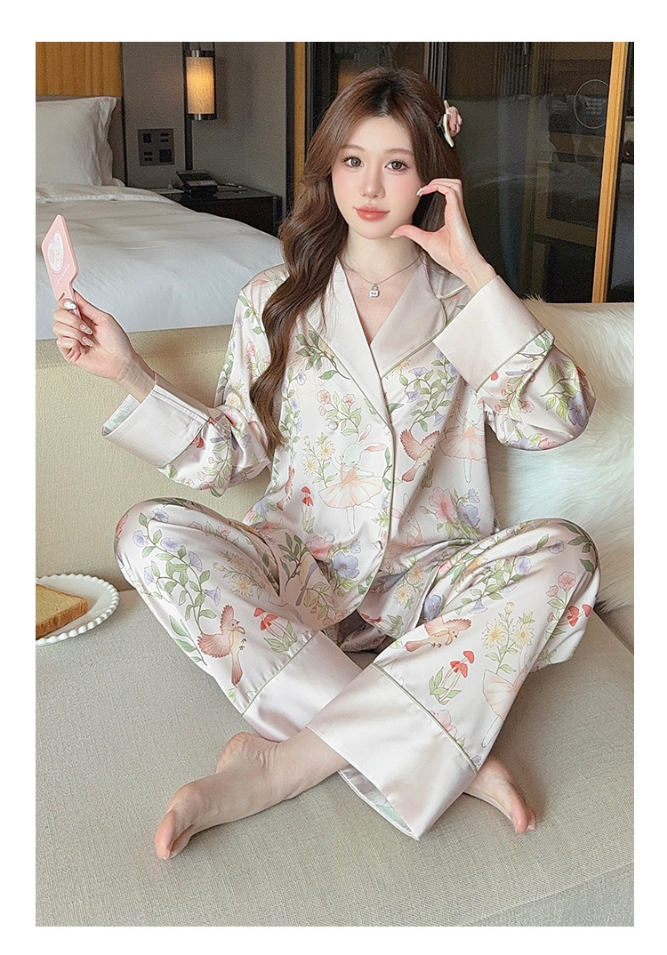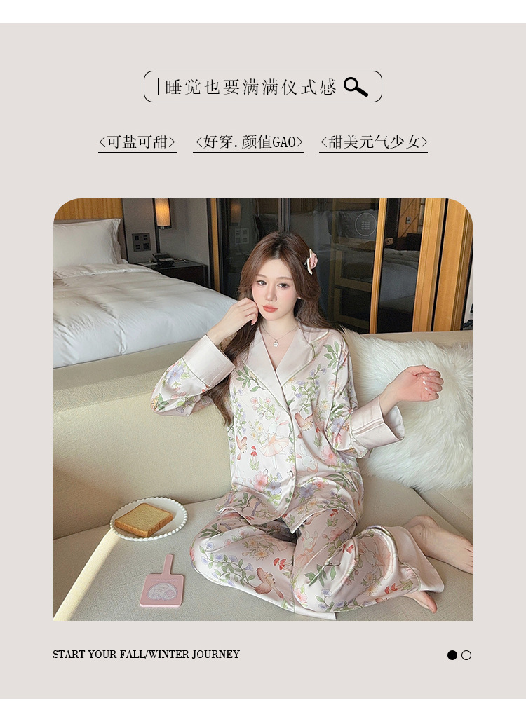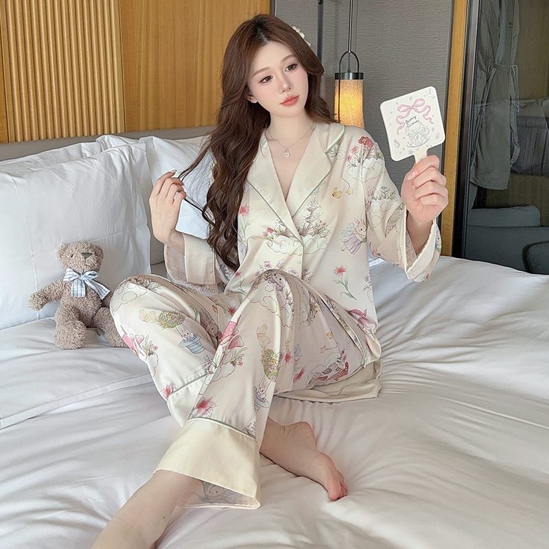 아이스 실크 파자마 여성의 봄과 가을 새로운 모조 실크 긴팔 카디건 세트 봄과 여름 하이 엔드 프랑스 스타일 홈 의류스토어 가기