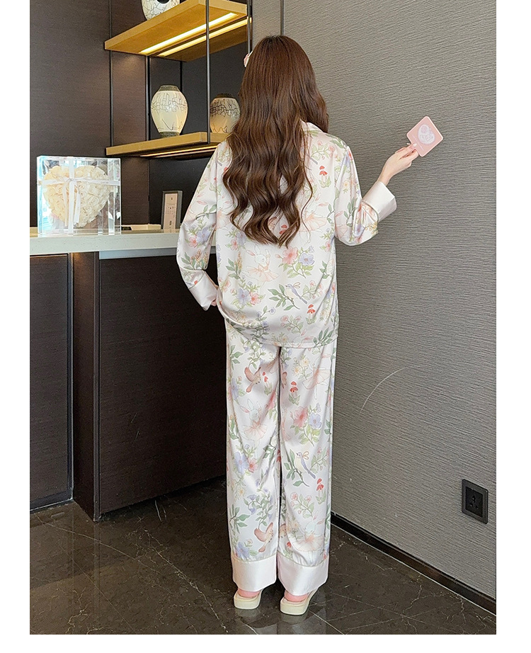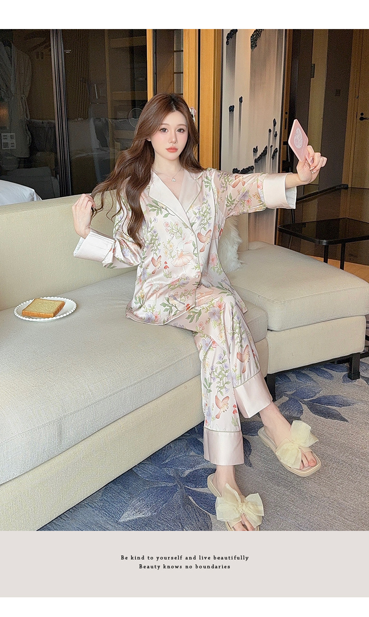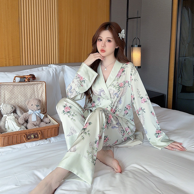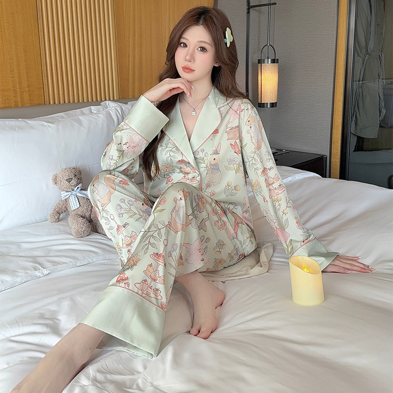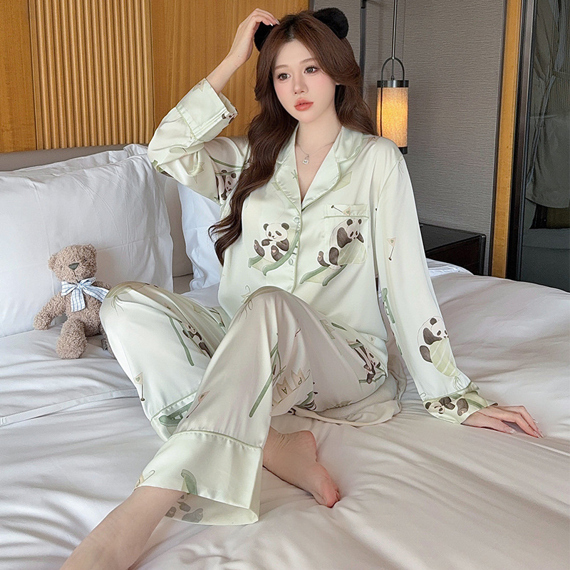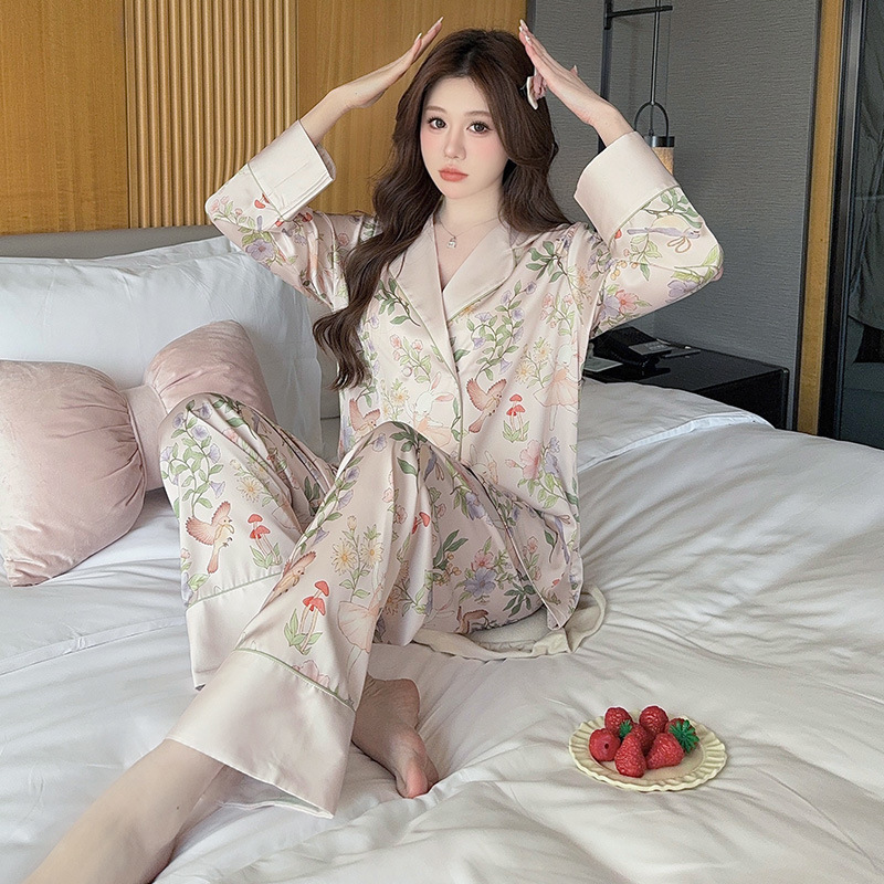 아이스 실크 파자마 여성의 봄과 가을 새로운 모조 실크 긴팔 카디건 세트 봄과 여름 하이 엔드 프랑스 스타일 홈 의류