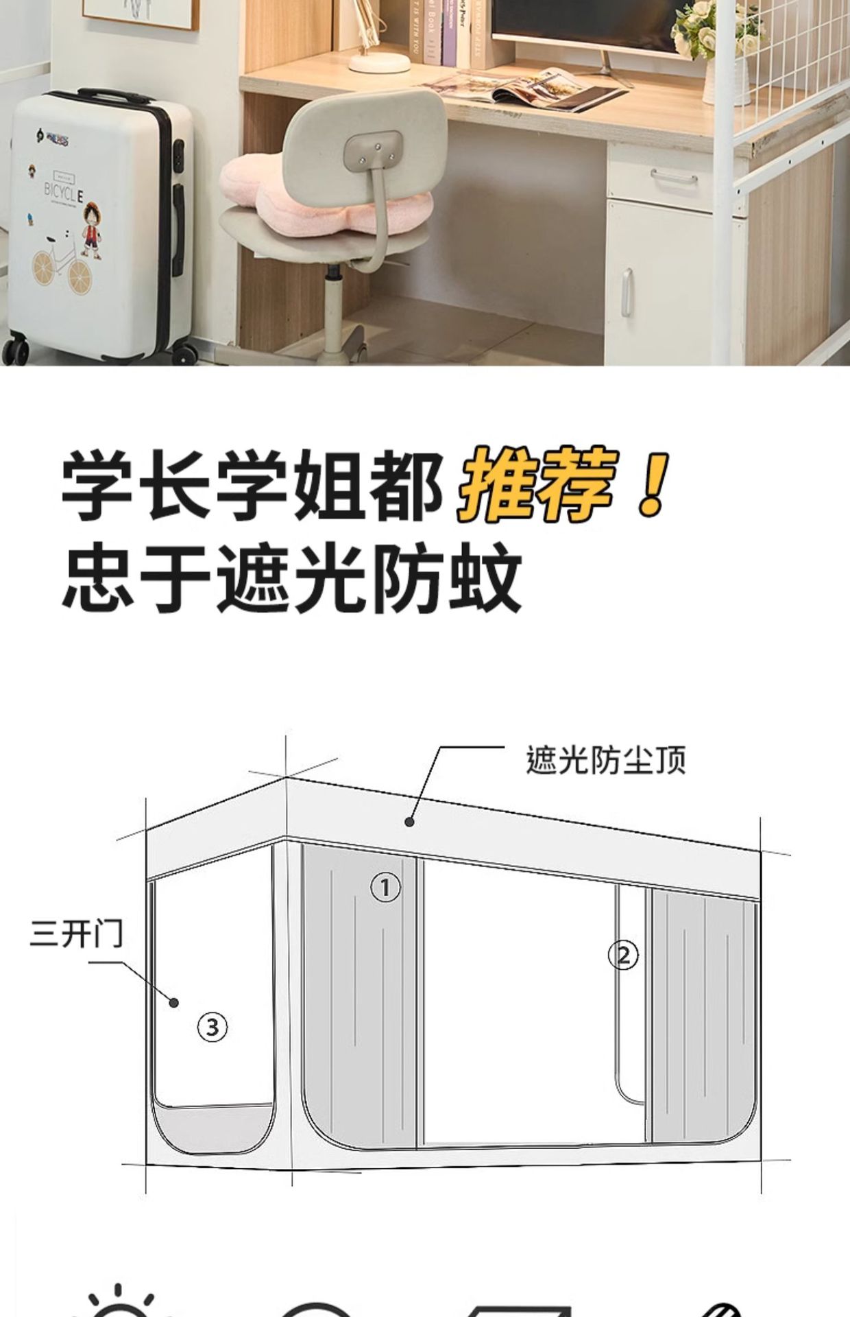 • [길이 190x가로 90x높이 90] 모기장 일체형 커튼 3개 + 상단 5면 강한 차광 [이층침대 범용]