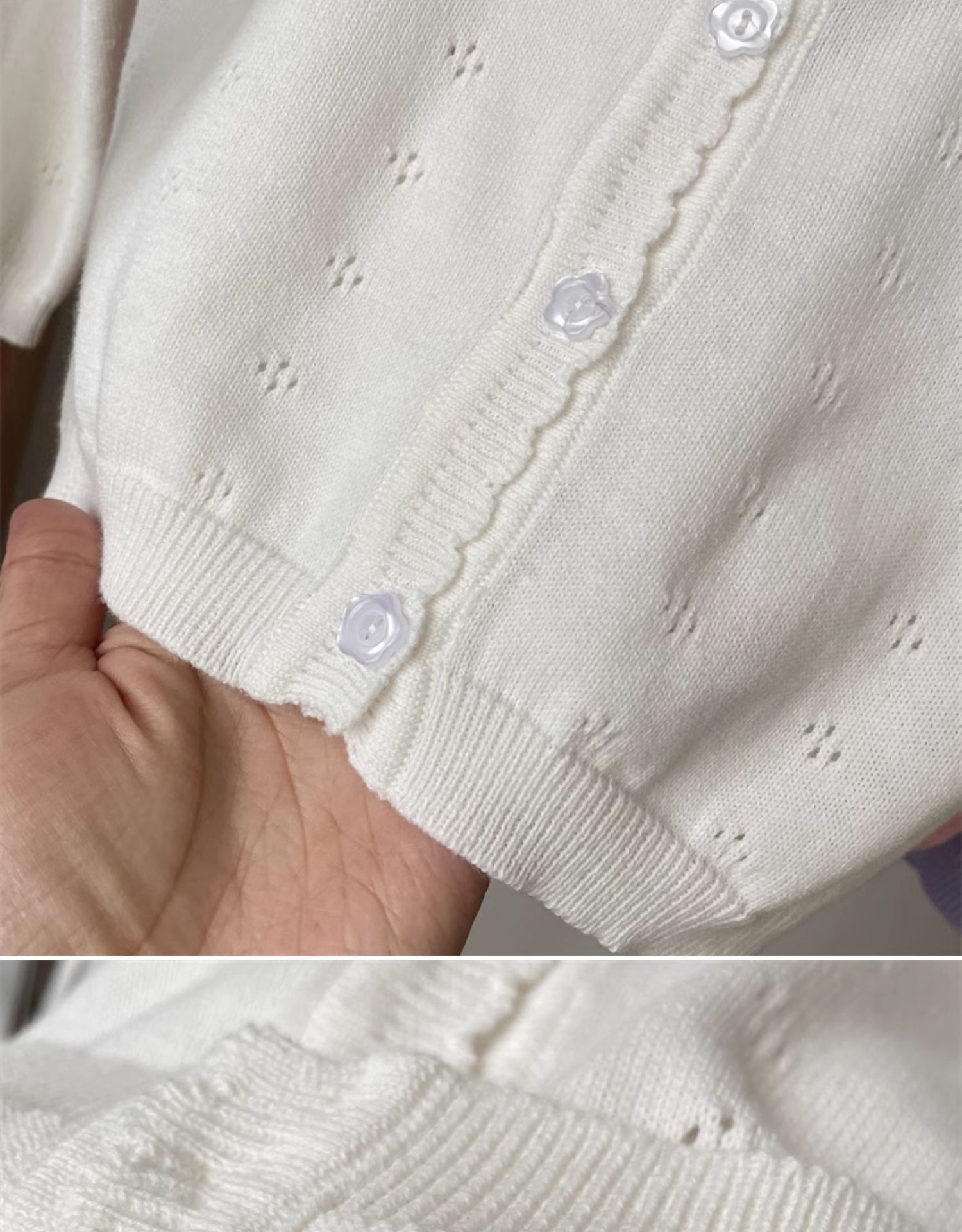 • 흰색 속이 빈 곰팡이 가장자리 니트 가디건