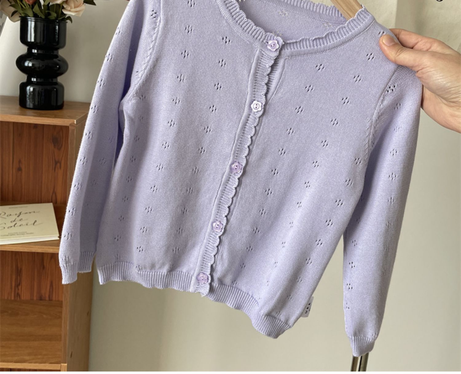 • Yunxia 보라색 중공 곰팡이 가장자리 니트 가디건