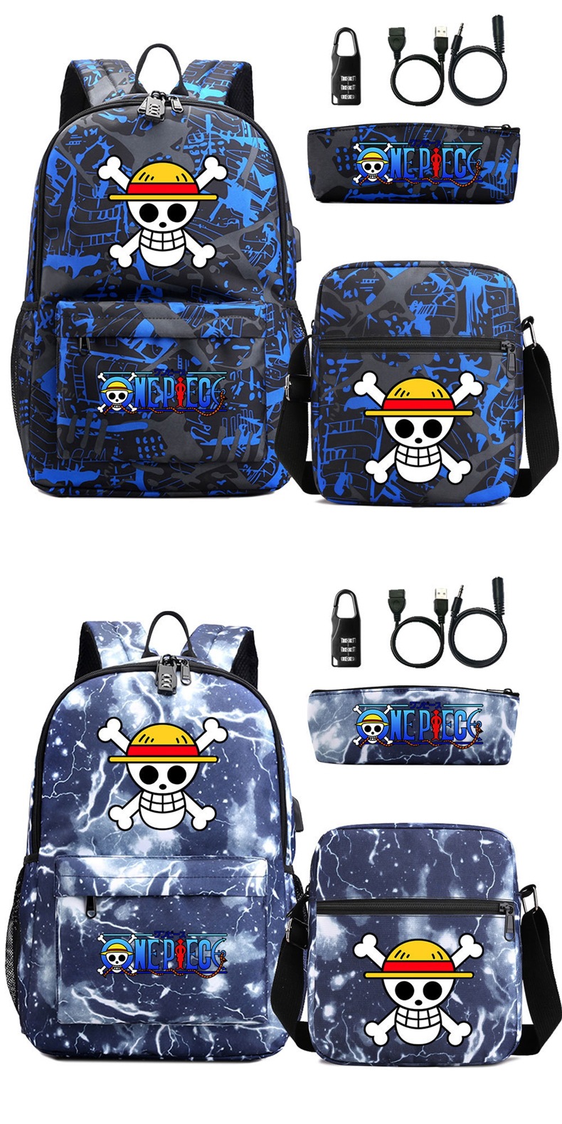 만화 데이 맨 원피스 USB 비밀번호 잠금 십대 학생 스쿨백 3 피스 세트 남성과 여성의 배낭 세트스토어 가기