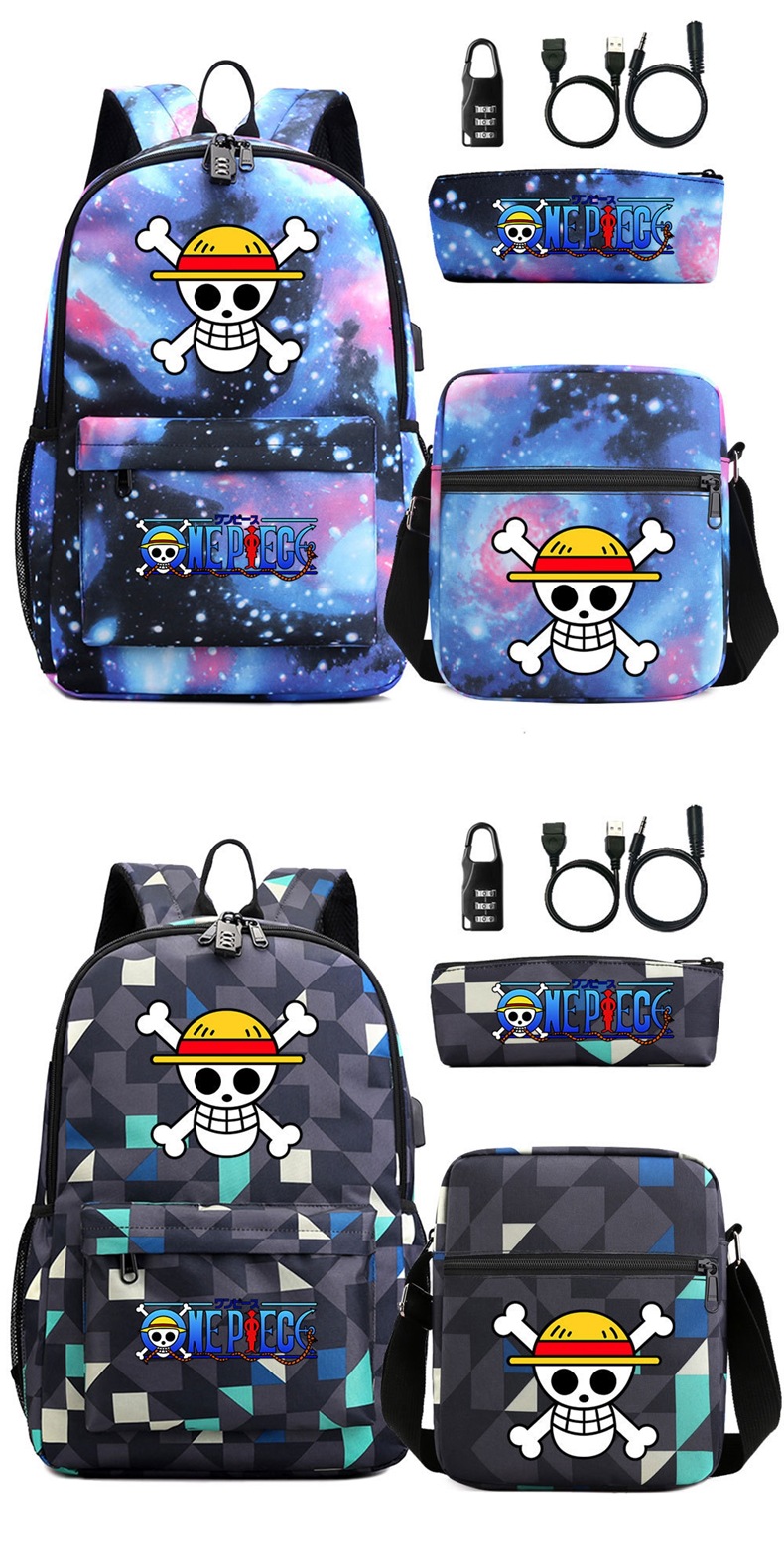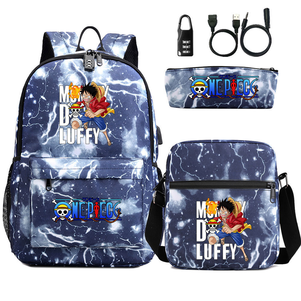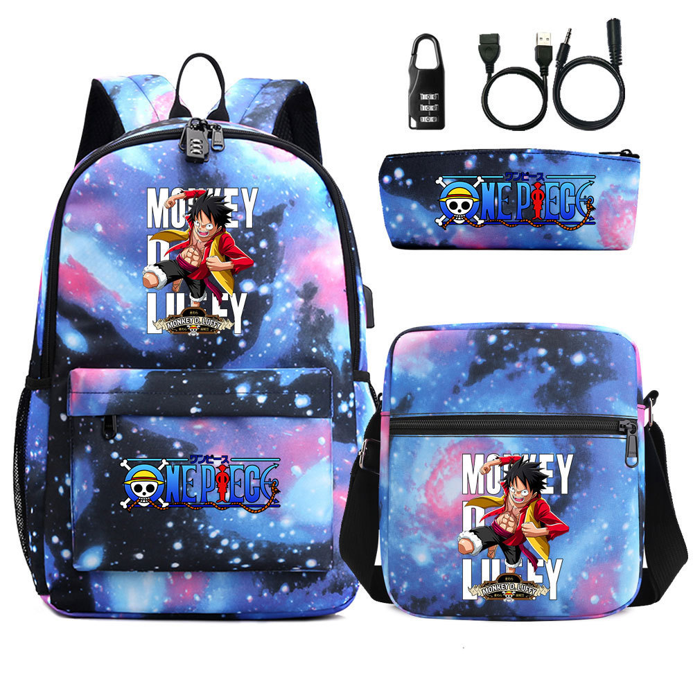 만화 데이 맨 원피스 USB 비밀번호 잠금 십대 학생 스쿨백 3 피스 세트 남성과 여성의 배낭 세트