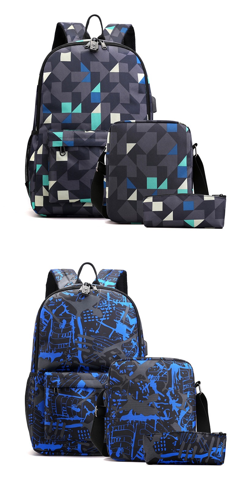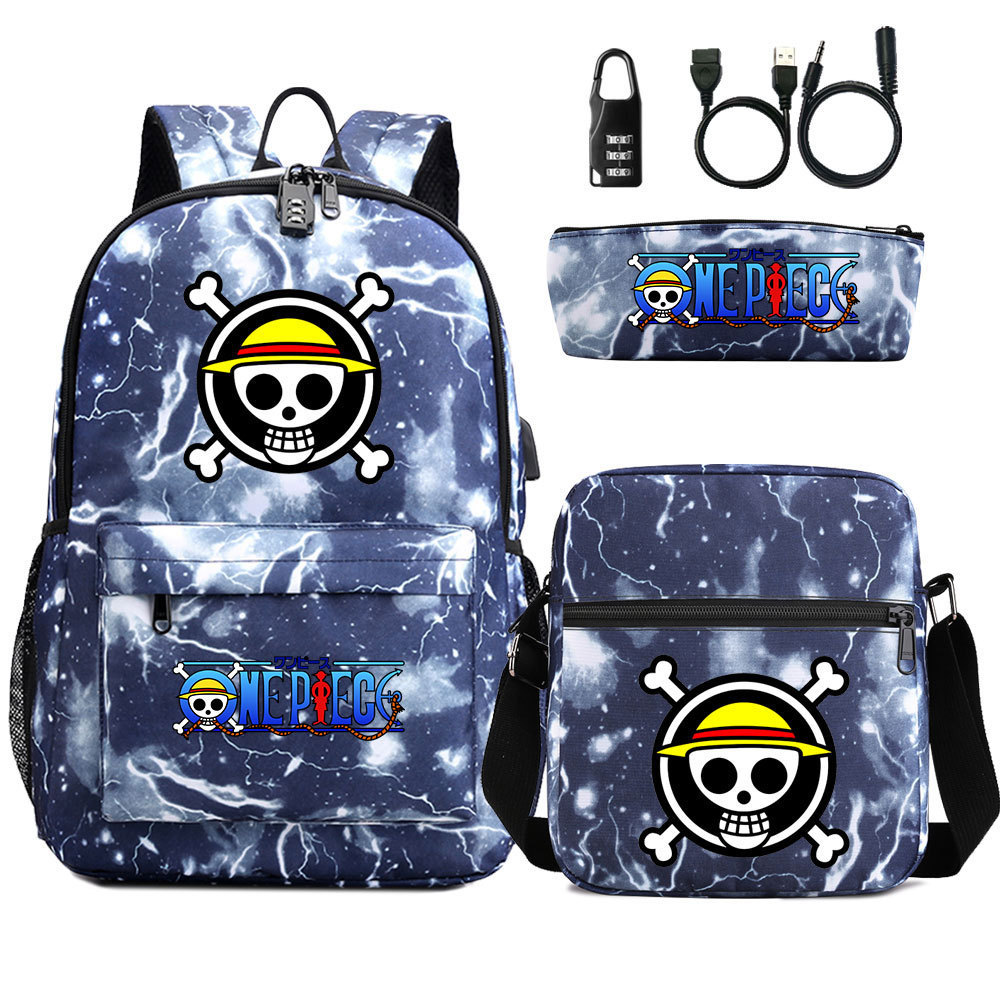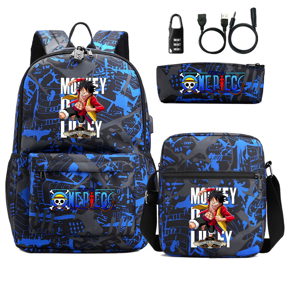 만화 데이 맨 원피스 USB 비밀번호 잠금 십대 학생 스쿨백 3 피스 세트 남성과 여성의 배낭 세트