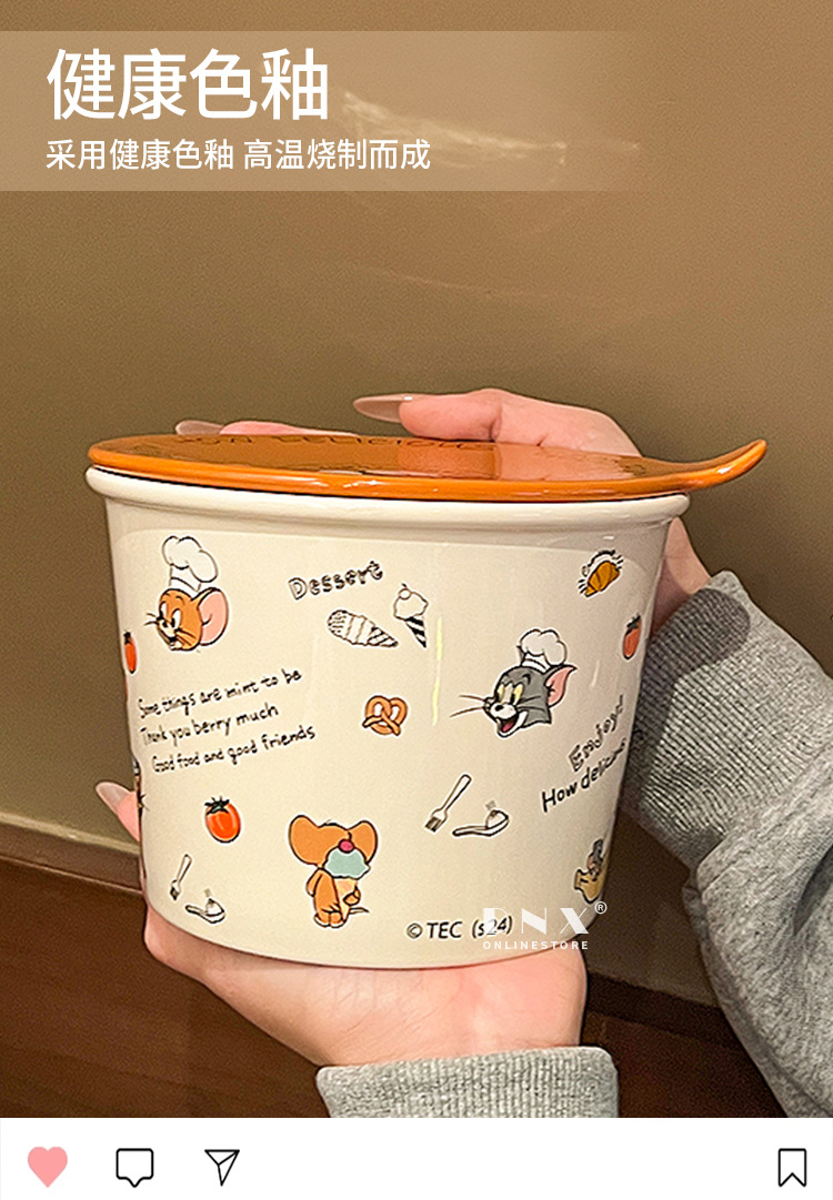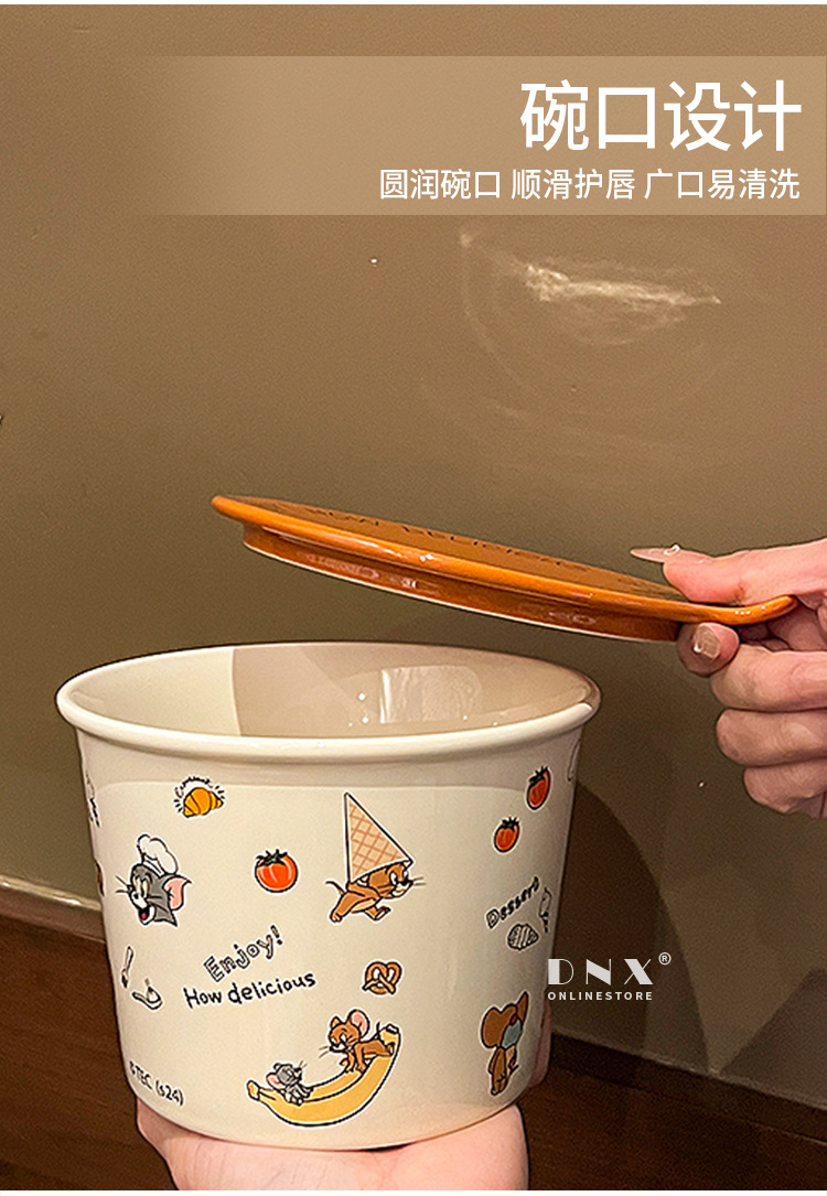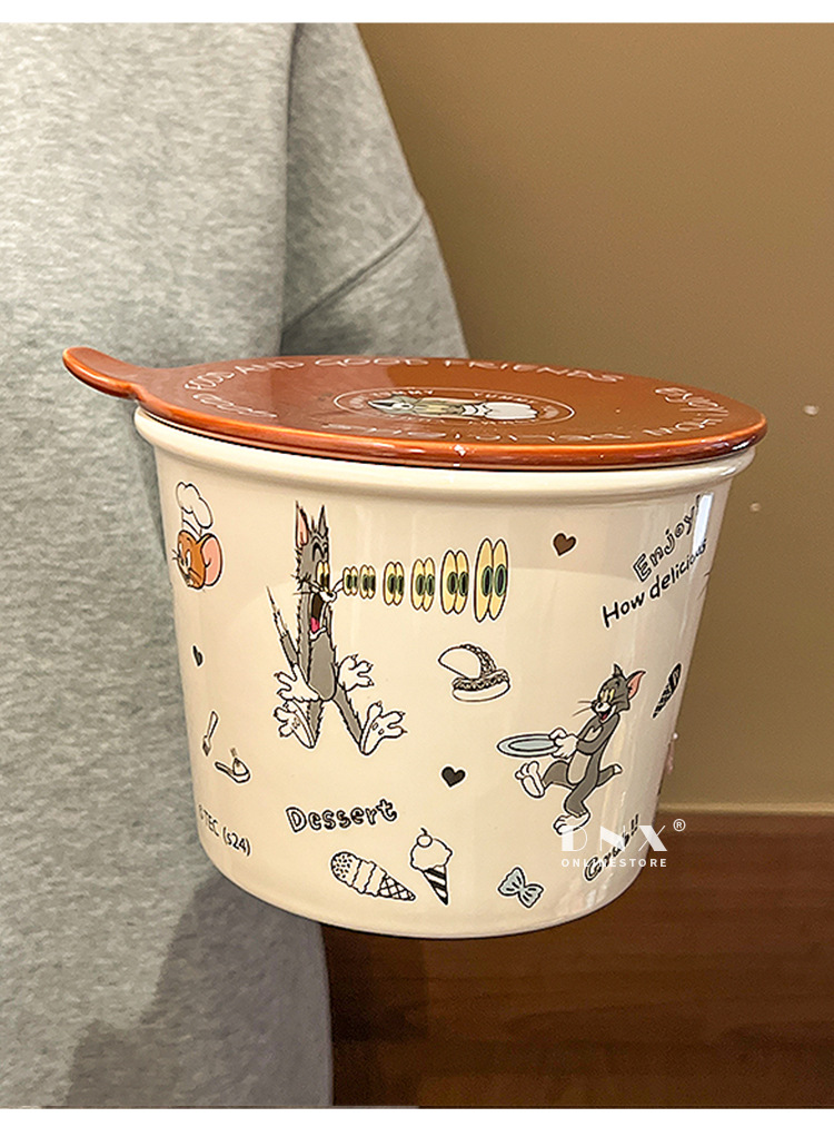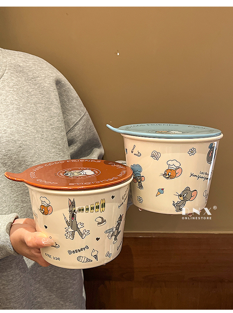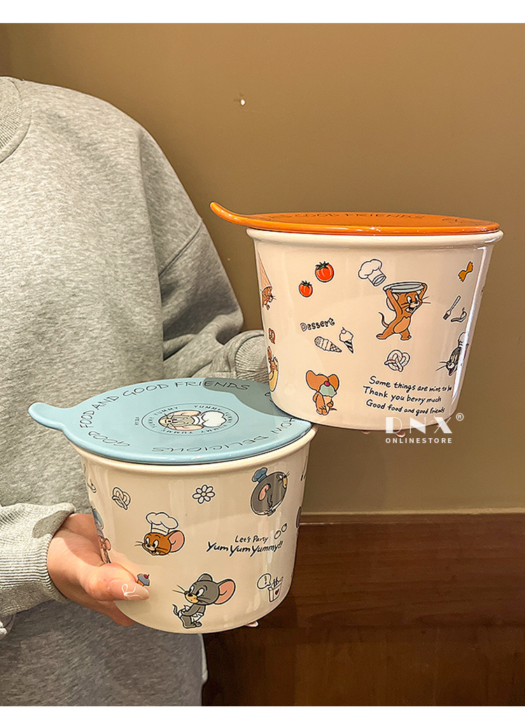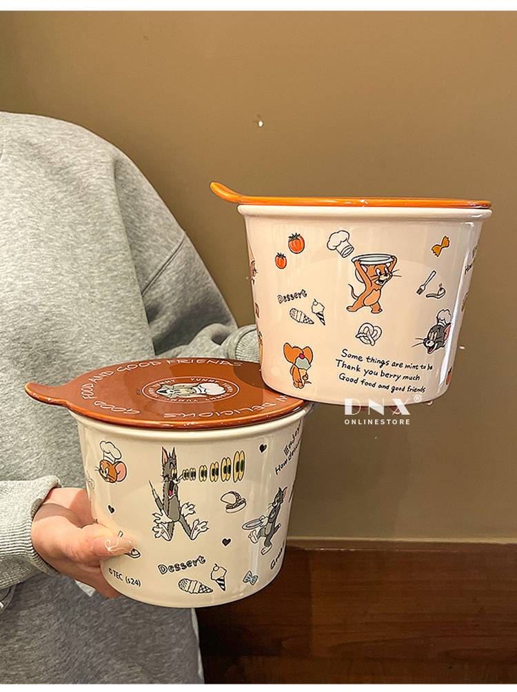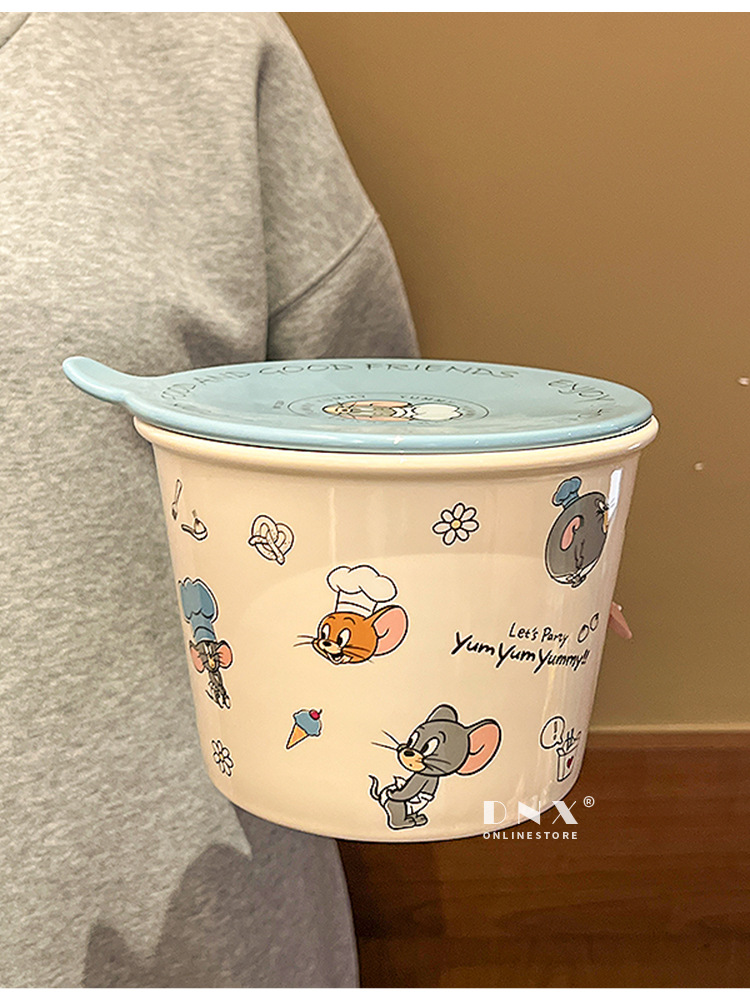 고양이와 마우스 새로운 세라믹 즉석 국수 그릇 귀여운 뚜껑 인스턴트 국수 그릇 샐러드 그릇 학생 기숙사 국수 그릇 고온 저항
