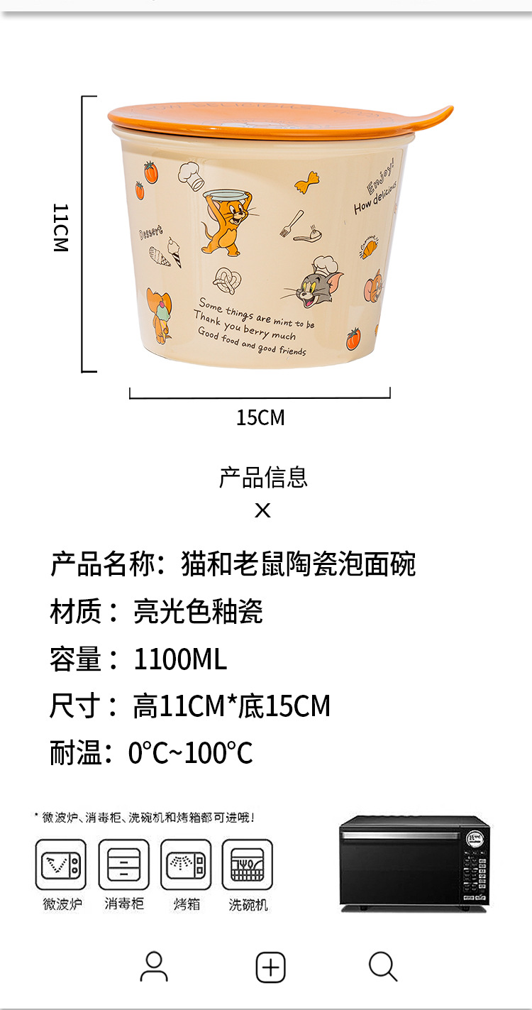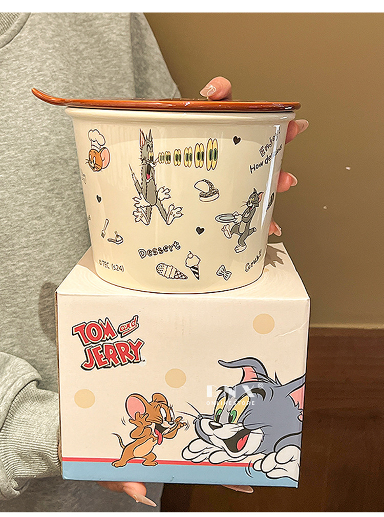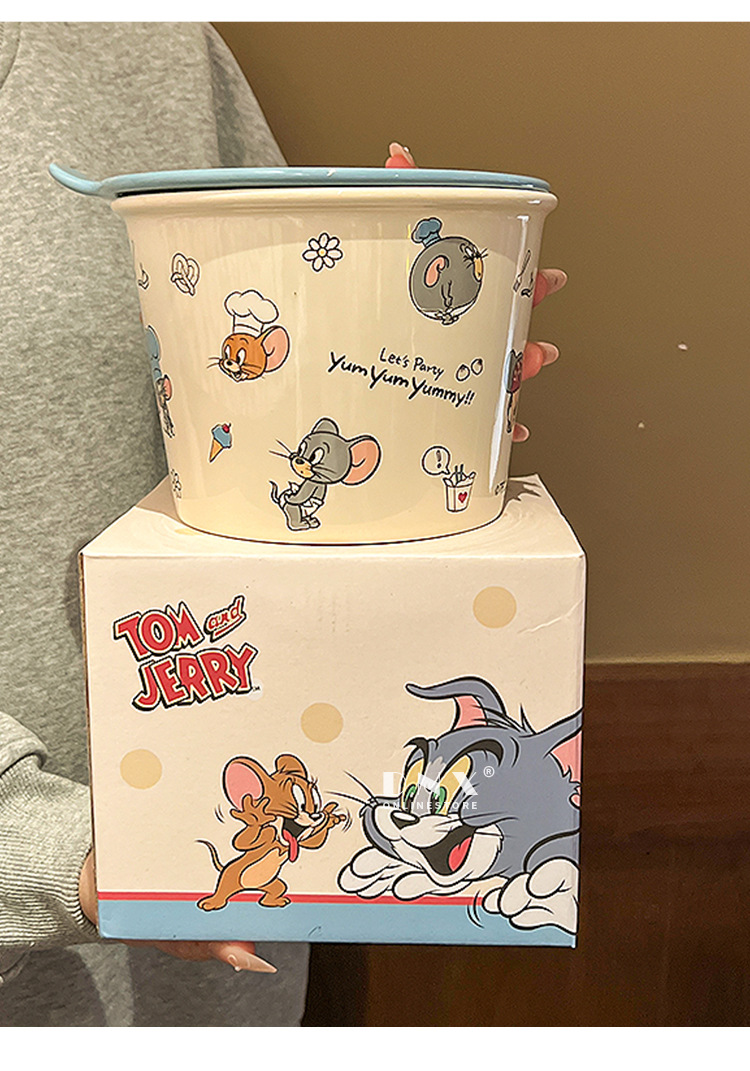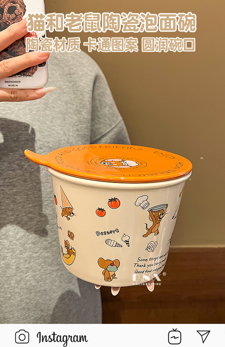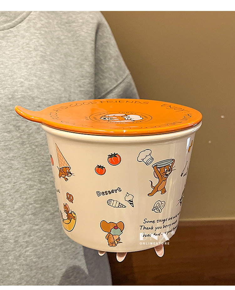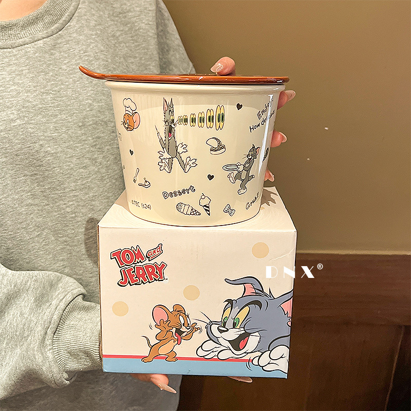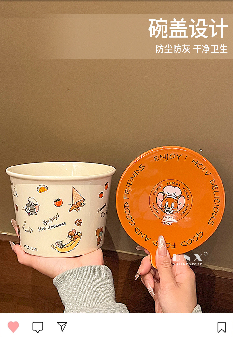 고양이와 마우스 새로운 세라믹 즉석 국수 그릇 귀여운 뚜껑 인스턴트 국수 그릇 샐러드 그릇 학생 기숙사 국수 그릇 고온 저항