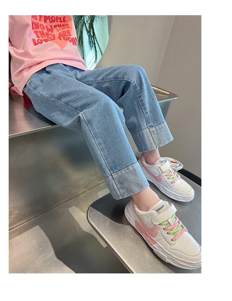 여성용 아동복 스트레이트 롱 바지 아동용 콘트라스트 컬러 청바지 소녀 서양식 캐주얼 바지 아기의 2025 년 봄 새 도착스토어 가기