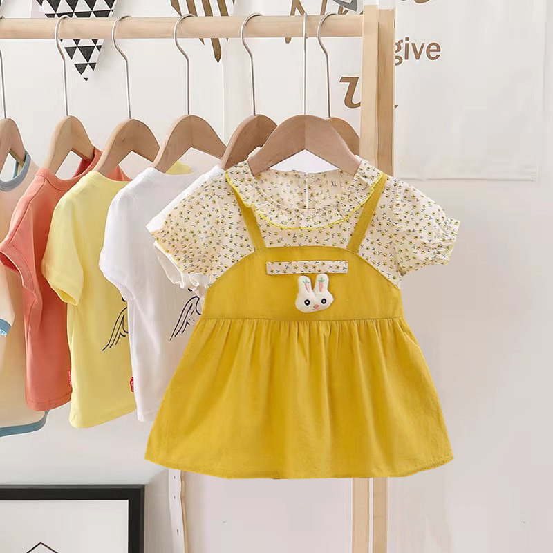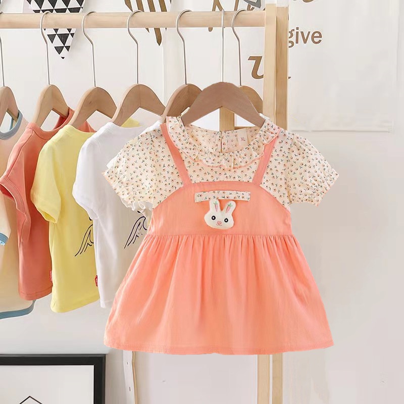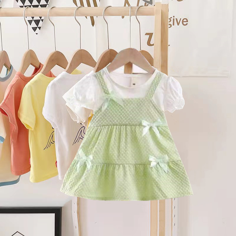 2024 년 여름 새 소녀 면 가짜 투피스 원피스 한국 어린이 반팔 원피스 만화 원피스스토어 가기