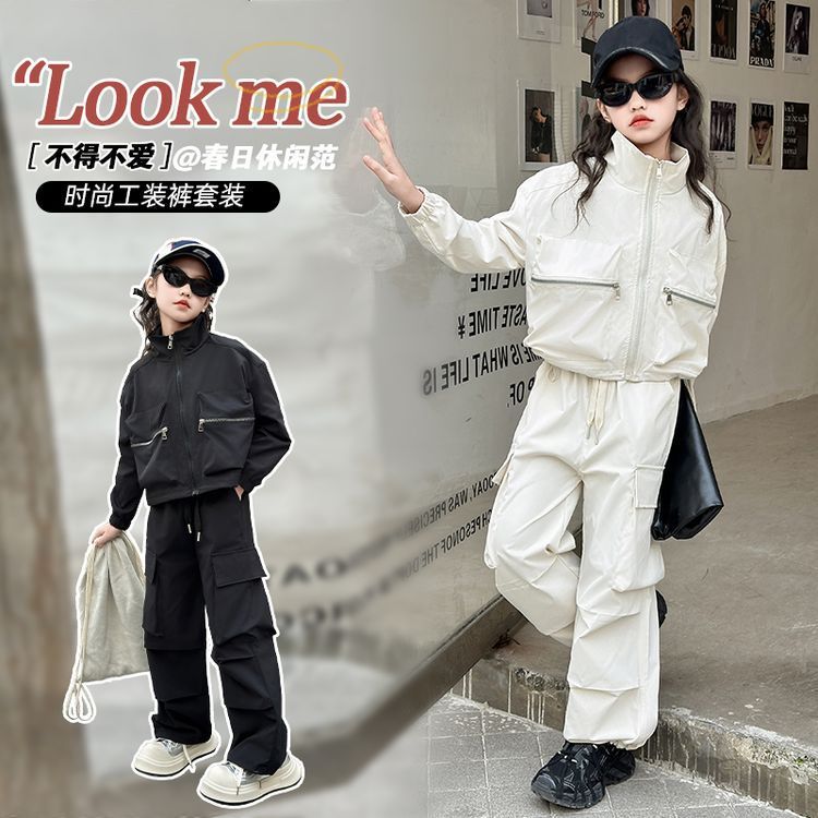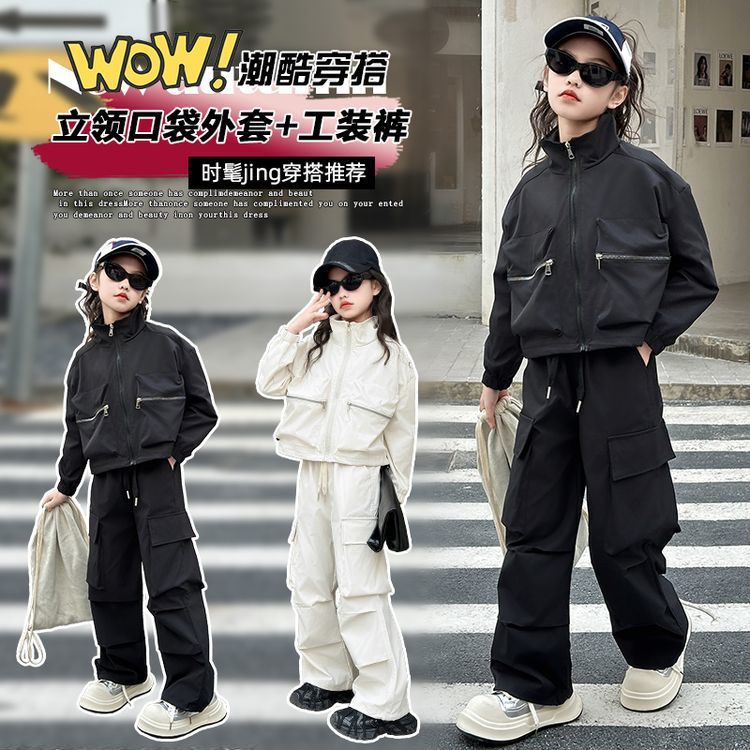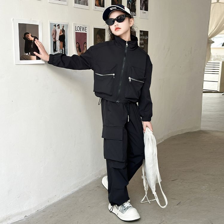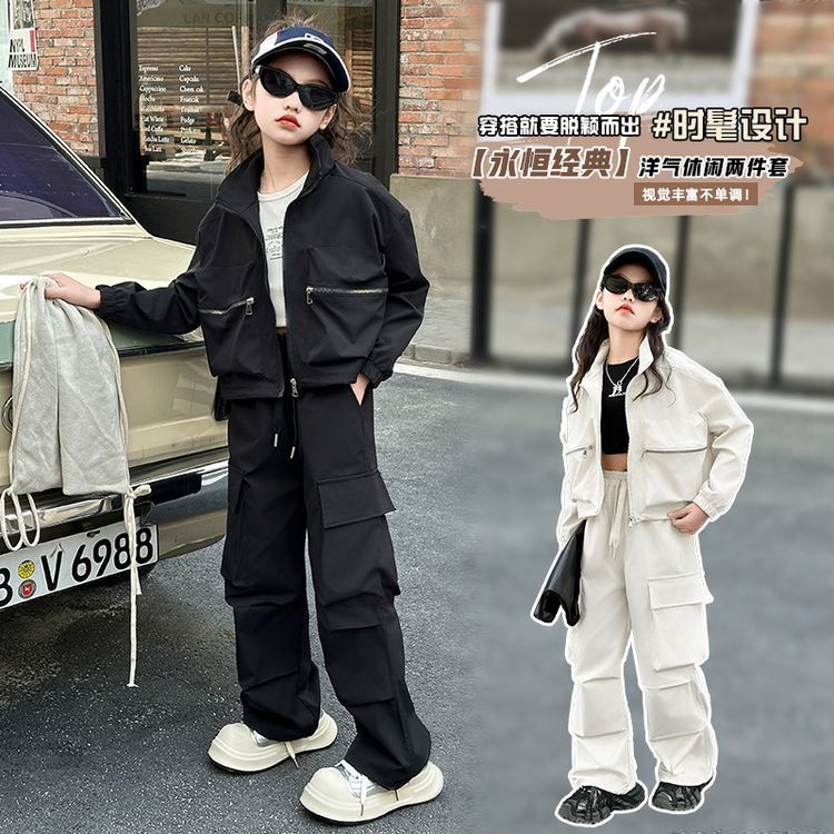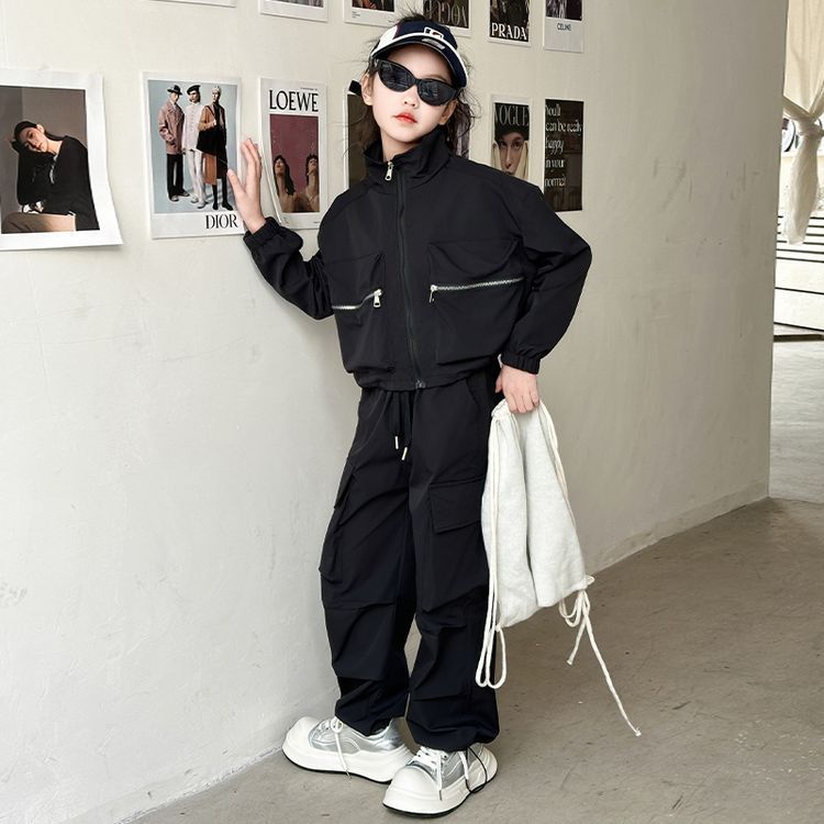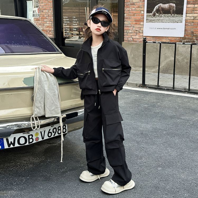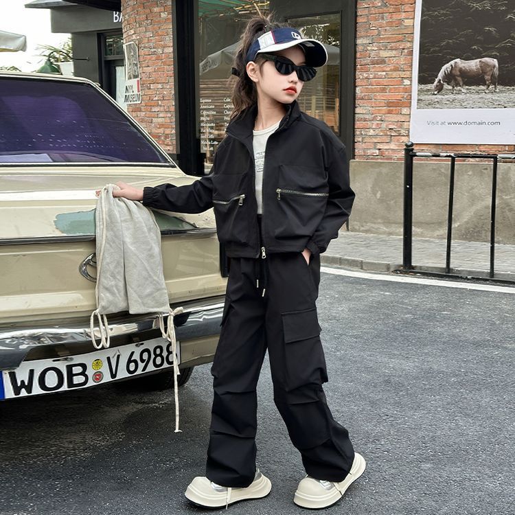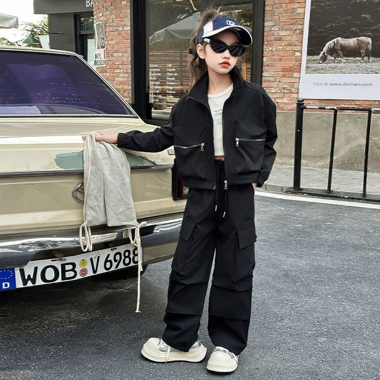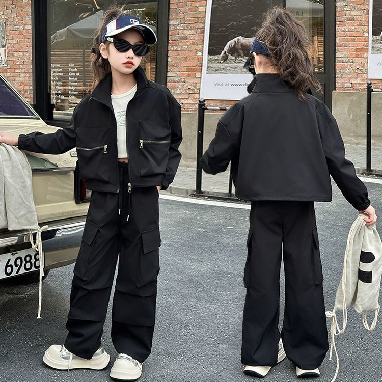블랙 루즈 후드 스웨트 걸스 세트 2025 새로운 와이드 레그 팬츠 2 피스 스포츠 긴 바지