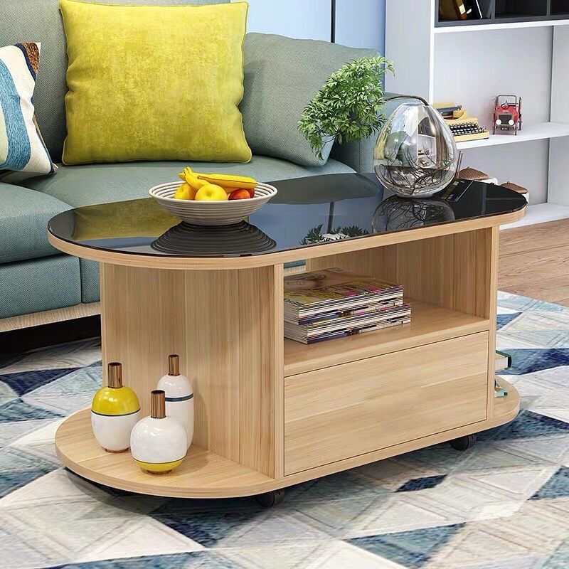 커피 테이블 작은 아파트 현대 간단한 이동식 타원형 유리 커피 테이블 롤러 경제적 인 다기능 차 테이블