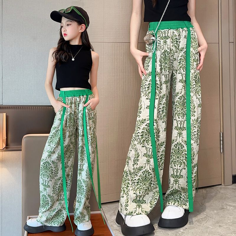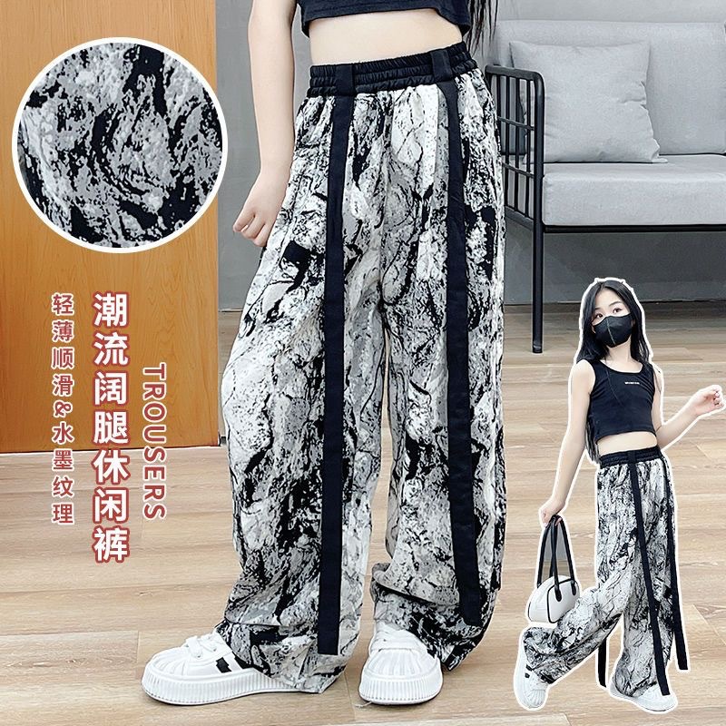 소녀 넓은 다리 바지 여름 한국 스타일 작은 소녀 얇은 스트랩 타이-염료 시원하고 세련된 착용 바지 도매 트렌디