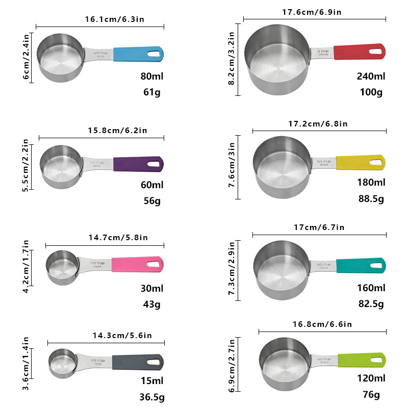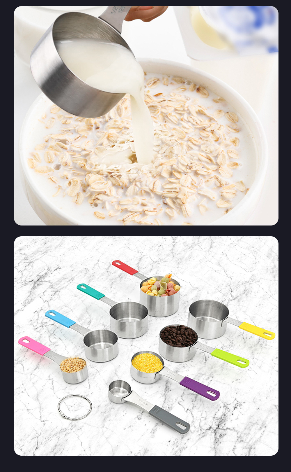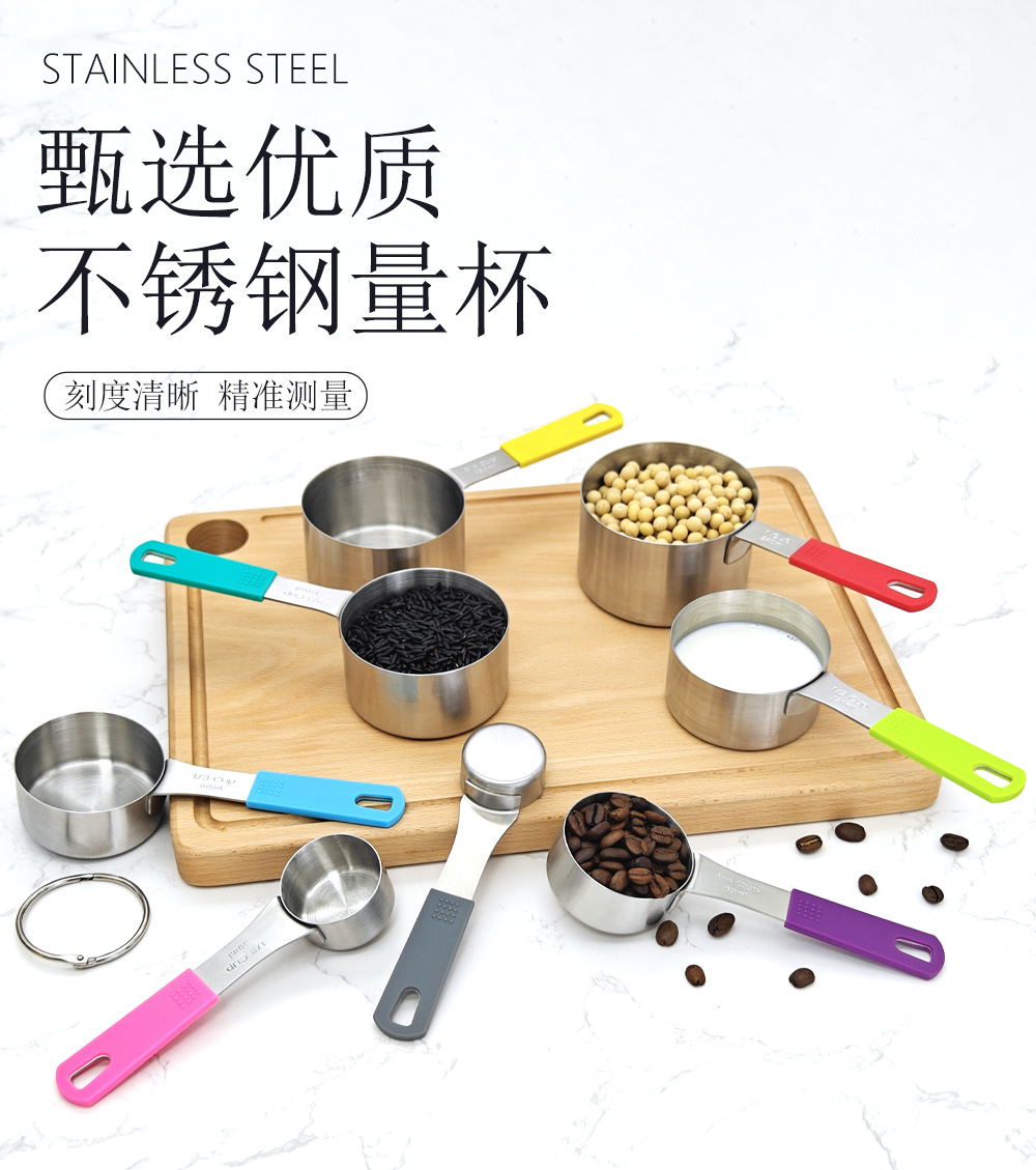 베이킹 도구 스테인레스 스틸 측정 컵 8 조각 세트 스케일 실리콘 핸들 조미료 커피 우유 측정 컵 스푼 세트 측정