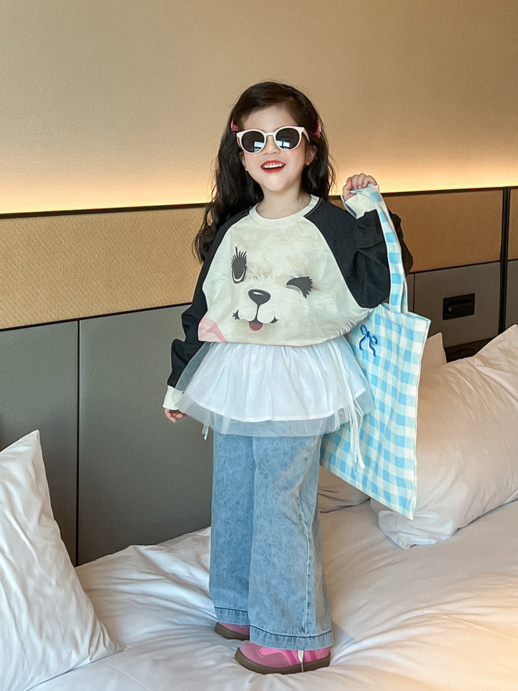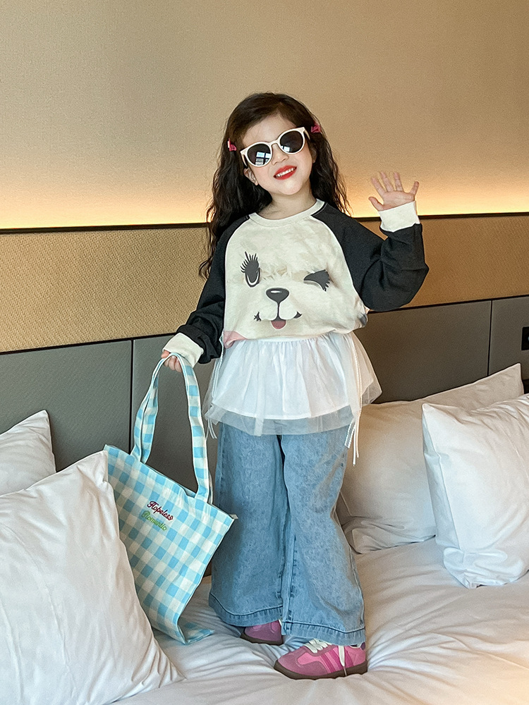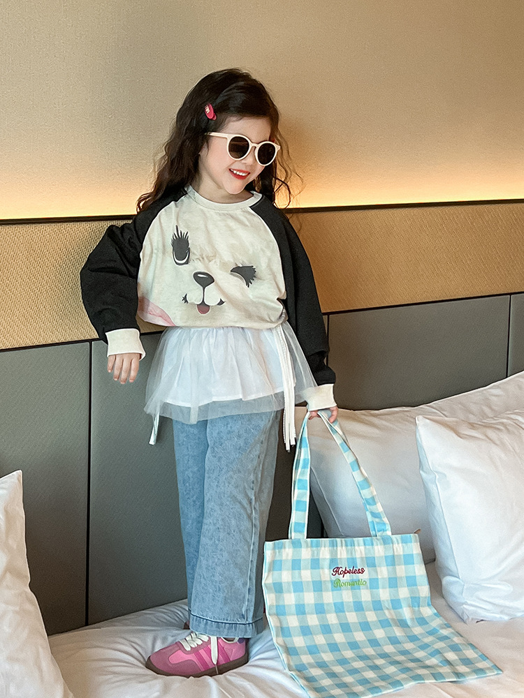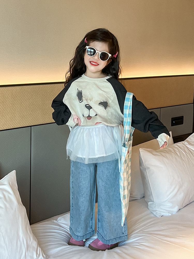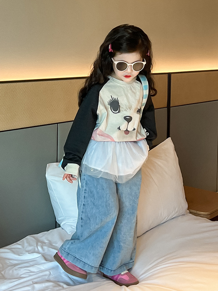 소녀 귀여운 어린 시절 봄 세트 2025 컬러 매칭 만화 T 슬리브 탑 메쉬 방귀 커튼 올 매치 청바지 트렌디스토어 가기
