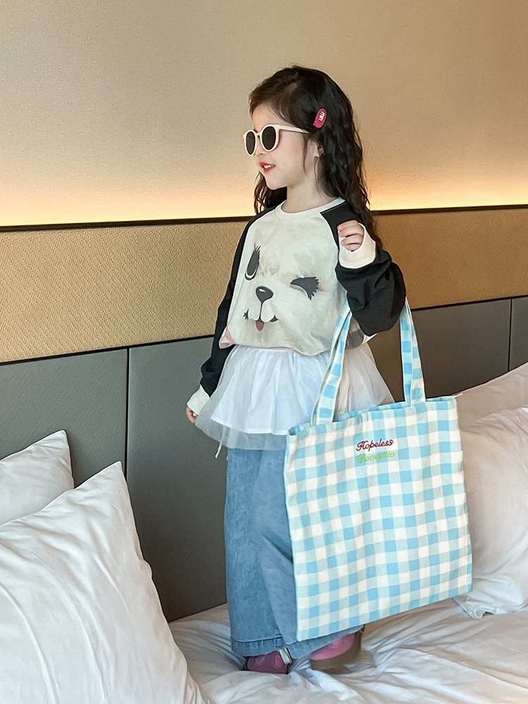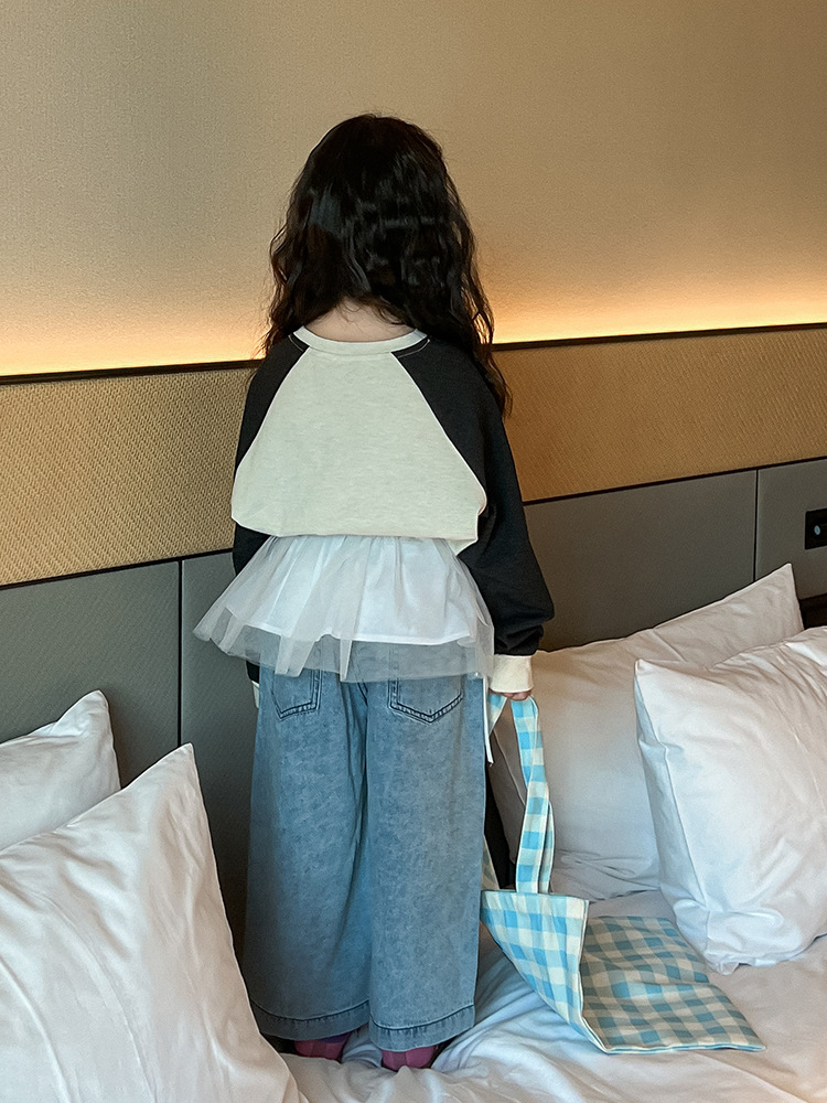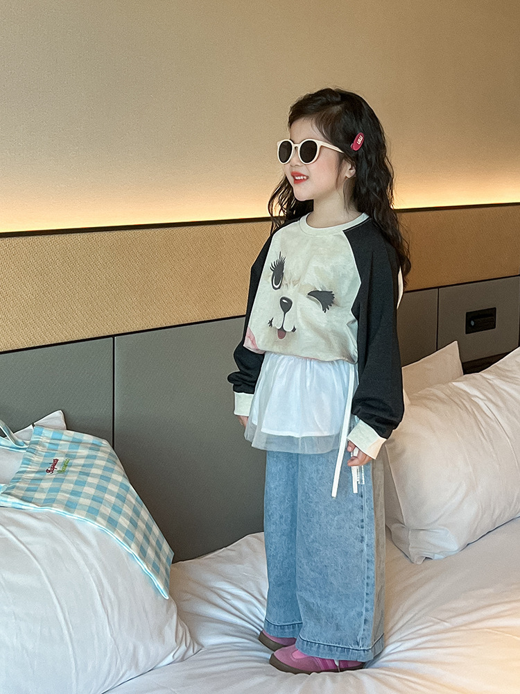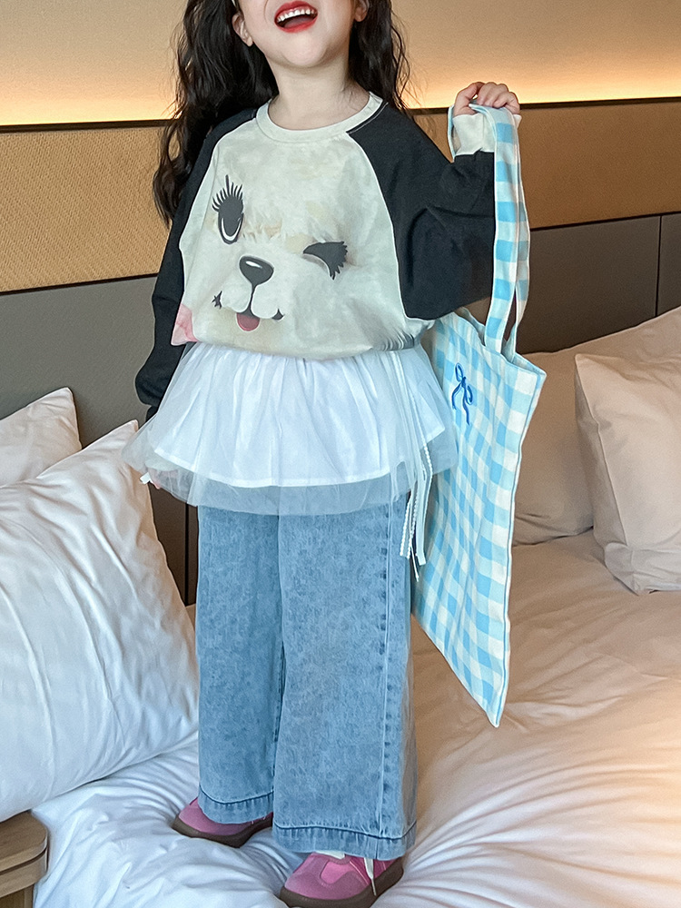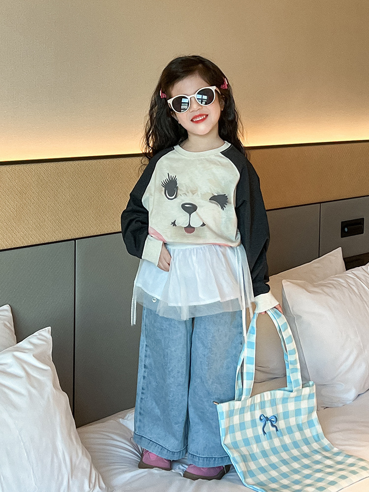 소녀 귀여운 어린 시절 봄 세트 2025 컬러 매칭 만화 T 슬리브 탑 메쉬 방귀 커튼 올 매치 청바지 트렌디스토어 가기