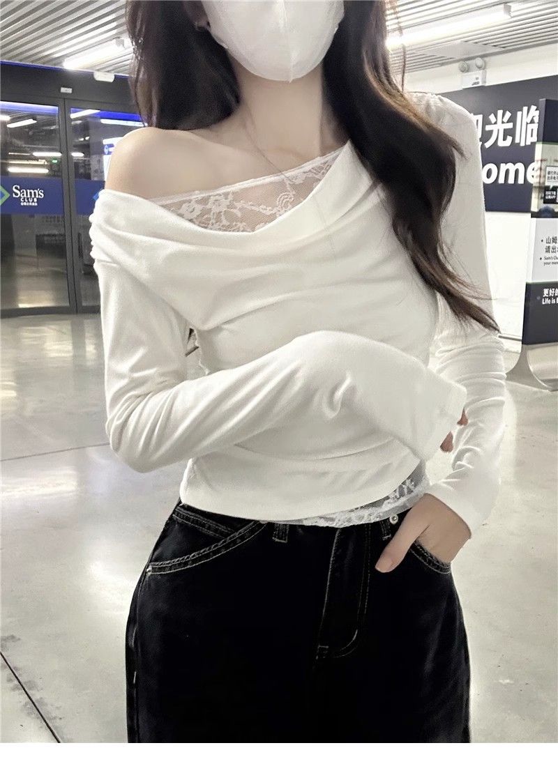 레이스 스티칭 슬랜트 숄더베이스 셔츠 티셔츠 여성용 봄과 가을 새로운 디자인 센스 슬림 핏 슬림 핏 이너 쇼트 탑 트렌디