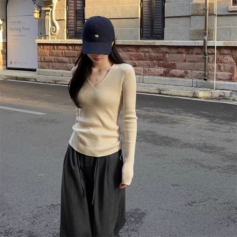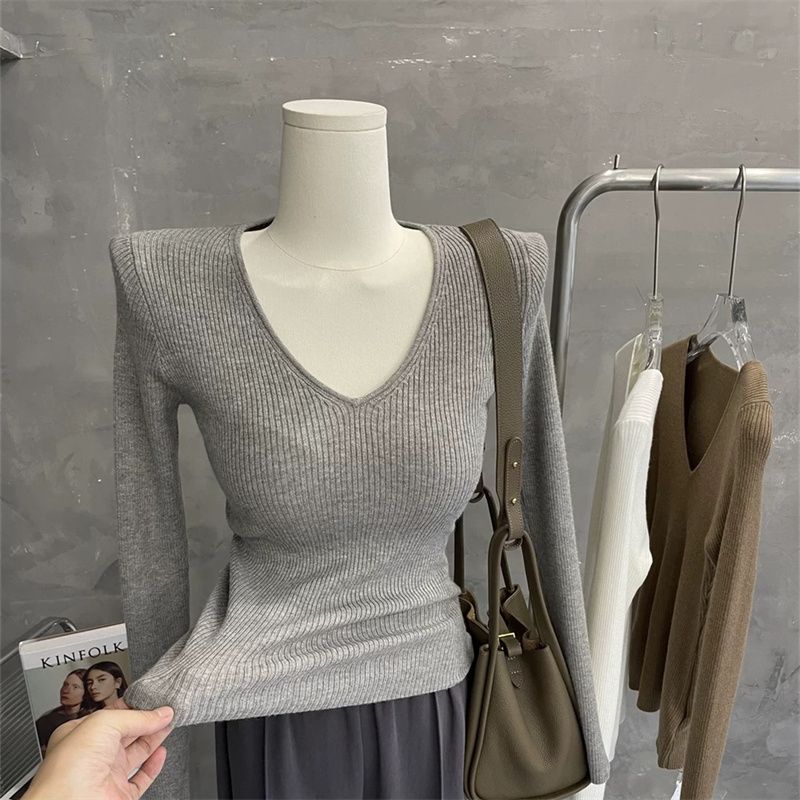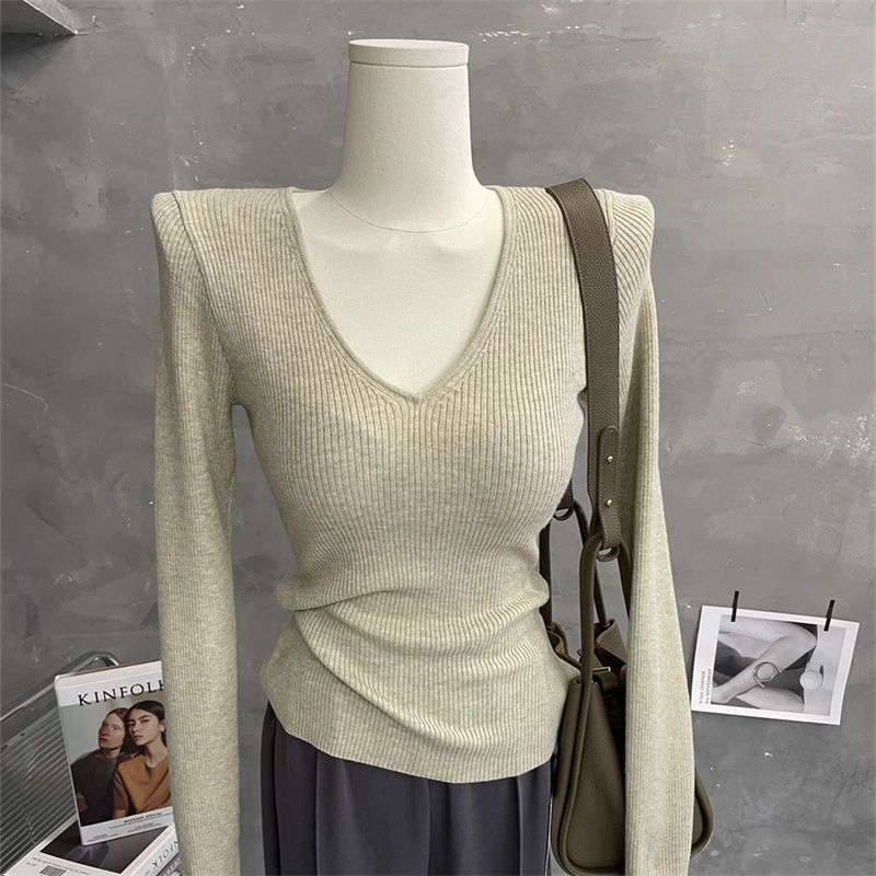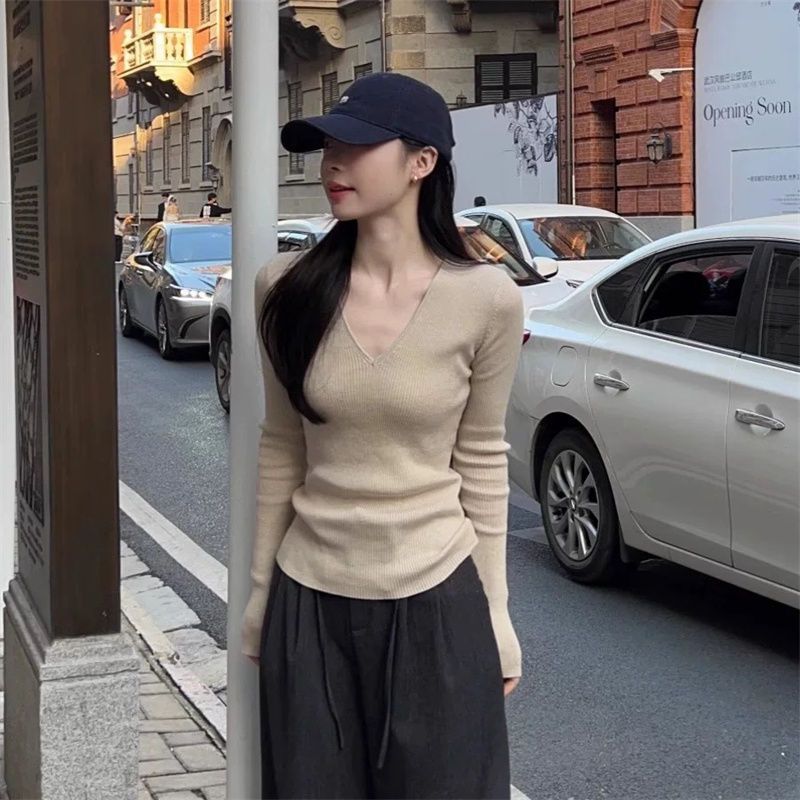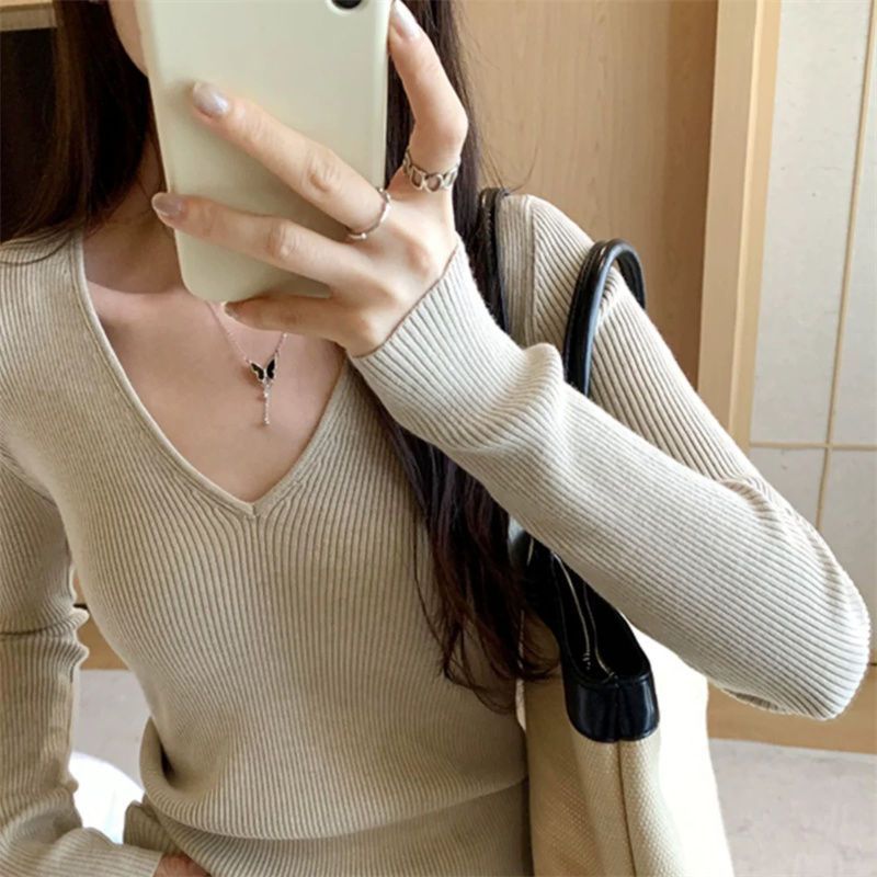 부드러운 스타일 솔리드 컬러 V 넥 스웨터 여성의 2024 가을 및 겨울 새로운 슬림 핏 슬리밍 내부 긴팔베이스 레이어 스웨터스토어 가기