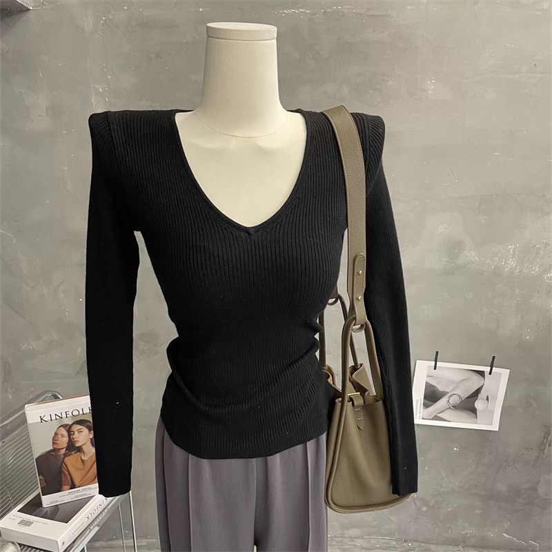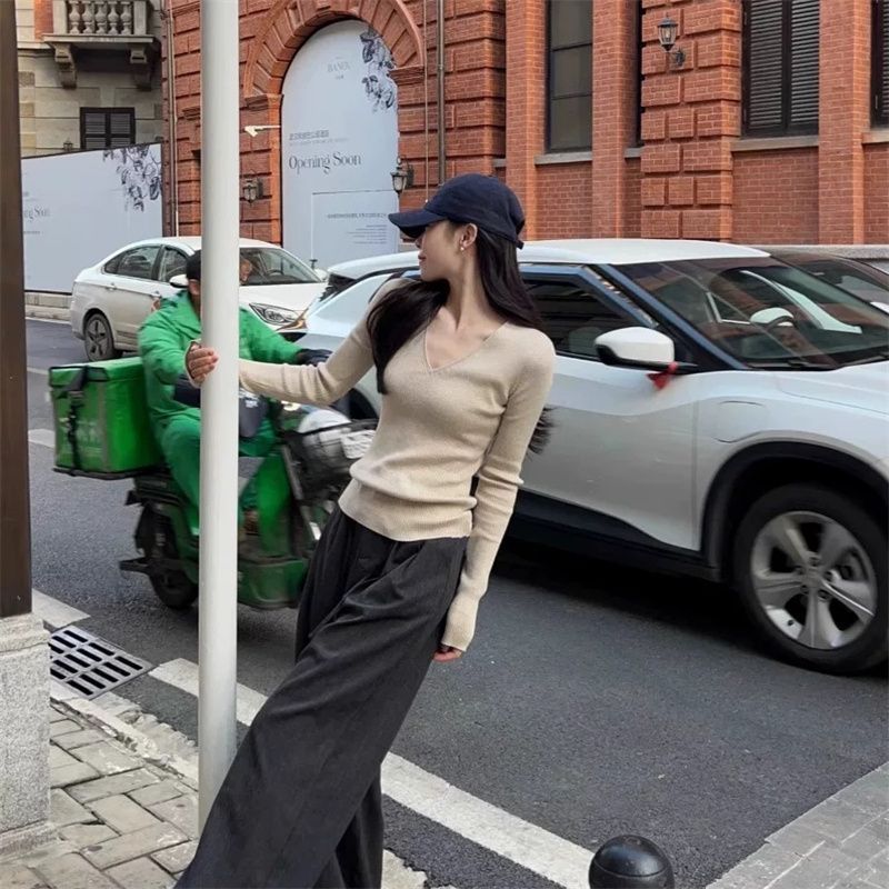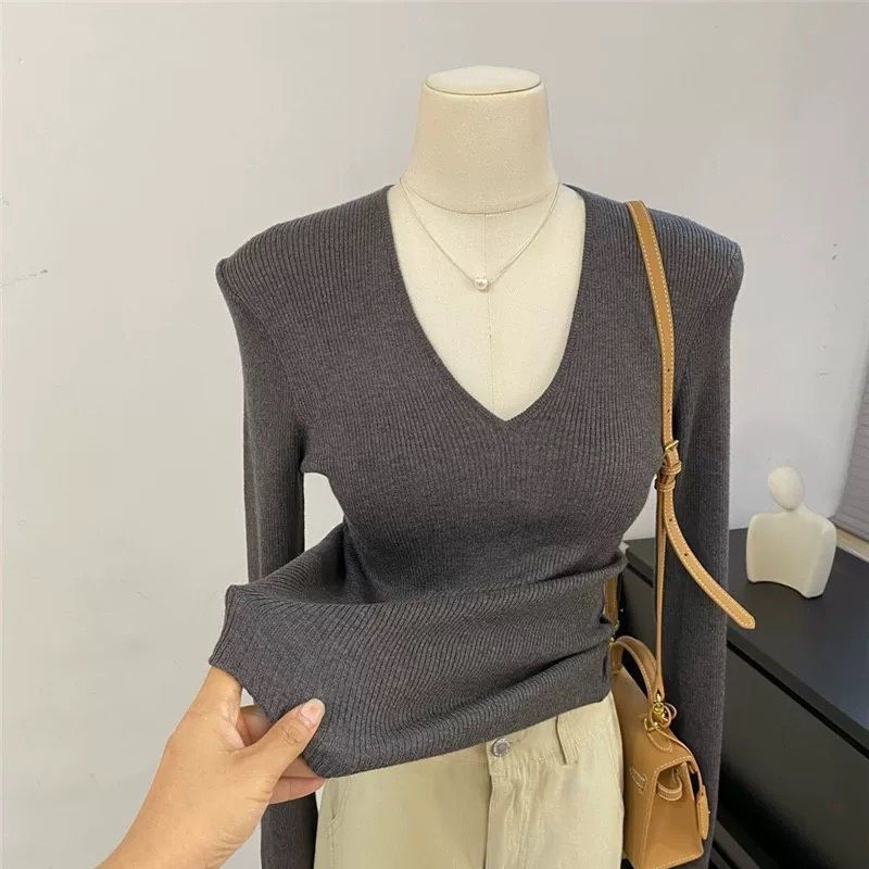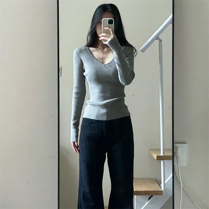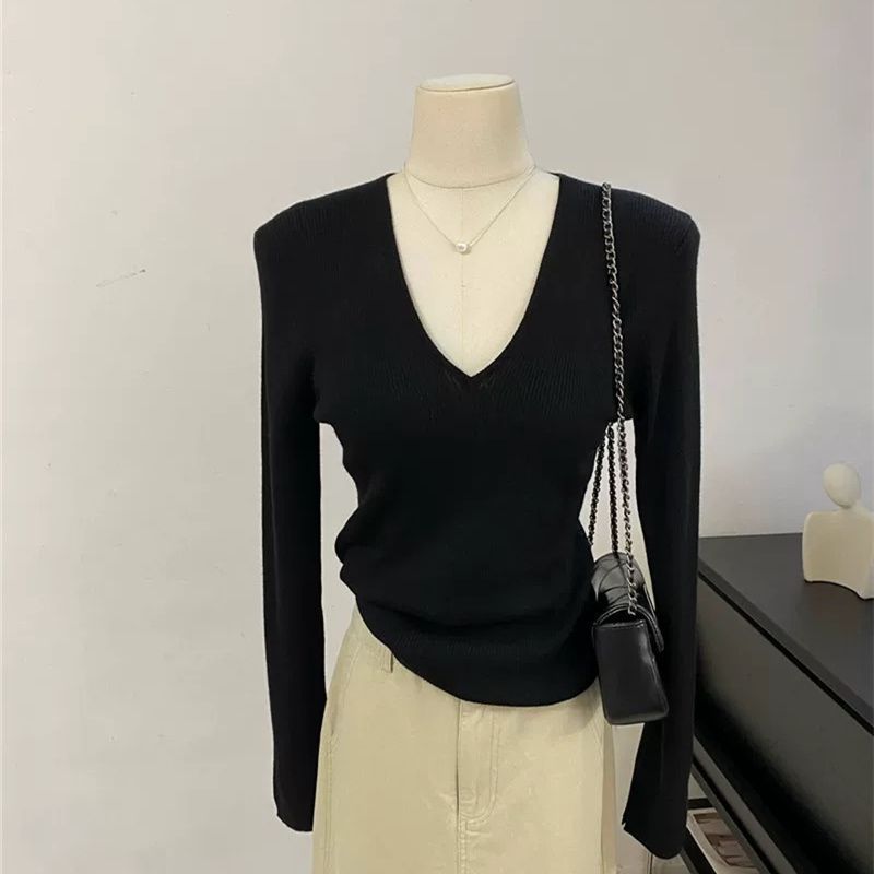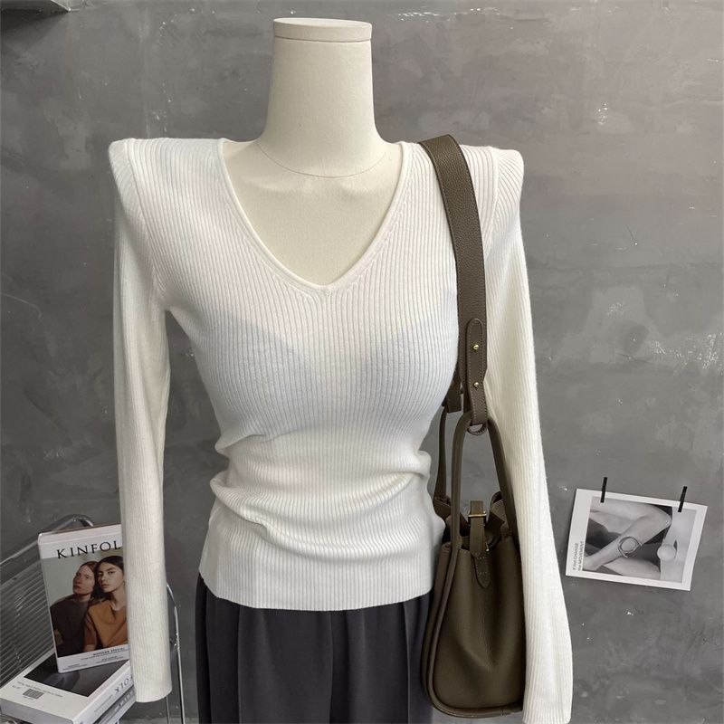 부드러운 스타일 솔리드 컬러 V 넥 스웨터 여성의 2024 가을 및 겨울 새로운 슬림 핏 슬리밍 내부 긴팔베이스 레이어 스웨터스토어 가기