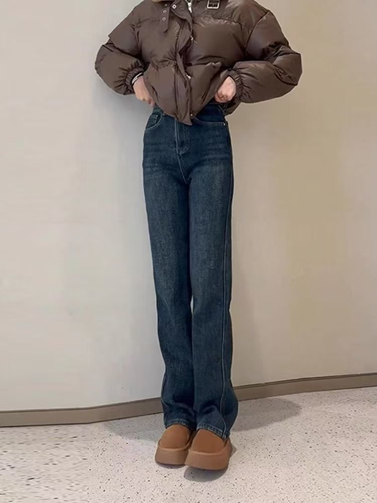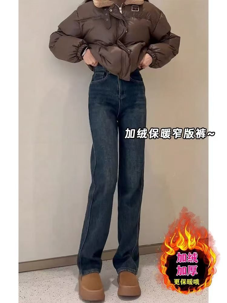 Shanli Dadi 기모 두꺼운 좁은 컷 스트레이트 청바지 여성의 겨울 새로운 배 모양의 피규어 플러스 사이즈 작은 높이